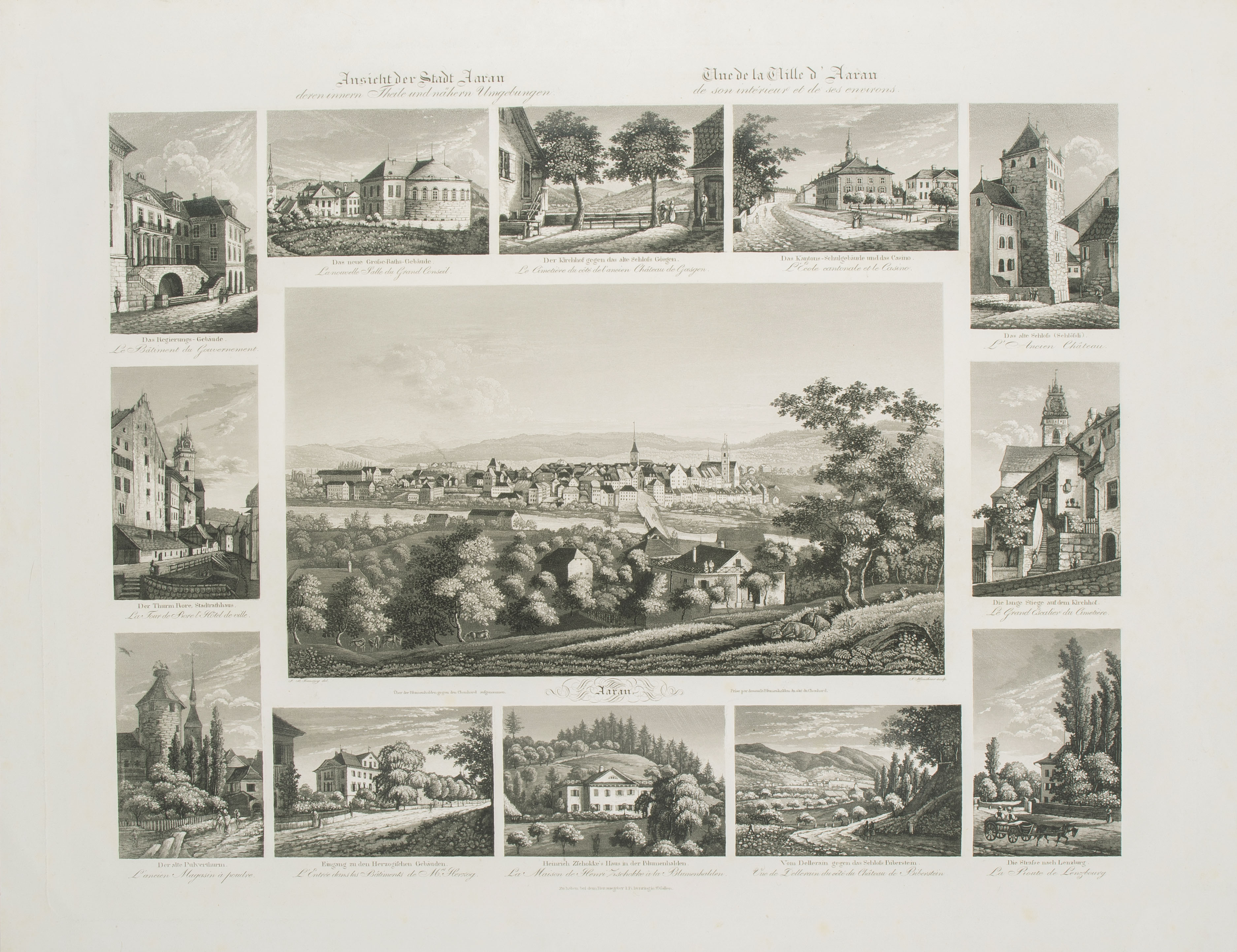 "Ansicht der Stadt Aarau deren innern Theile und nähern Umgebungen". Zentrale Ansicht "Über den Blumenhalden gegen den Chonhard aufgenommen" umrahmt von 12 Detailansichten der Stadt und näheren Umgebung. Aquatinta von Joh. Hausheer, 1832/33. 37x49 cm. - Minimal fleckig.