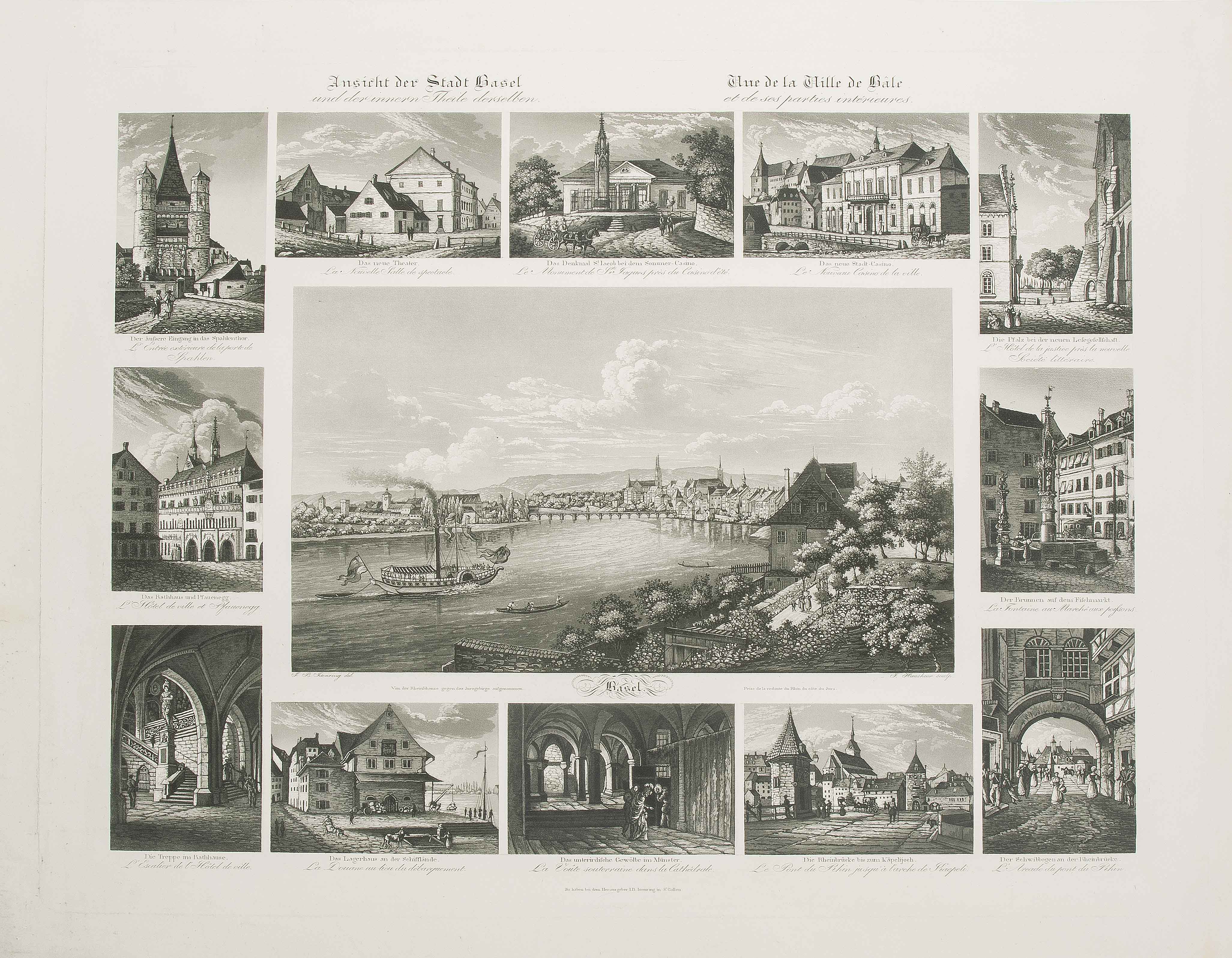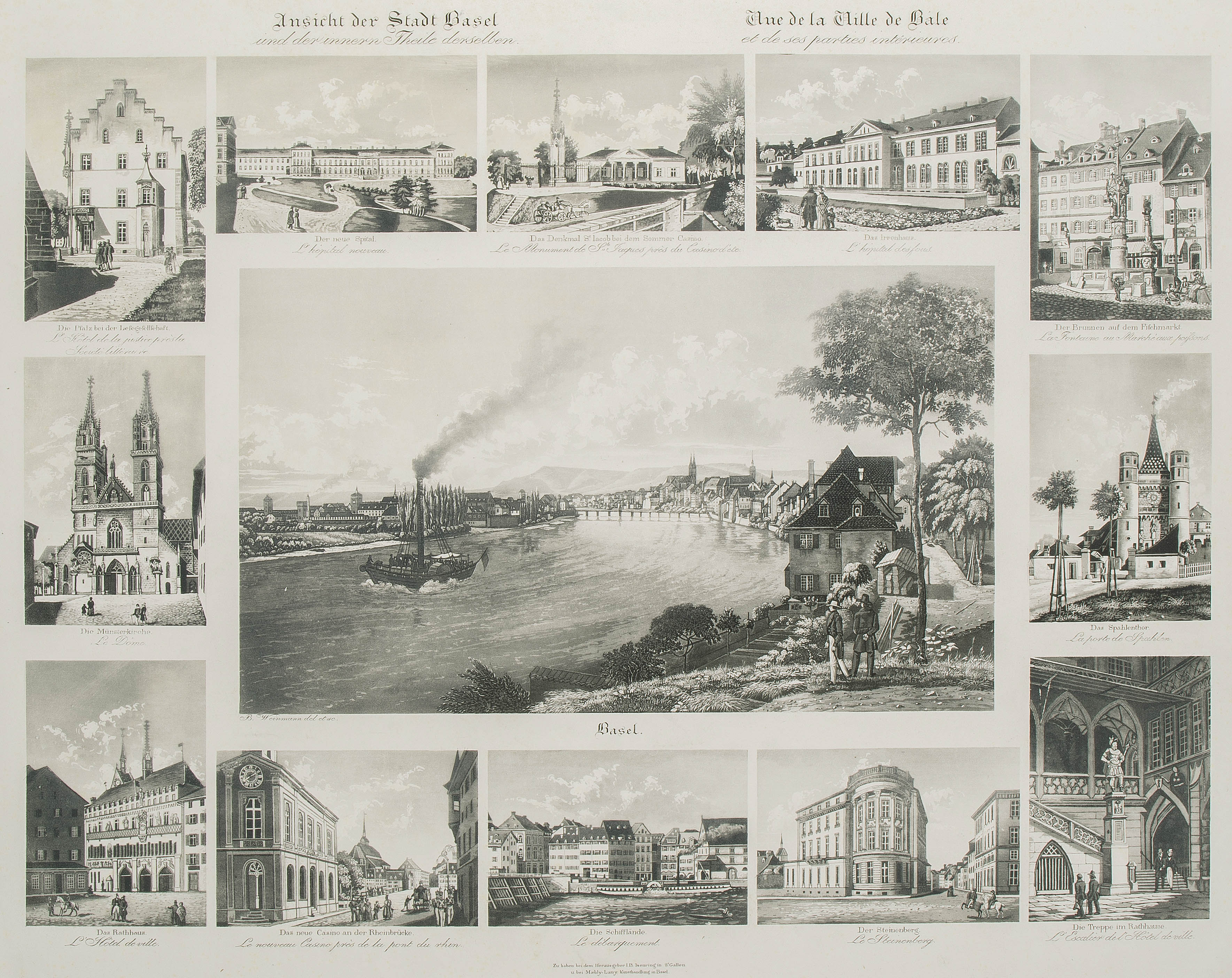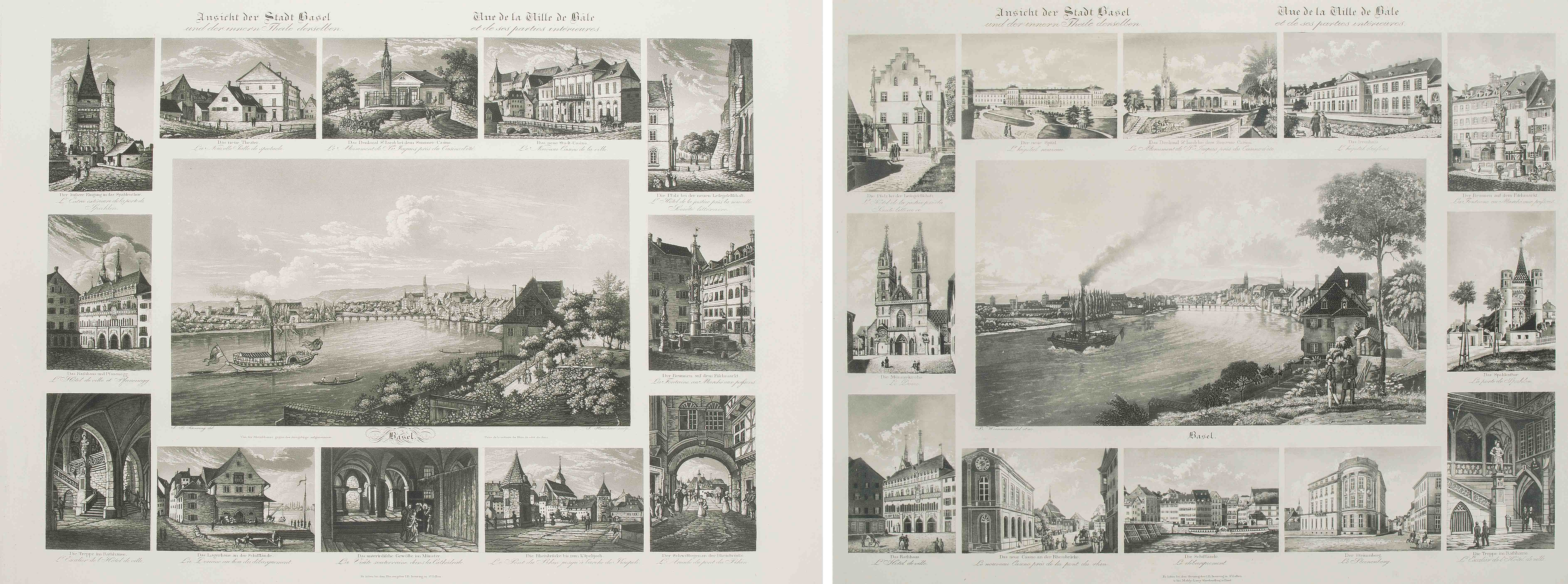 "Ansicht der Stadt Basel und deren innern Theile derselben". 2 Bll. mit ident., zentralen Ansichten "Von der Rheinschanze gegen das Juragebirge aufgenommen" umrahmt von 12 variierenden Detailansichten der Stadt und Umgebung. Aquatintas von Joh. Hausheer und B. Weinmann, 1832/33 u. 1842/43. Je ca. 36,5x50 cm. - Das 1. Blatt mit gebrochenem, hinterlegtem Plattenrand links, das 2. Blatt auf die Platttenkante beschnitten und im Rand teilweise etwas dünnstellig.