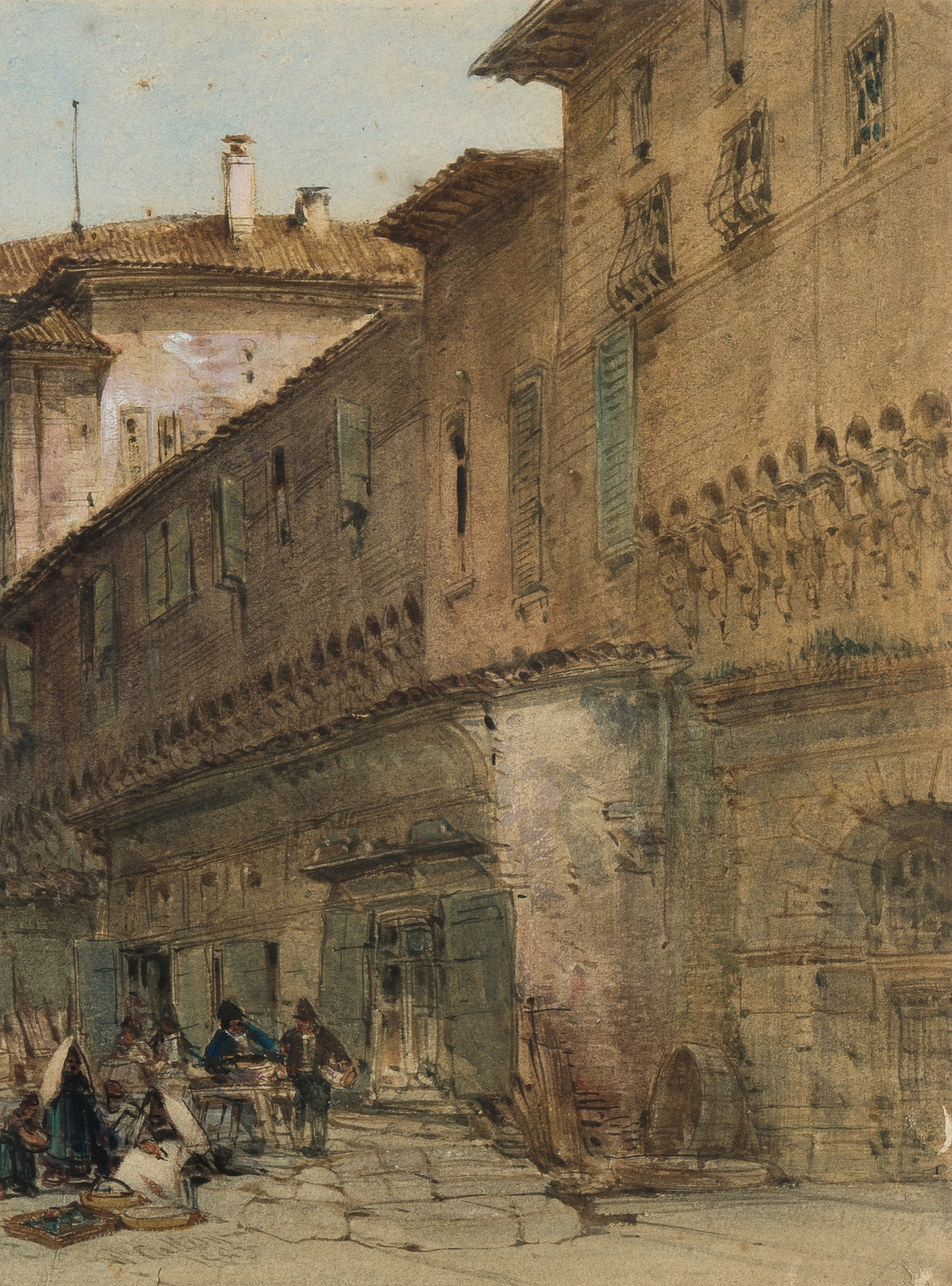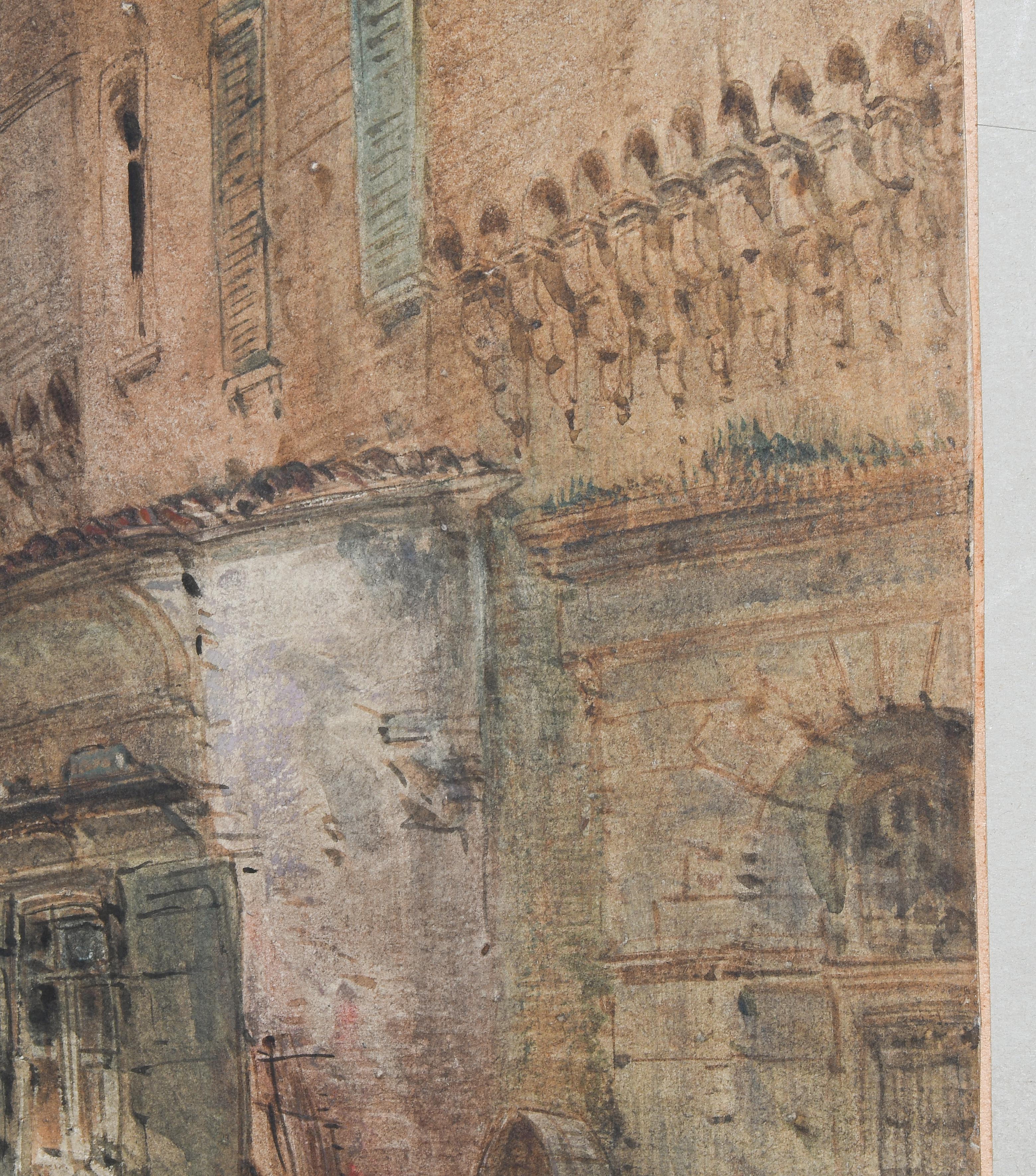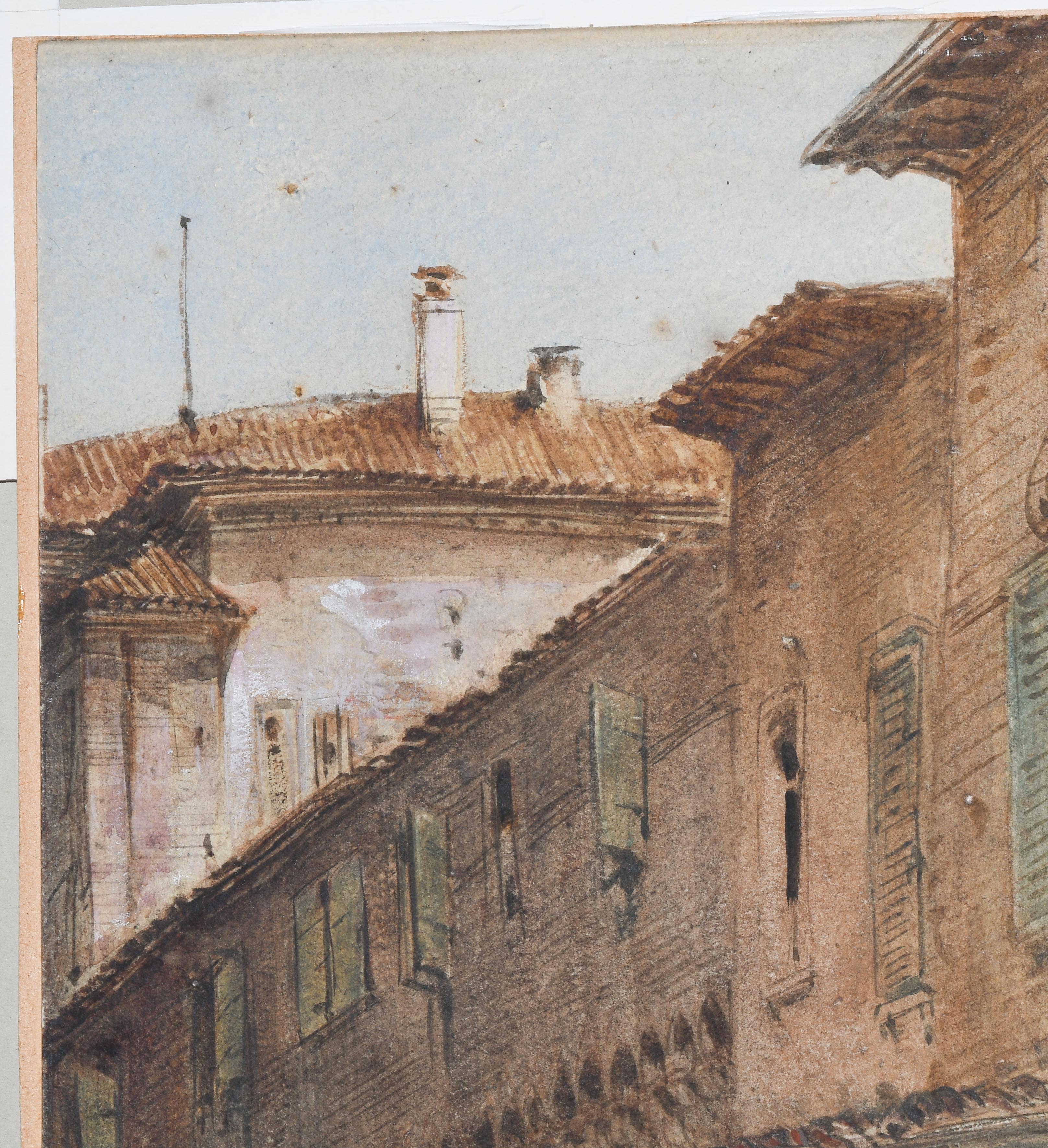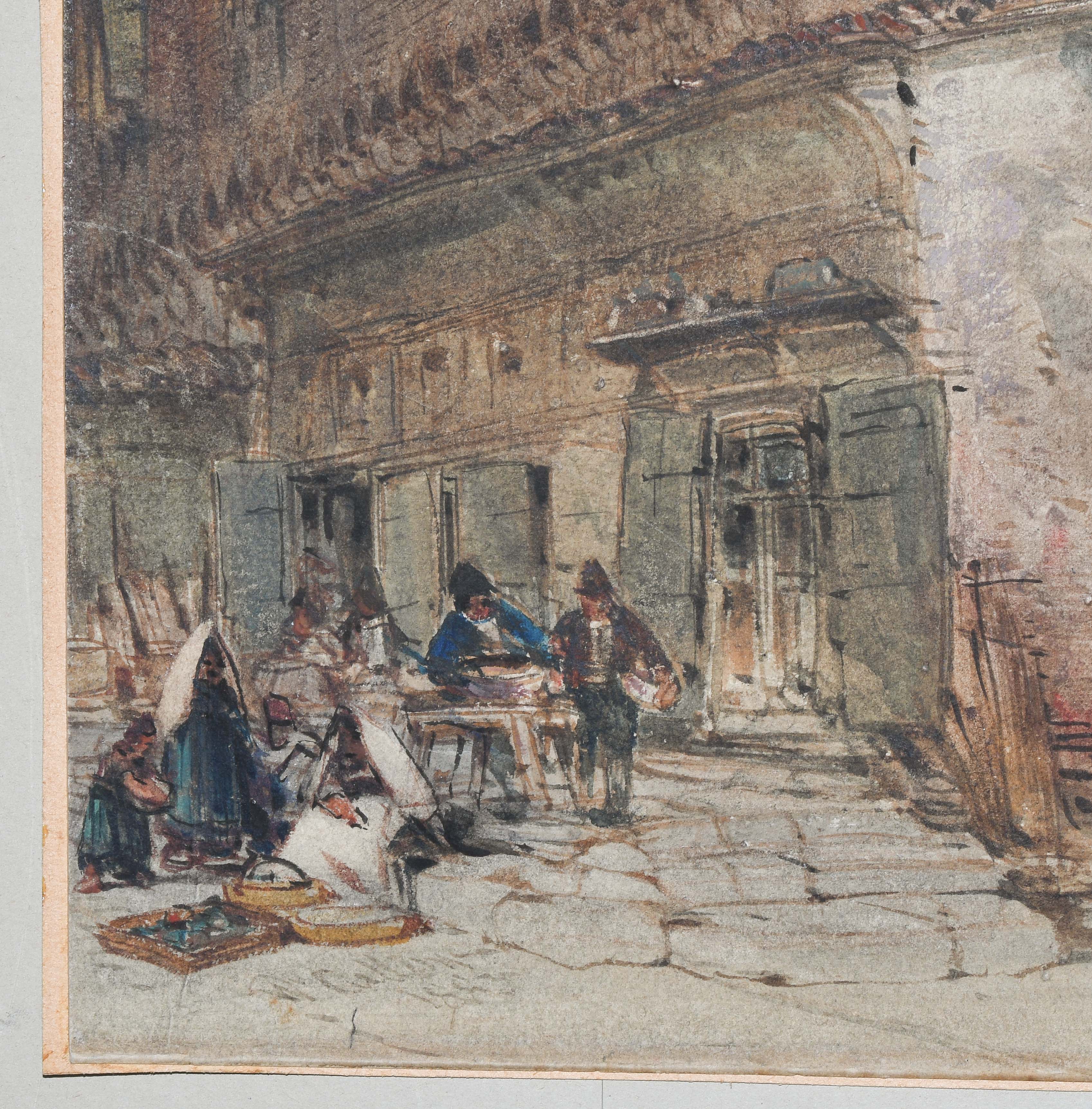 Strassenpartie in Bologna. Aquarell, voll signiert und 1883 datiert u. l. 38,5x29 cm. Gerahmt. - Etwas berieben und mit kleineren Randdefekten u. r.