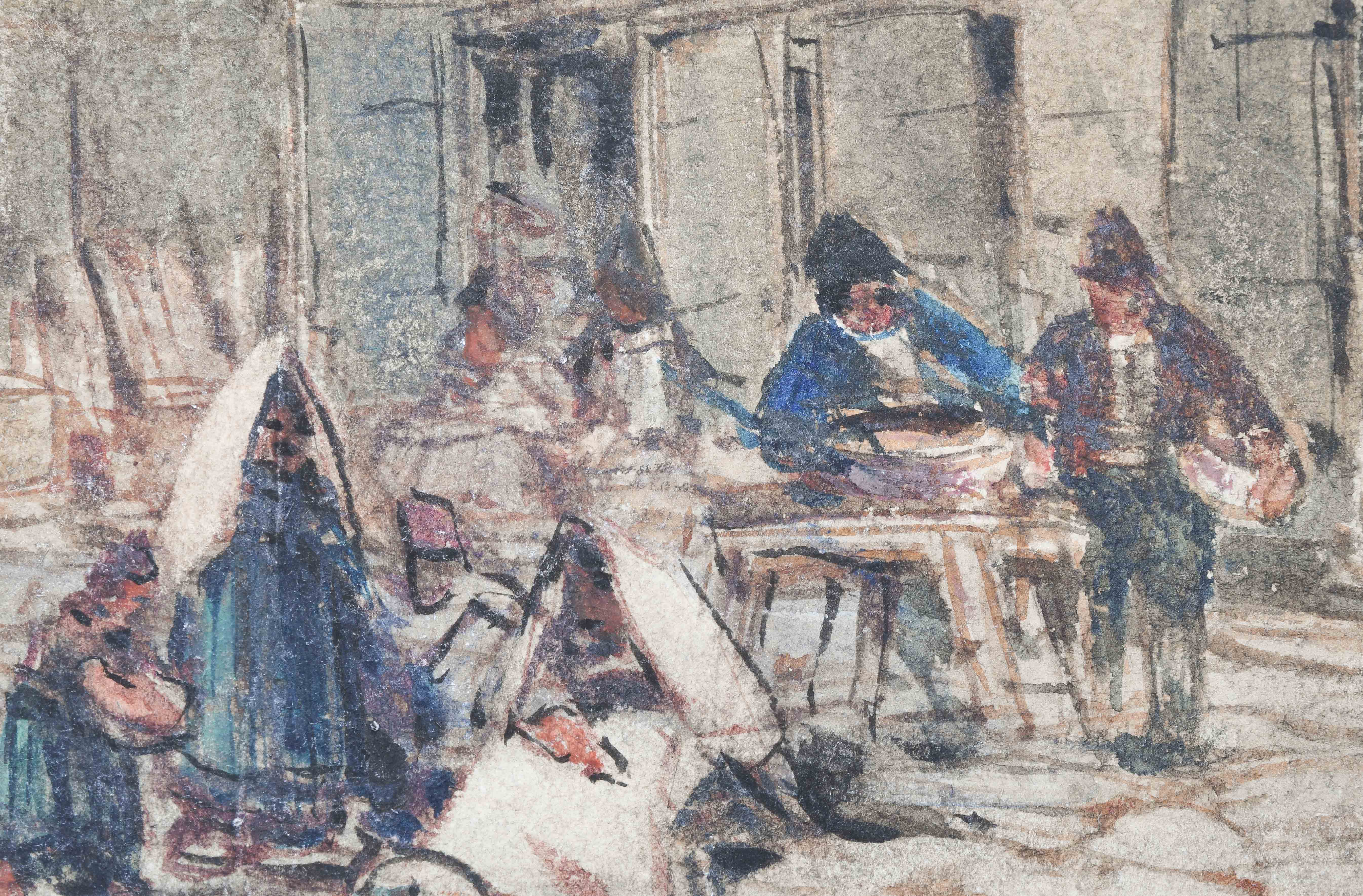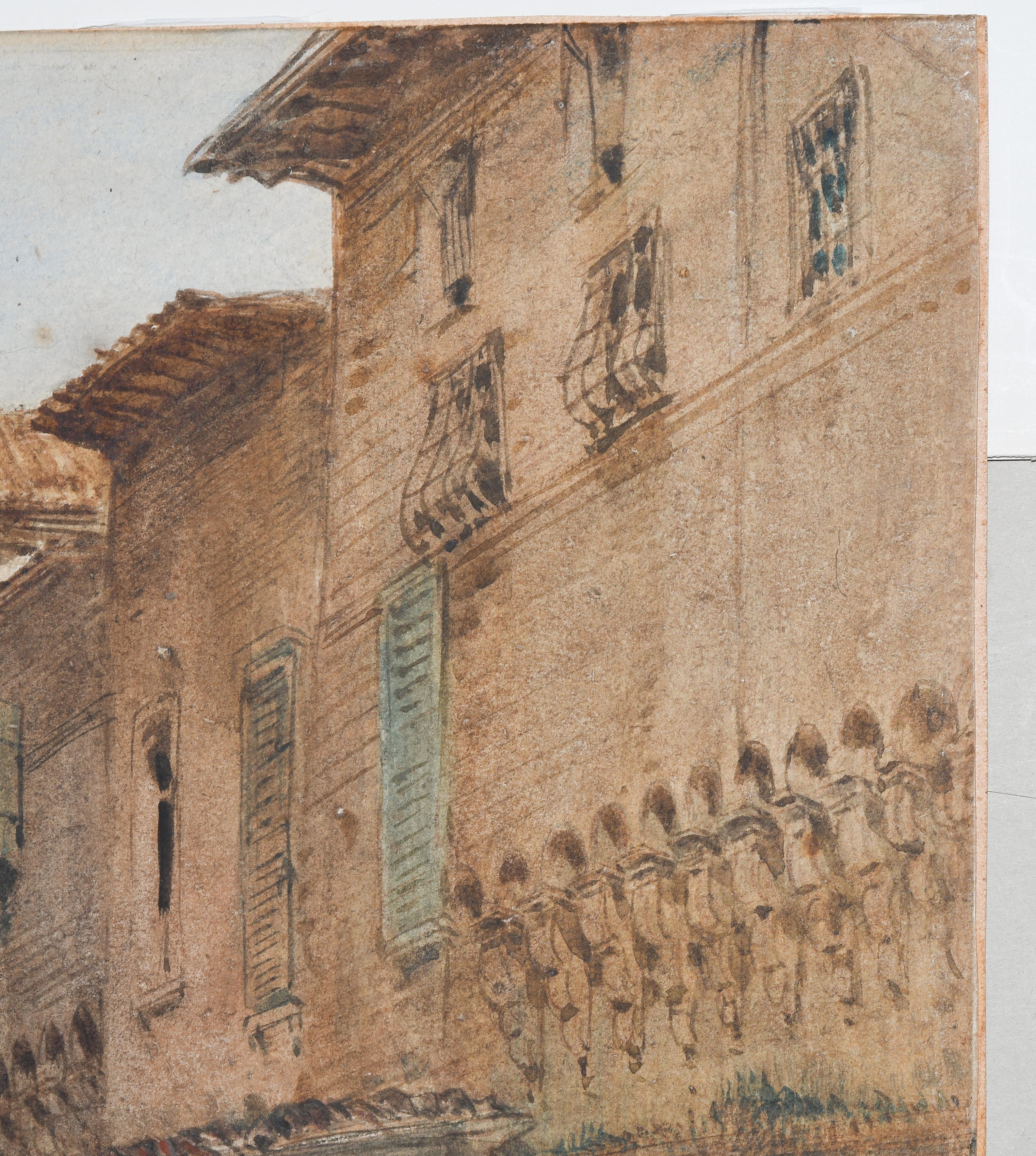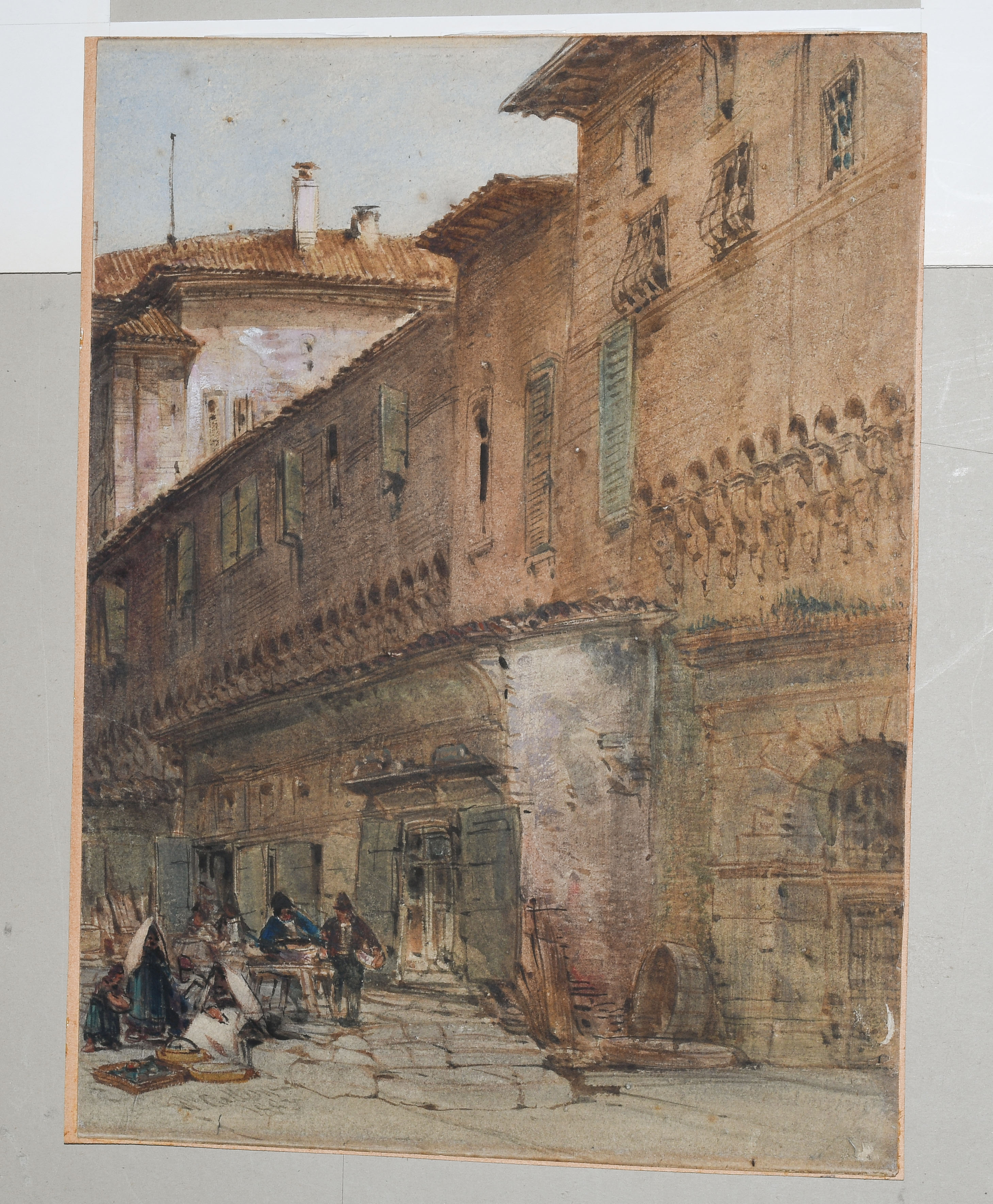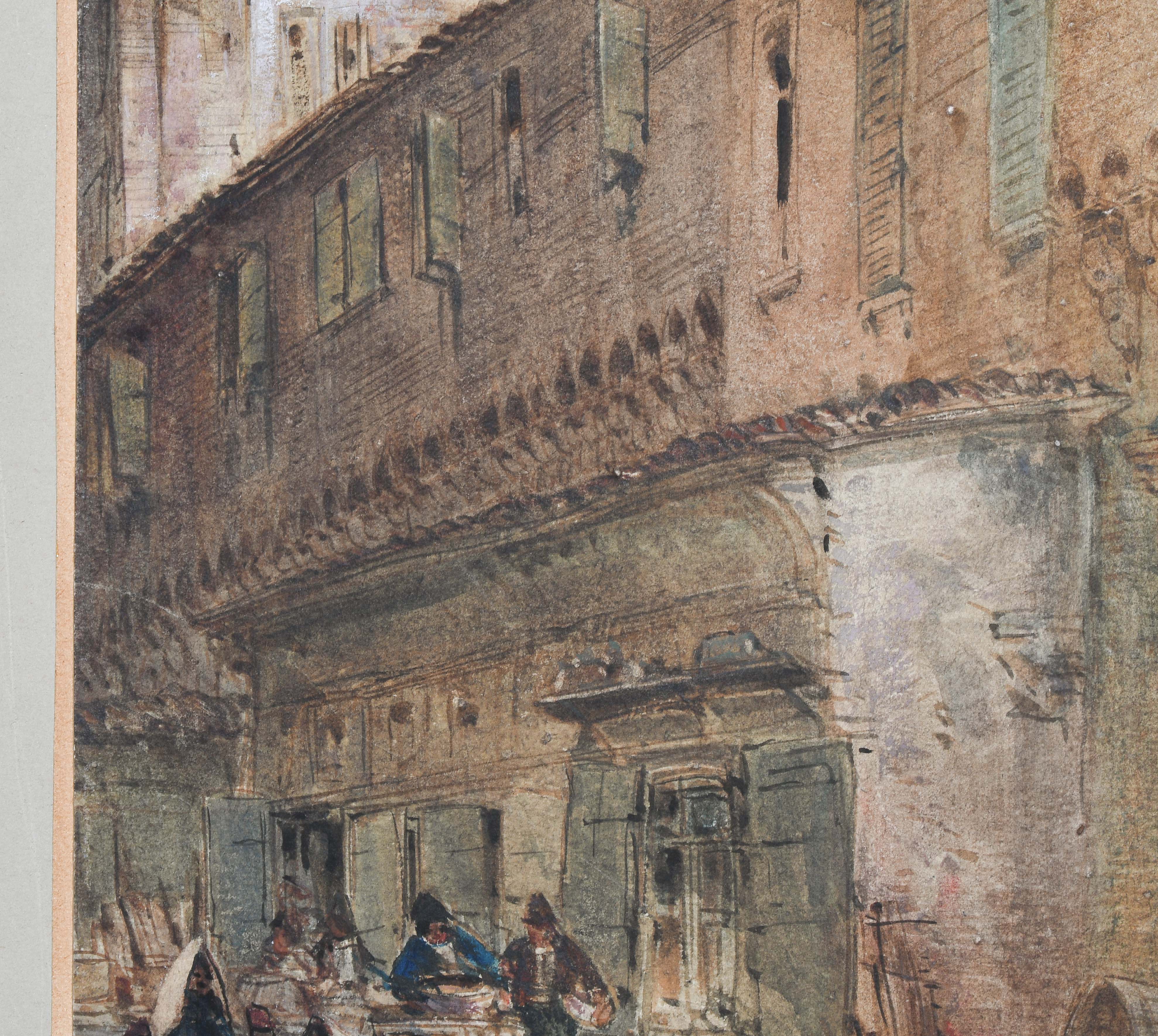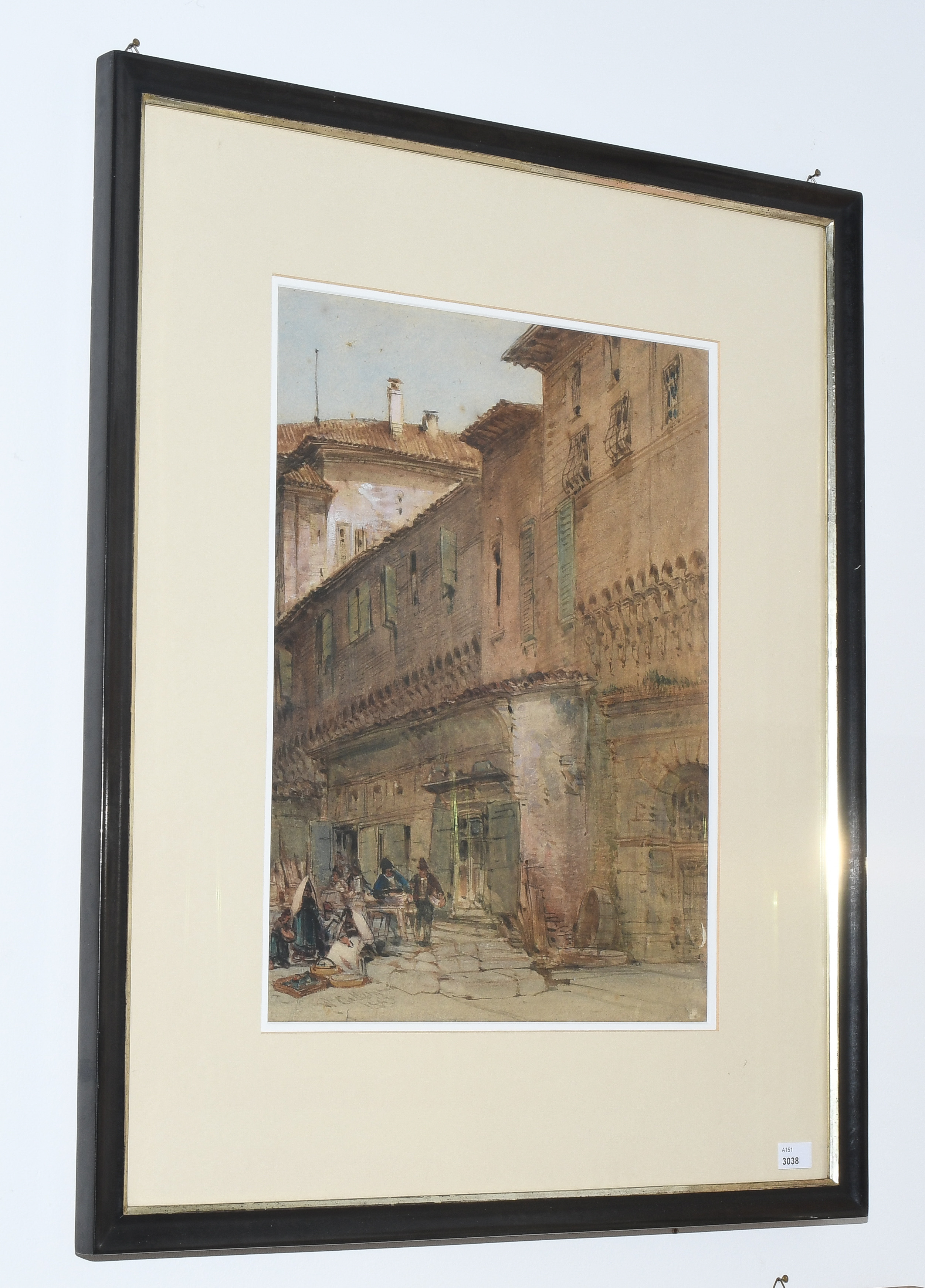 Strassenpartie in Bologna. Aquarell, voll signiert und 1883 datiert u. l. 38,5x29 cm. Gerahmt. - Etwas berieben und mit kleineren Randdefekten u. r.