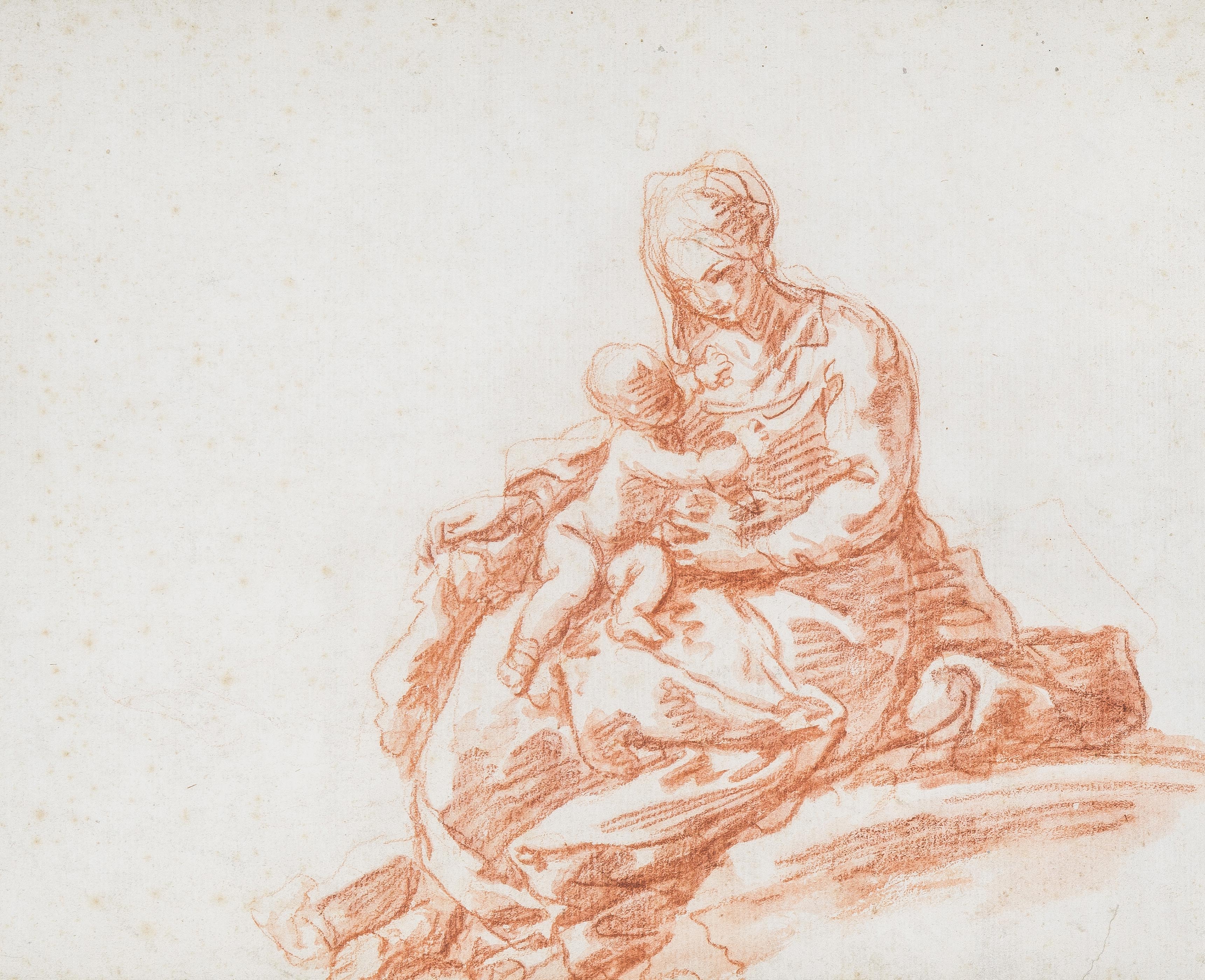 Maria mit Kind (verso: Heilige Familie mit dem Johannesknaben und der Vision des Kreuzes). Rötelzeichnung. 26,5x33,5 (Blatt). Gerahmt.