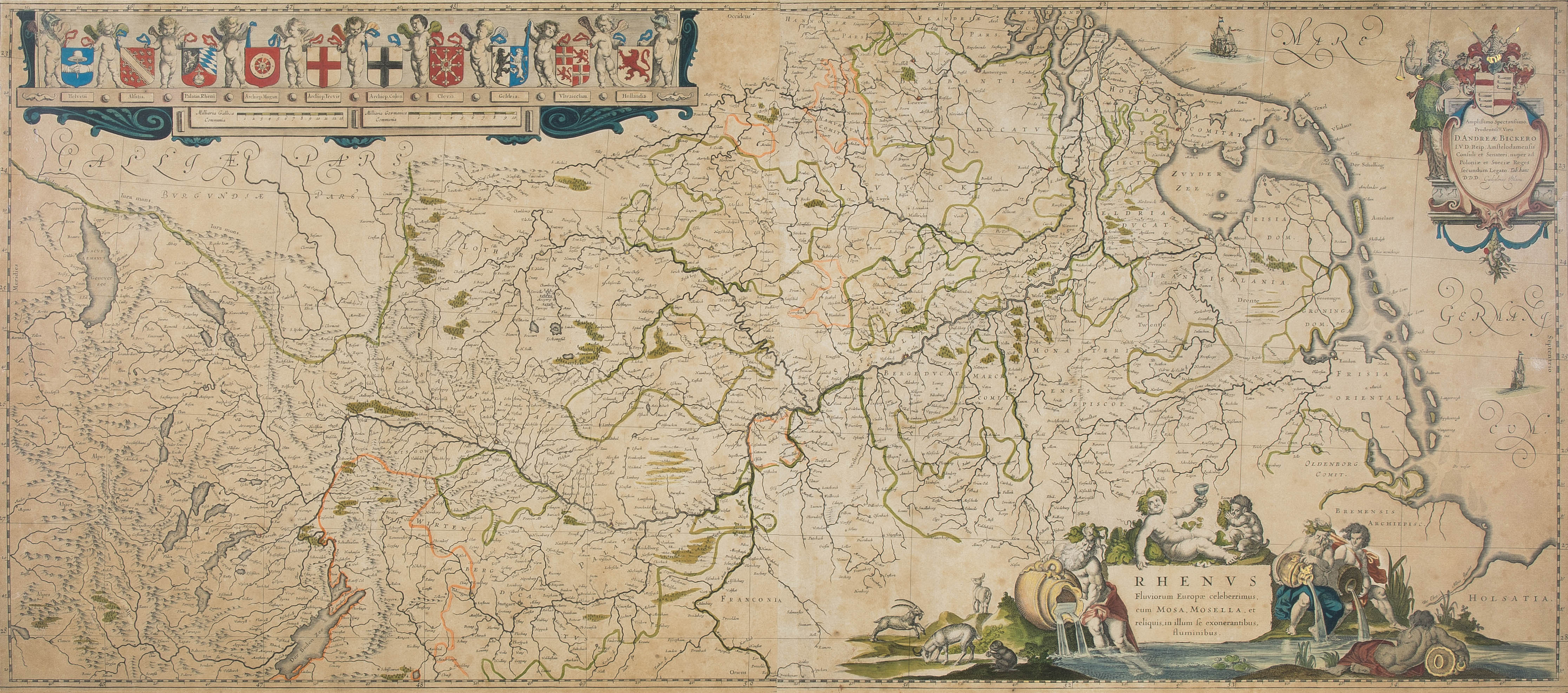 "RHENVS Eluviorum Europae celeberrimus...". Grenzkolorierter Kupferstich, von 2 Platten gedr. u. hg. von Wilh. Blaeu (1571-1638) um 1635. Mit grosser allegor. Titelkartusche u. r., einem Wappenfries mit den Wappen der angrenzenden Länder (Schweiz mit zwei um den Gesslerhut vereinigten Händen) o. l. und ornametaler Dedikationskartusche o. r. (alle ausgemalt). 41,5x96,5 cm. - Etwas gebräunt, sonst gut erhalten.