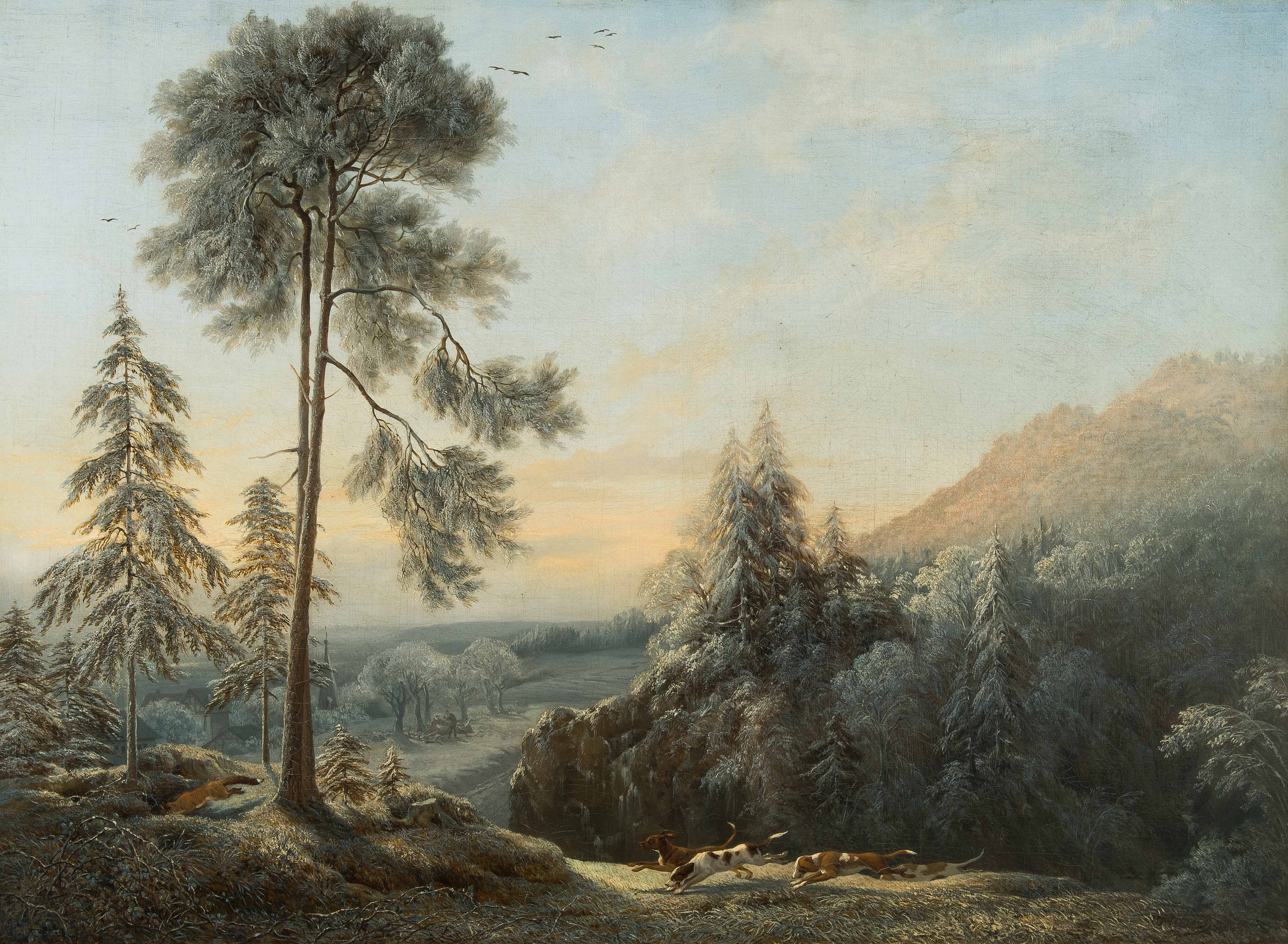Winterliche Fuchsjagd, 1846. Öl auf Leinwand. Unten rechts signiert und datiert. 52x72,5 cm.