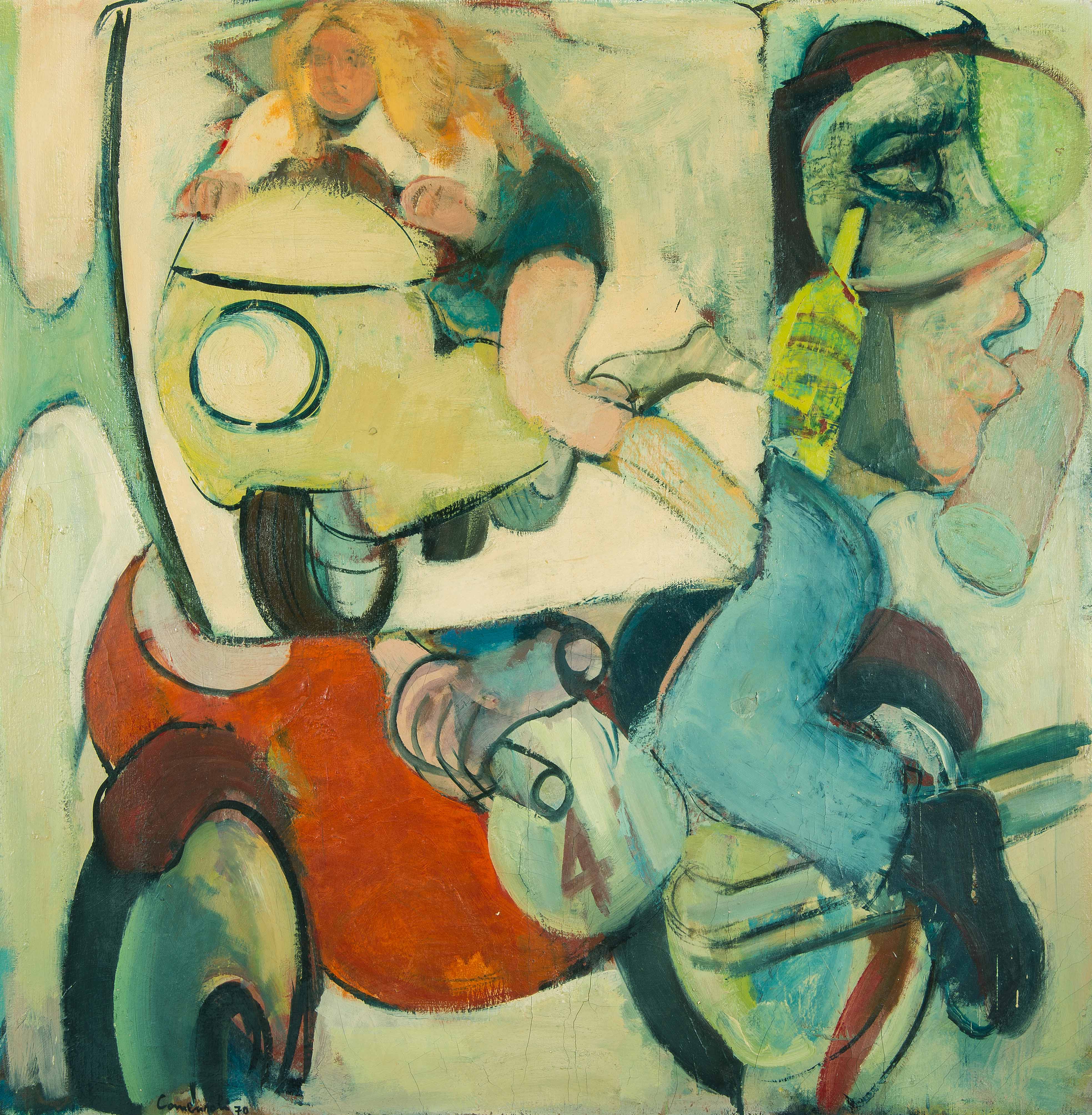 Motorradausfahrt, 1970. Öl auf Leinwand. Unten links signiert und datiert. 110x110 cm. - Craquelé. Pigmentauftrag im unteren Bildbereich mittig, entlang der vertikalen Keilrahmenverstrebung, gebrochen. Im rechten Bildteil retuschierter Pigmentausbruch.