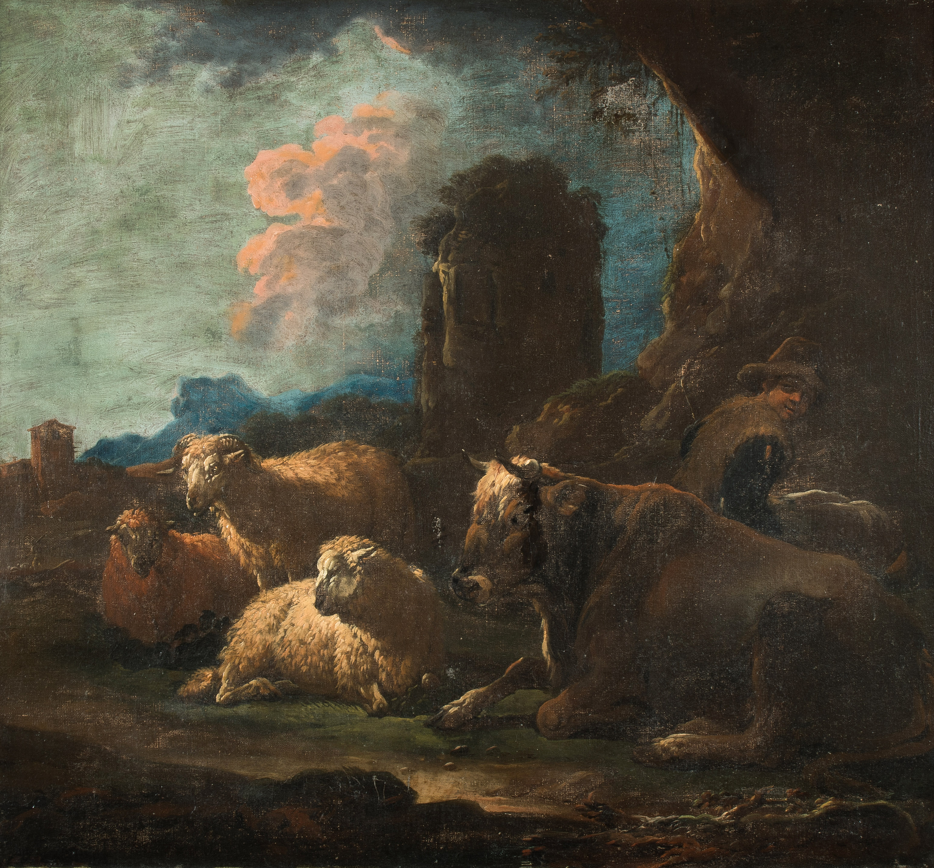 Gegenstücke: Rastender Hirte mit Viehherde. Öl auf Leinwand. Je 85x93 cm.