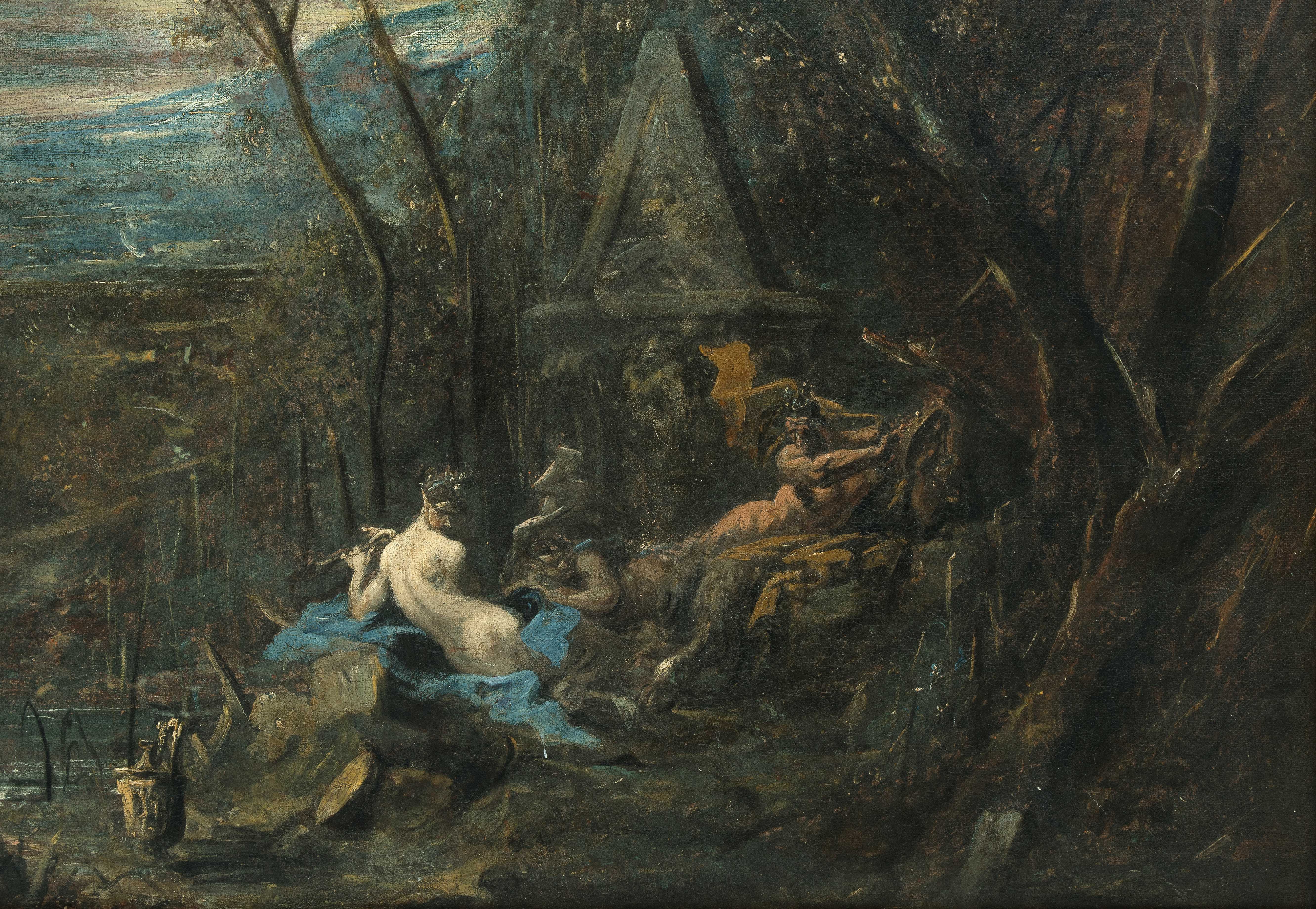 Ein Faun und eine Satyrin spielen Musik in der Nähe eines klassischen Grabmals inmitten einer Waldlandschaft, mit einer Herme in der Ferne. Öl auf Leinwand. 89x125,5 cm.