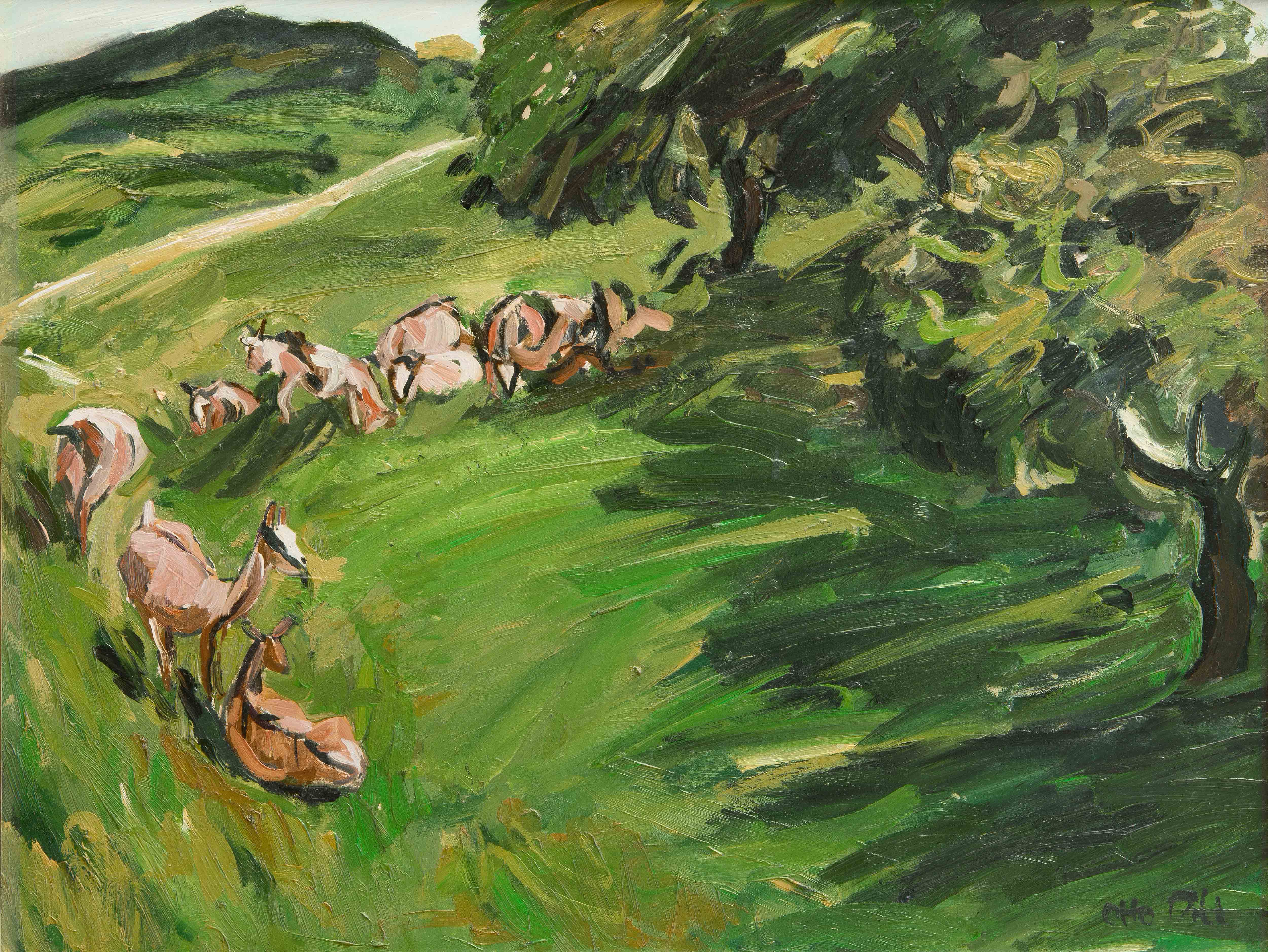 Ziegenherde. Öl auf Pavatex montiert auf Holz. Unten rechts signiert. 43x56,2 cm.