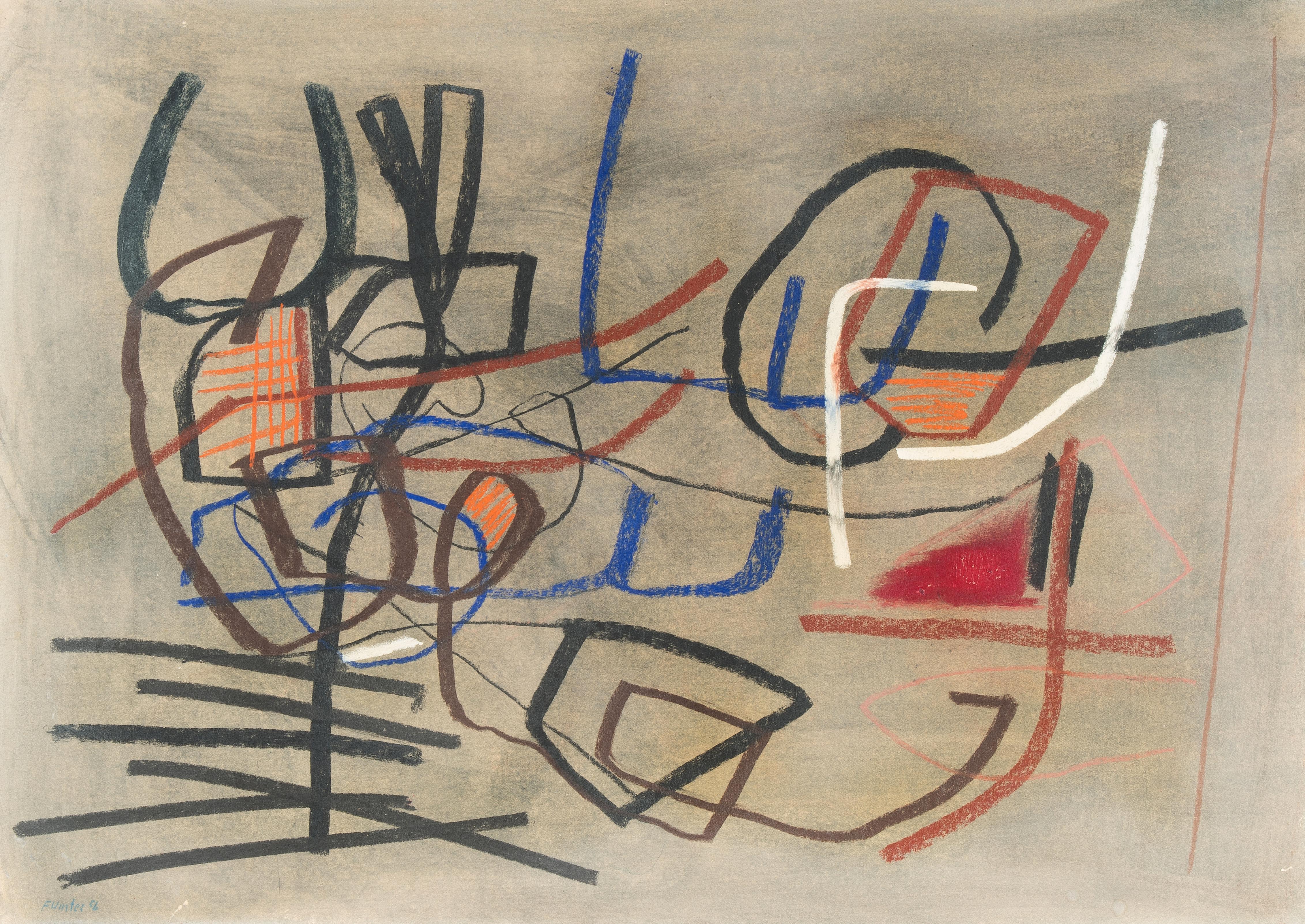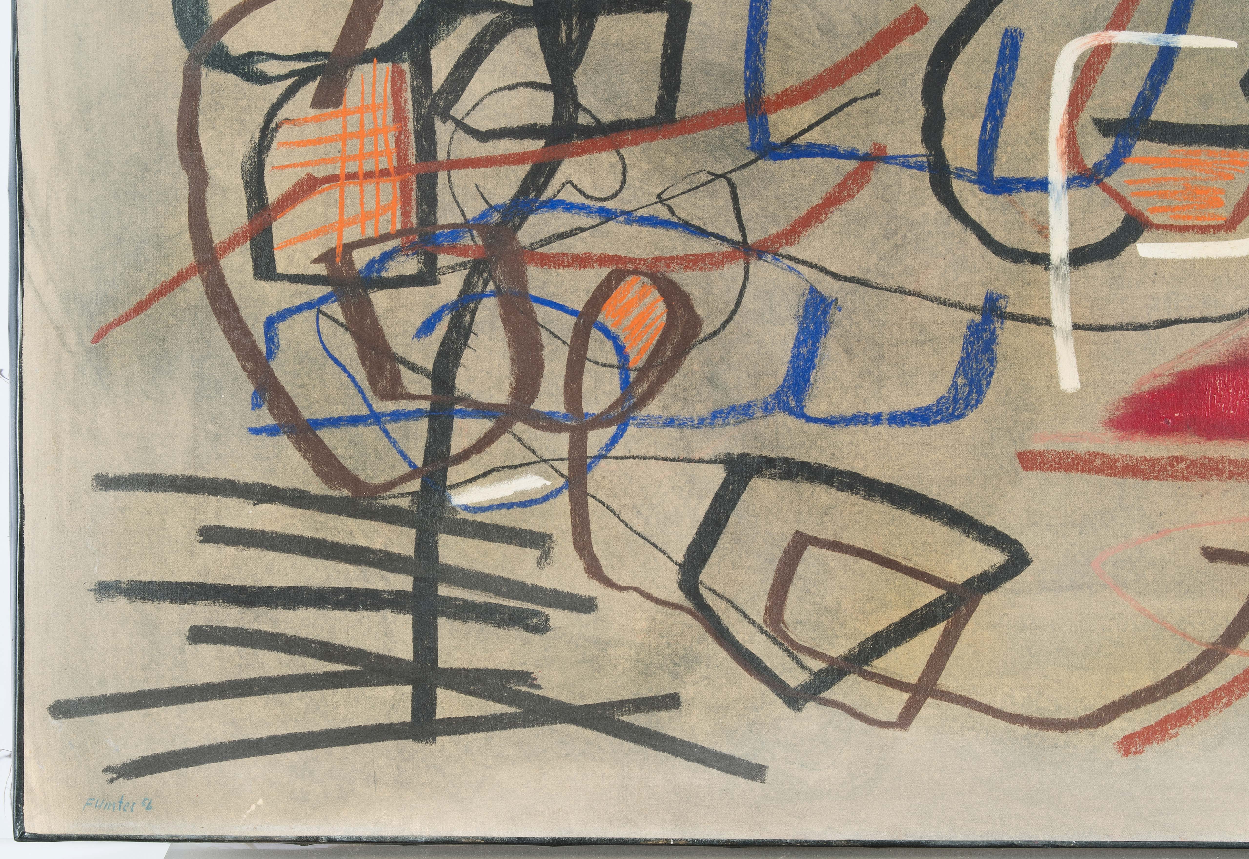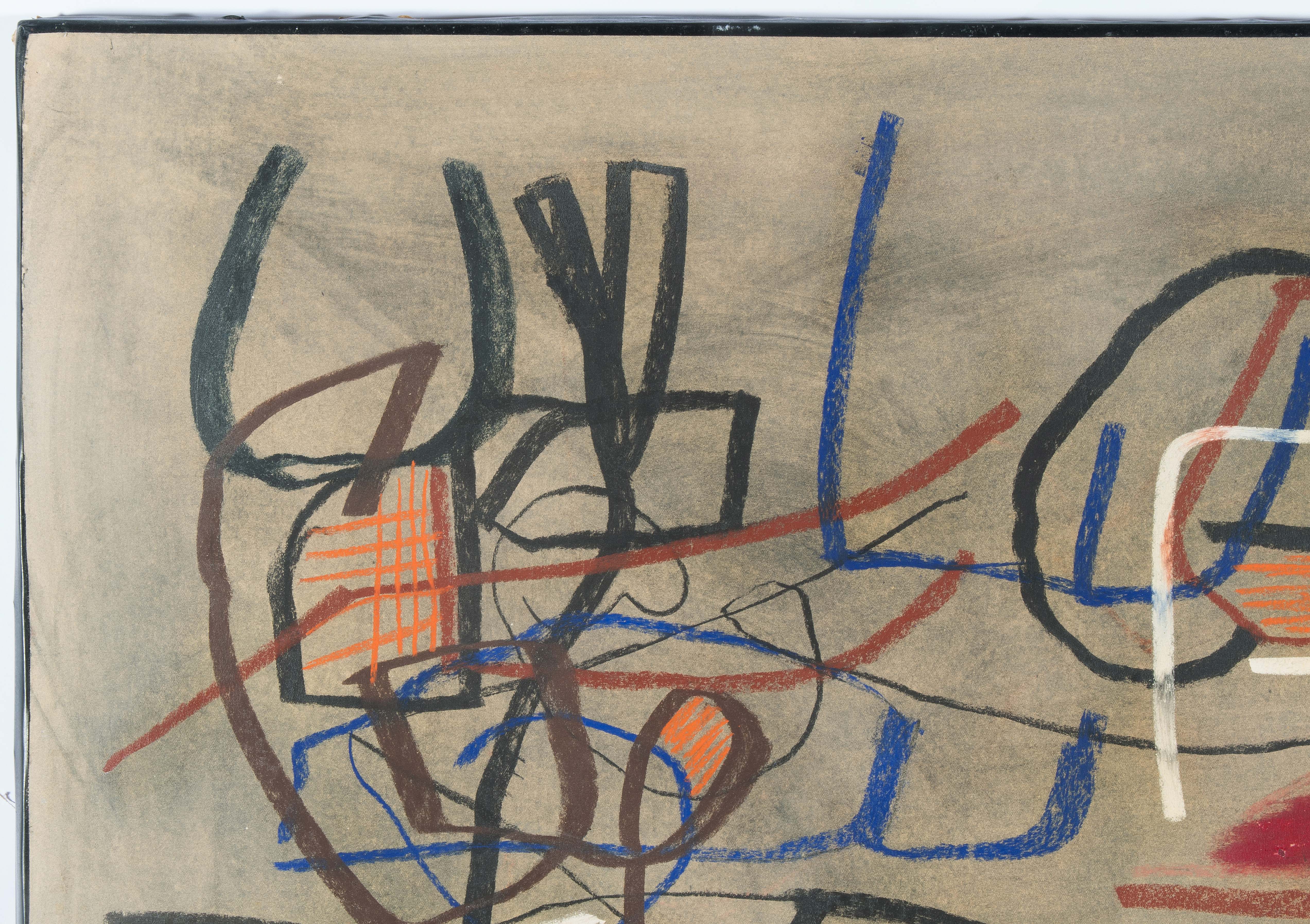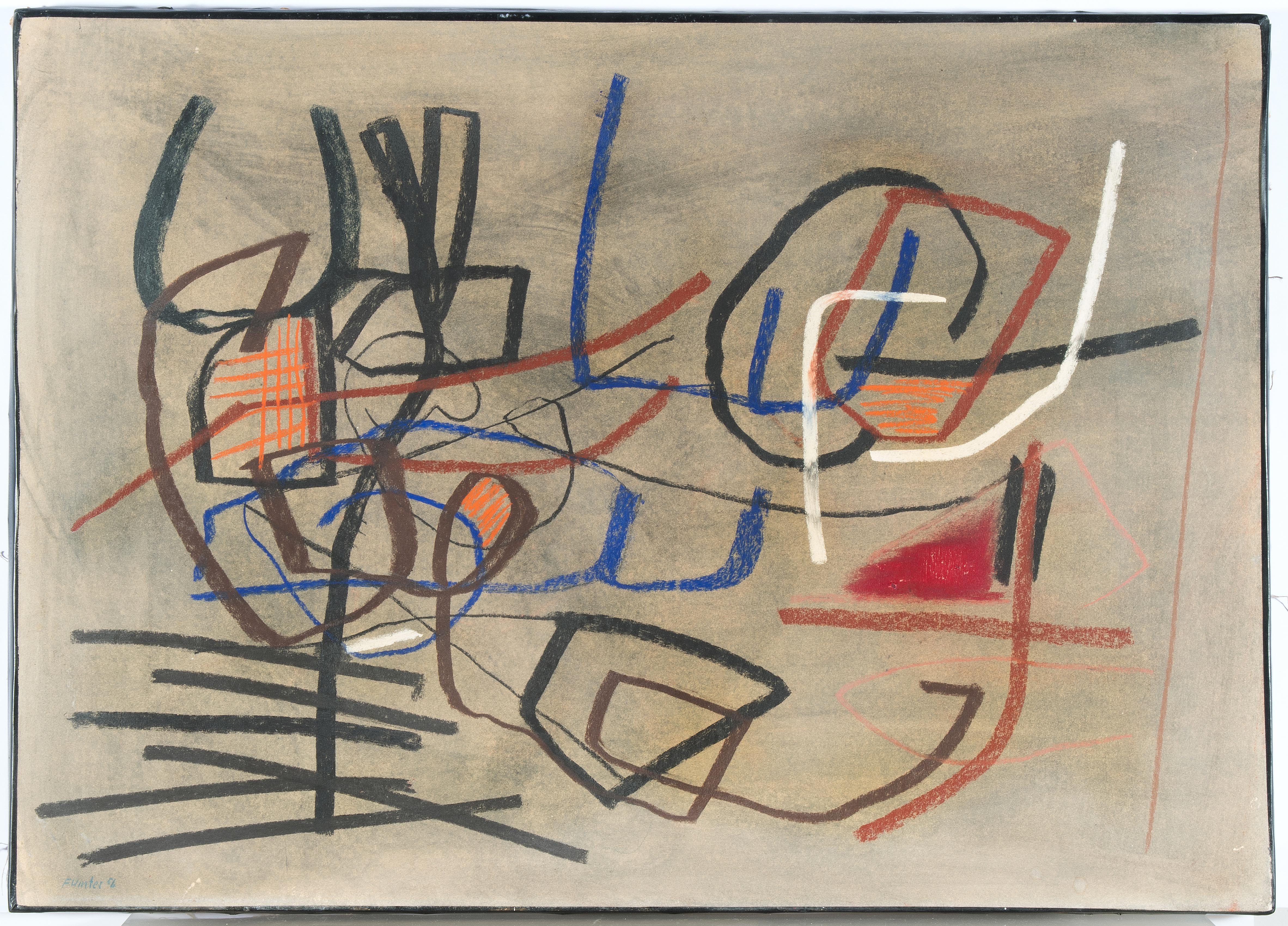 "Heiteres Linienspiel". 1956. Mischtechnik auf Karton, auf Leinwand aufgezogen. Unten links signiert und datiert. Verso auf Etikett betitelt und nummeriert 889. Etikett von La Medusa, Studio d'arte contemporanea, Roma. 50x70 cm.