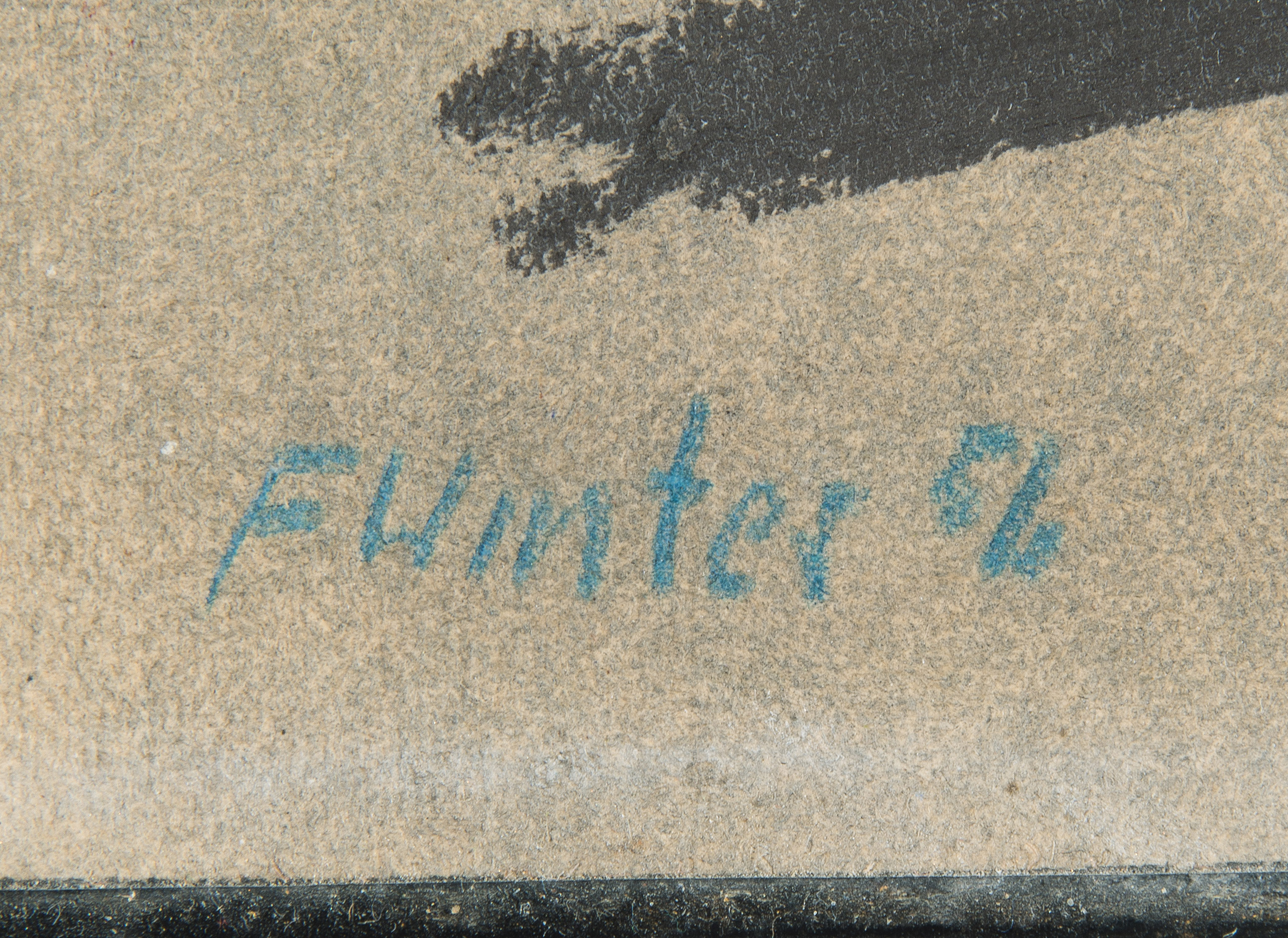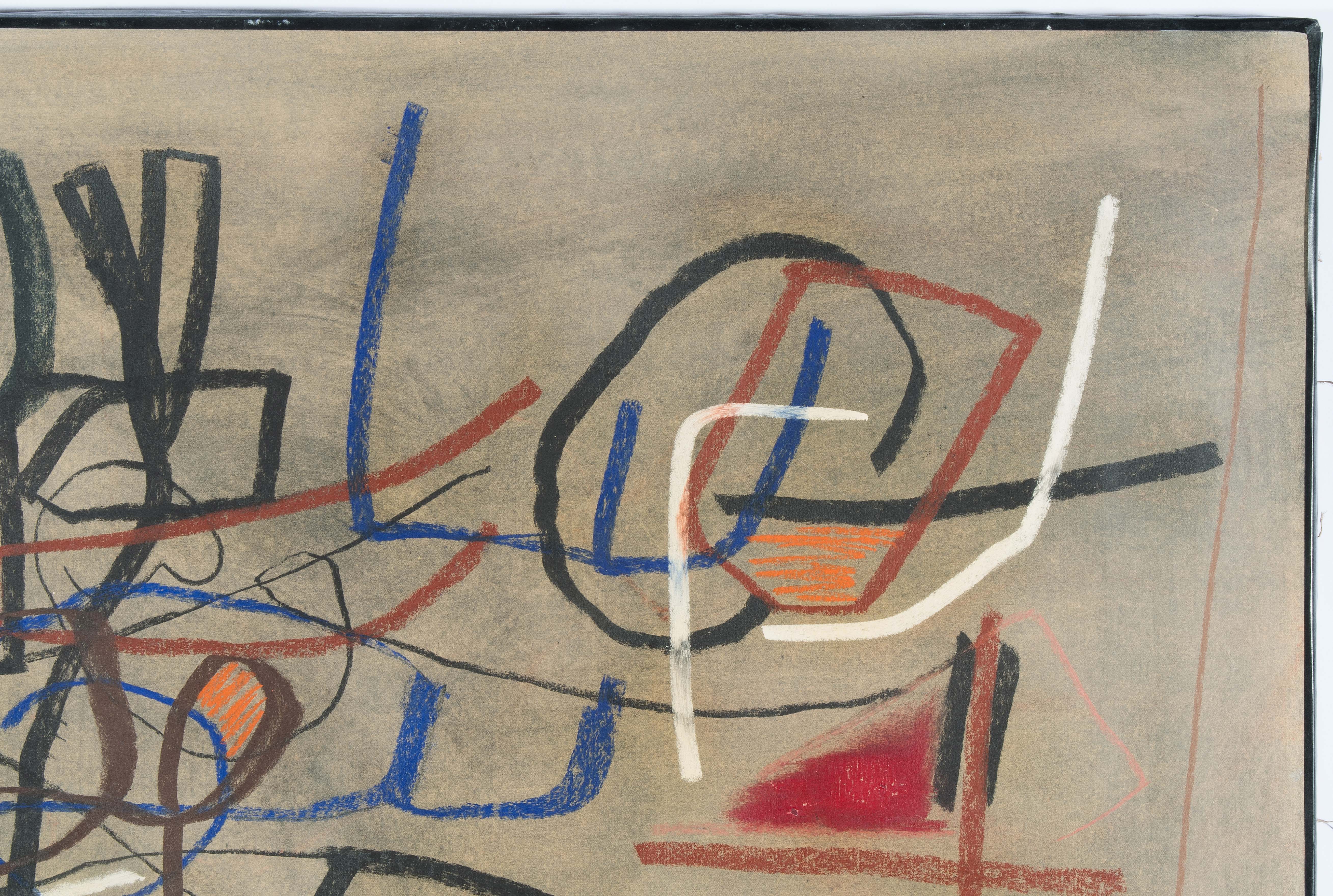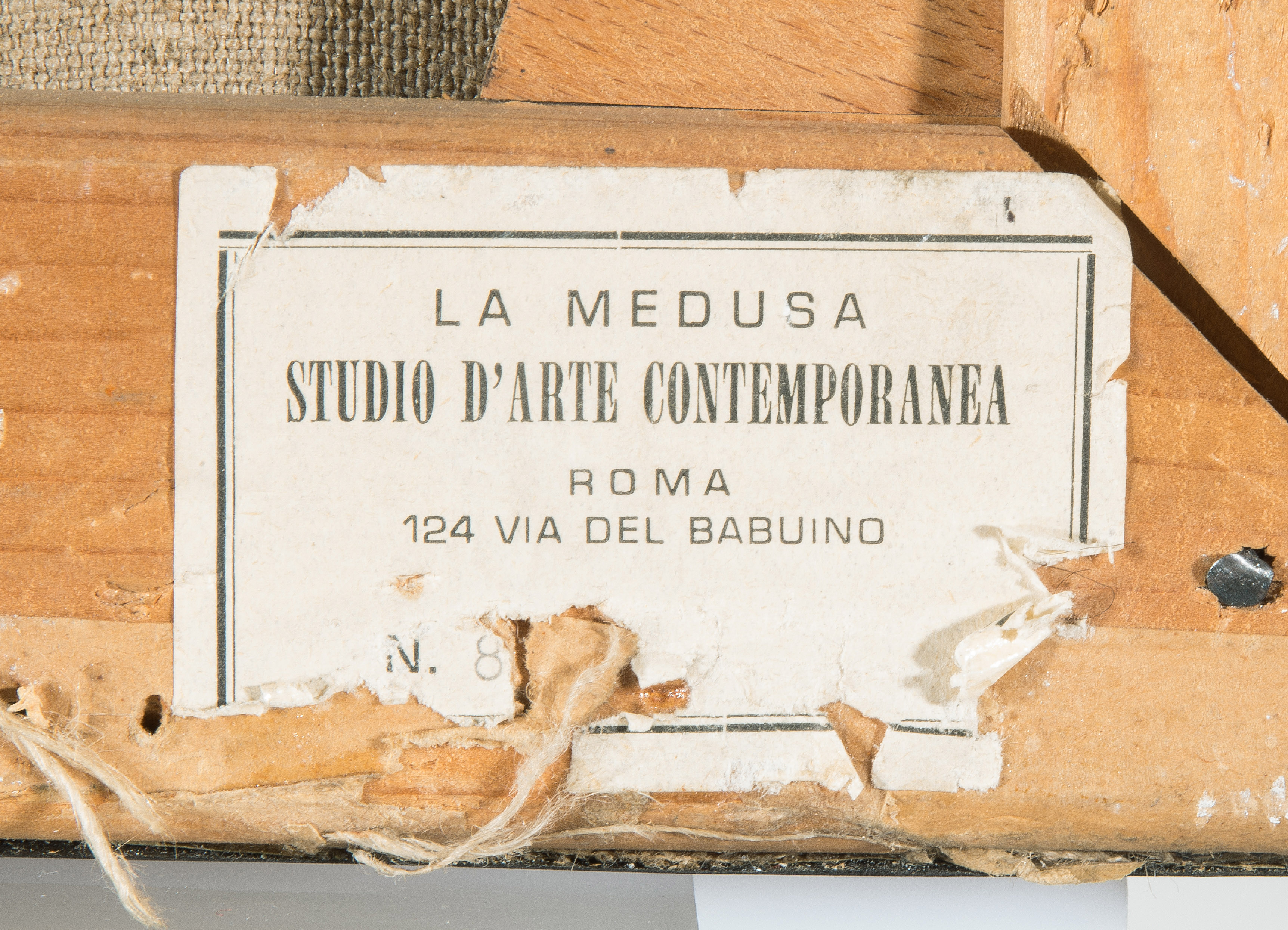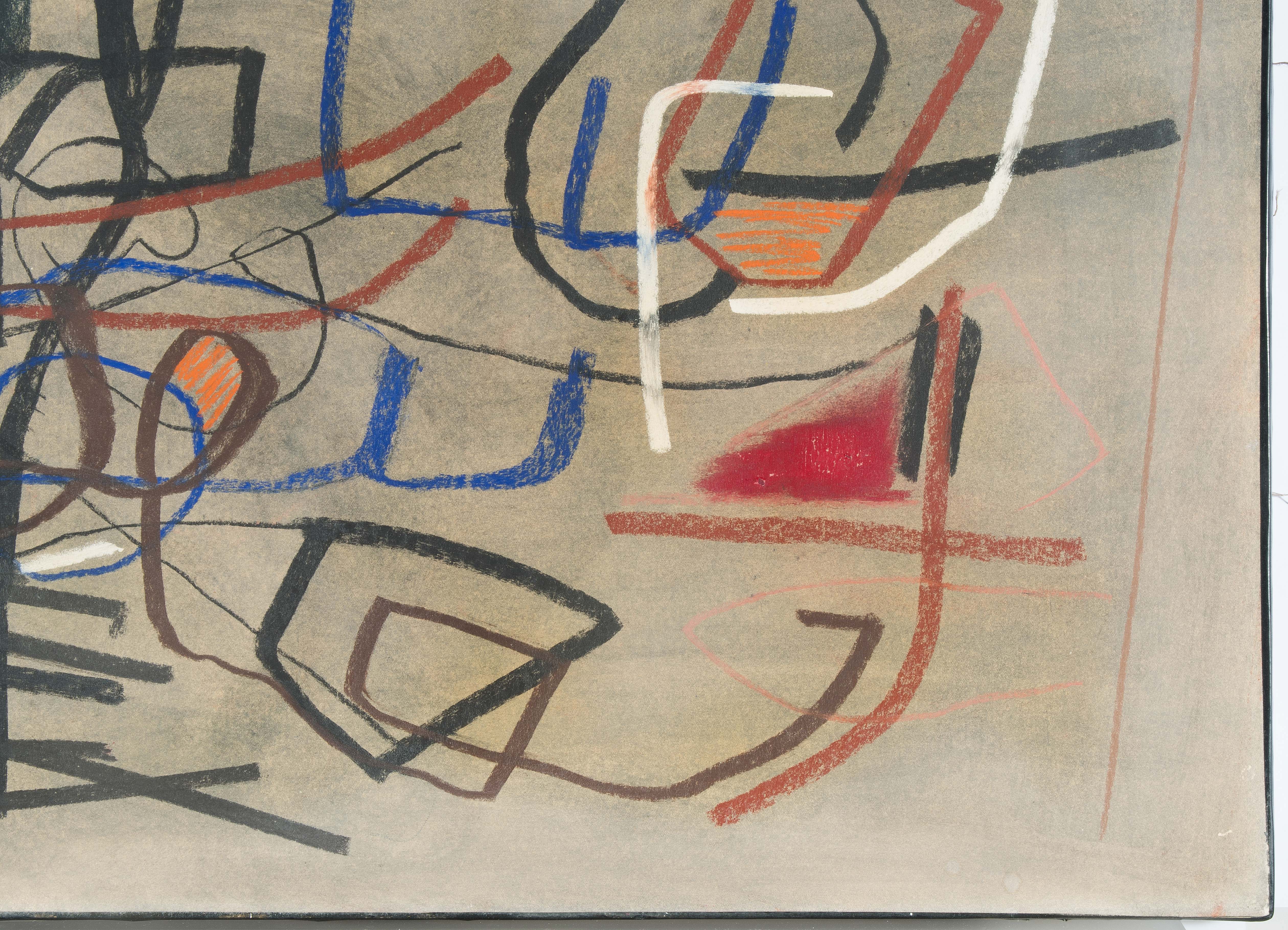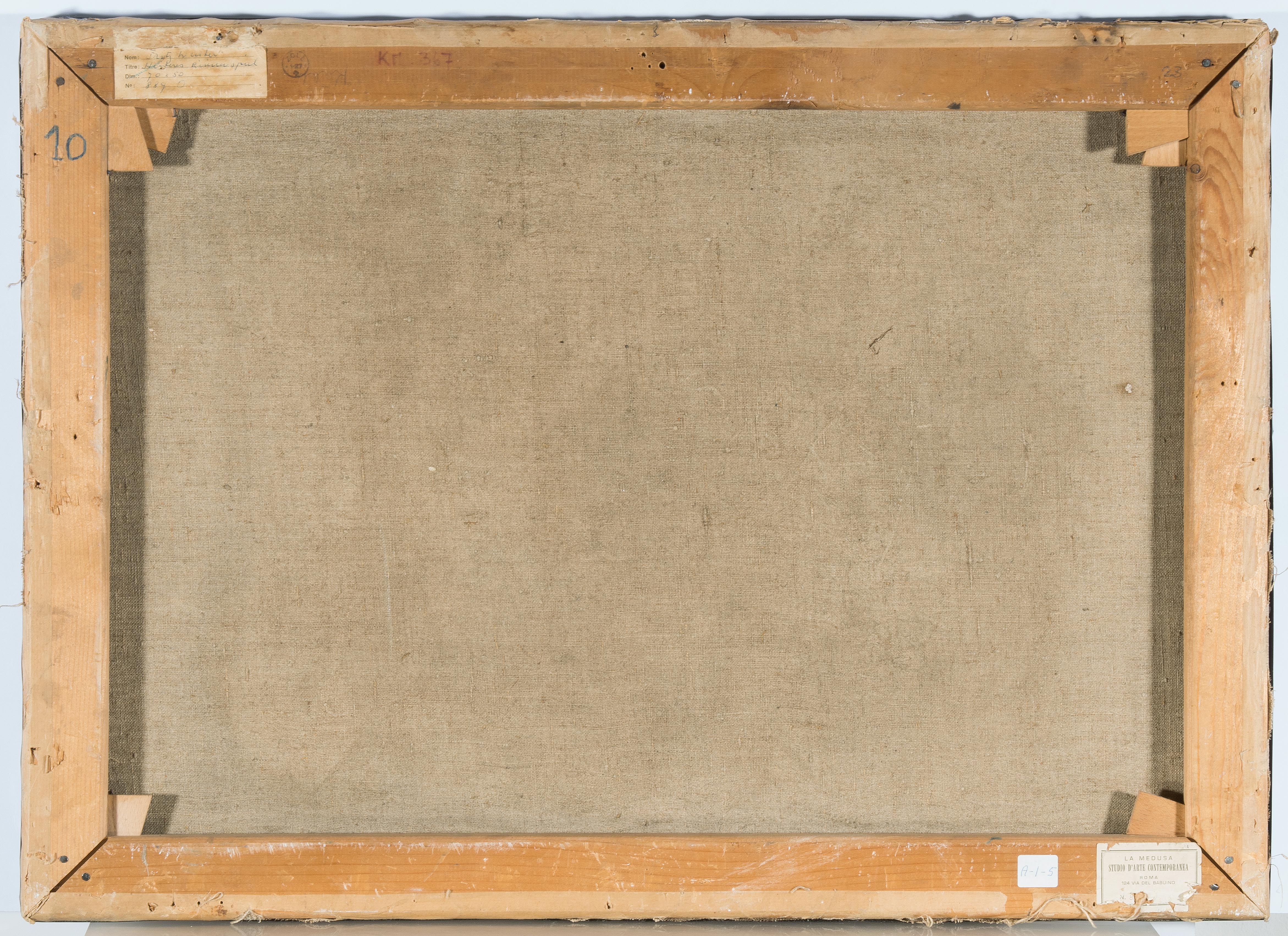 "Heiteres Linienspiel". 1956. Mischtechnik auf Karton, auf Leinwand aufgezogen. Unten links signiert und datiert. Verso auf Etikett betitelt und nummeriert 889. Etikett von La Medusa, Studio d'arte contemporanea, Roma. 50x70 cm.