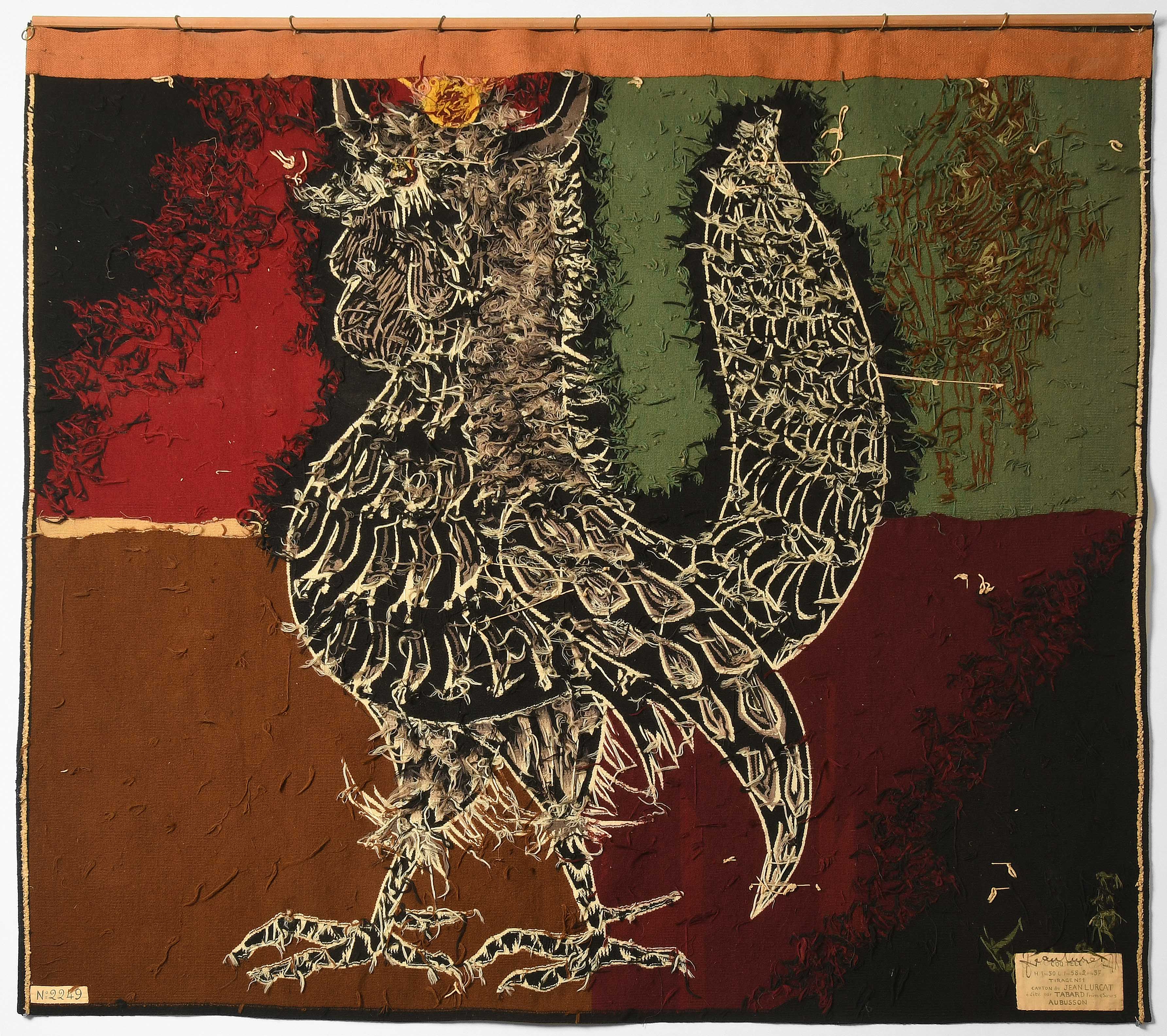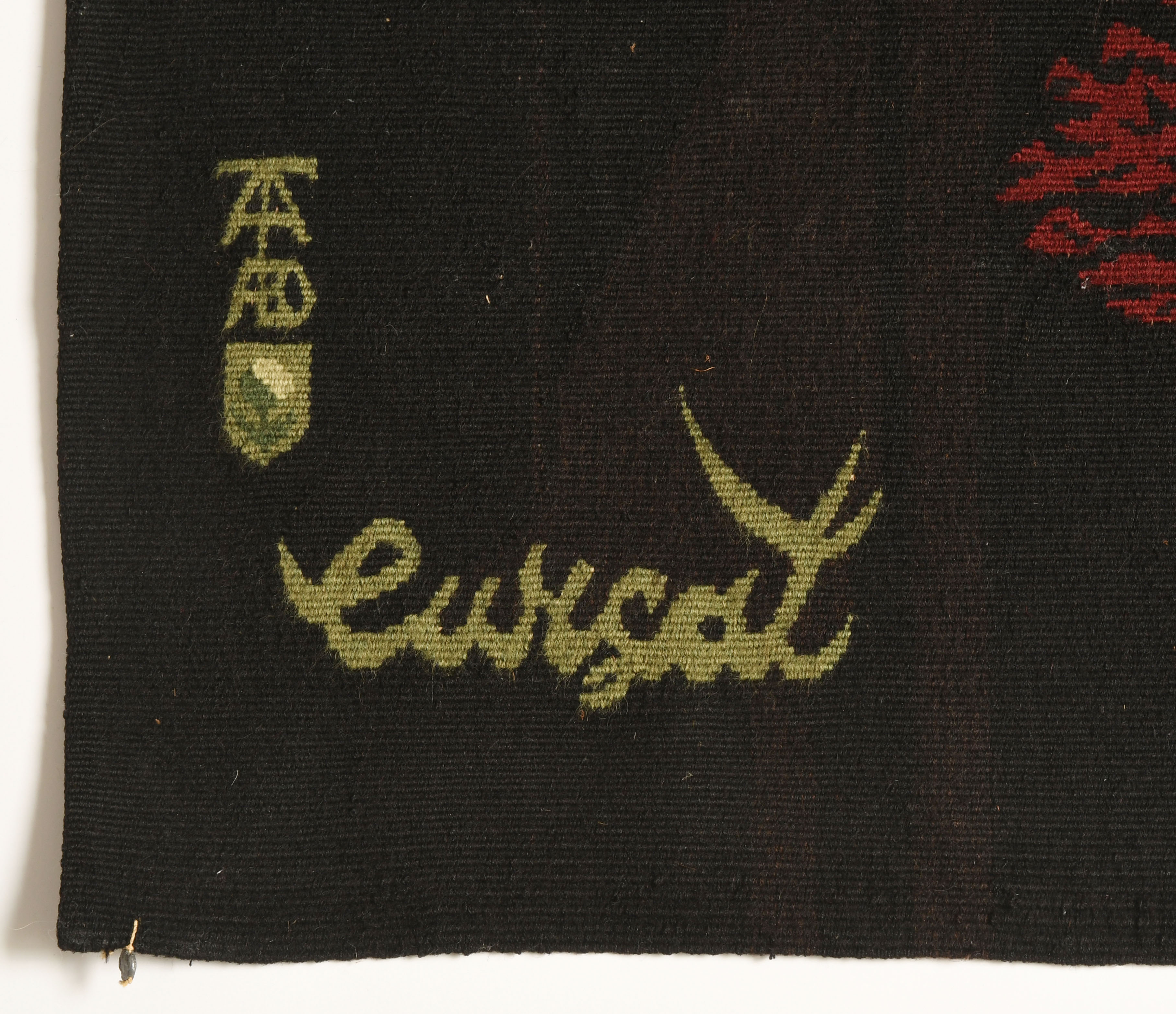 "Coq Tell". Tapisserie. Unten links eingewebte Signatur und Monogramm. Verso auf Etikett betitelt und bezeichnet: "Tirage No 1, Carton de Jean Lurçat, edité par Tabard Frères & Seours, Aubusson". Auf zweitem Etikett: "No. 2249". Masse 150x158 cm. -Schmutzig. Verso mit Verstärkungsband und Ringen zum Aufhängen am oberen Rand.