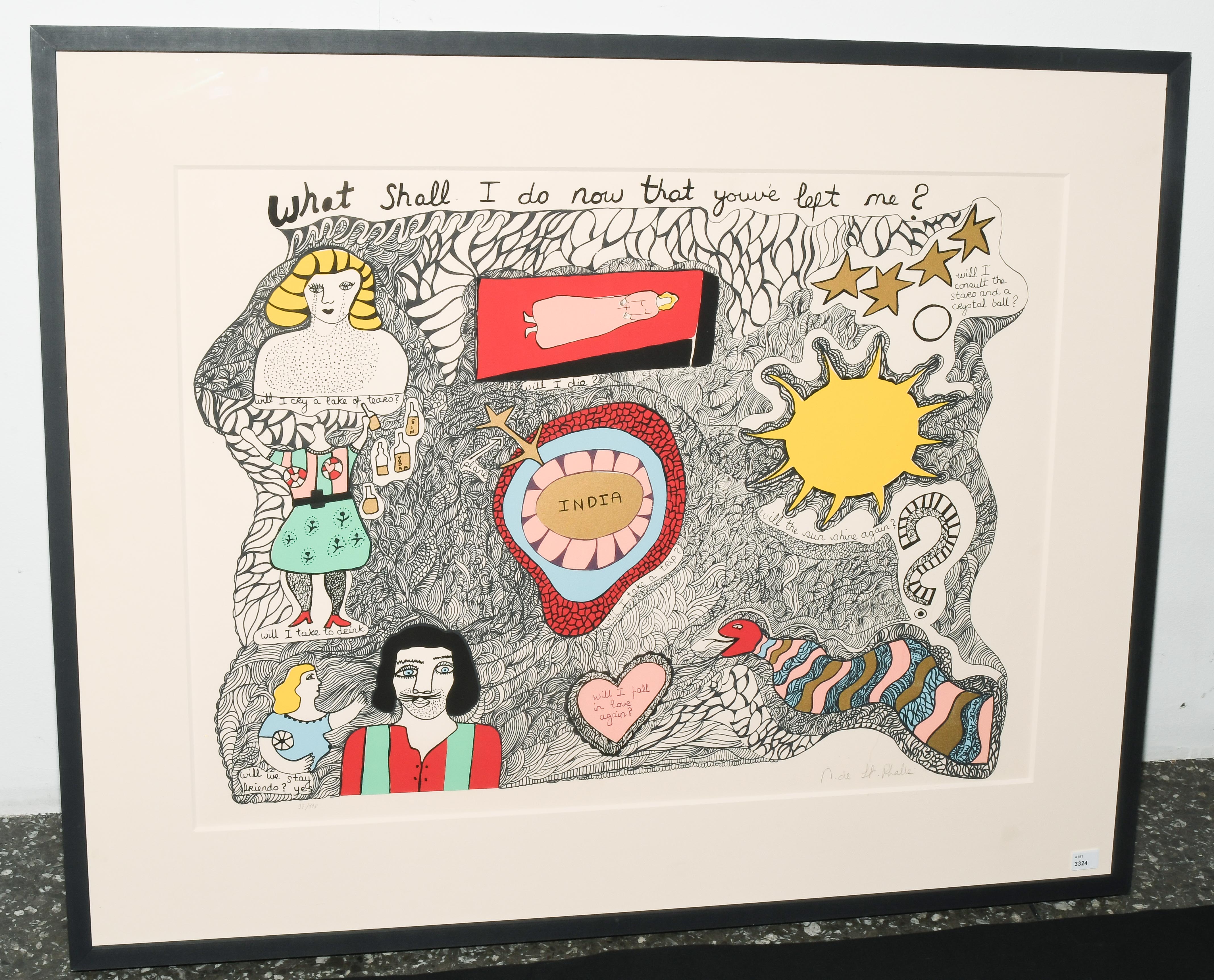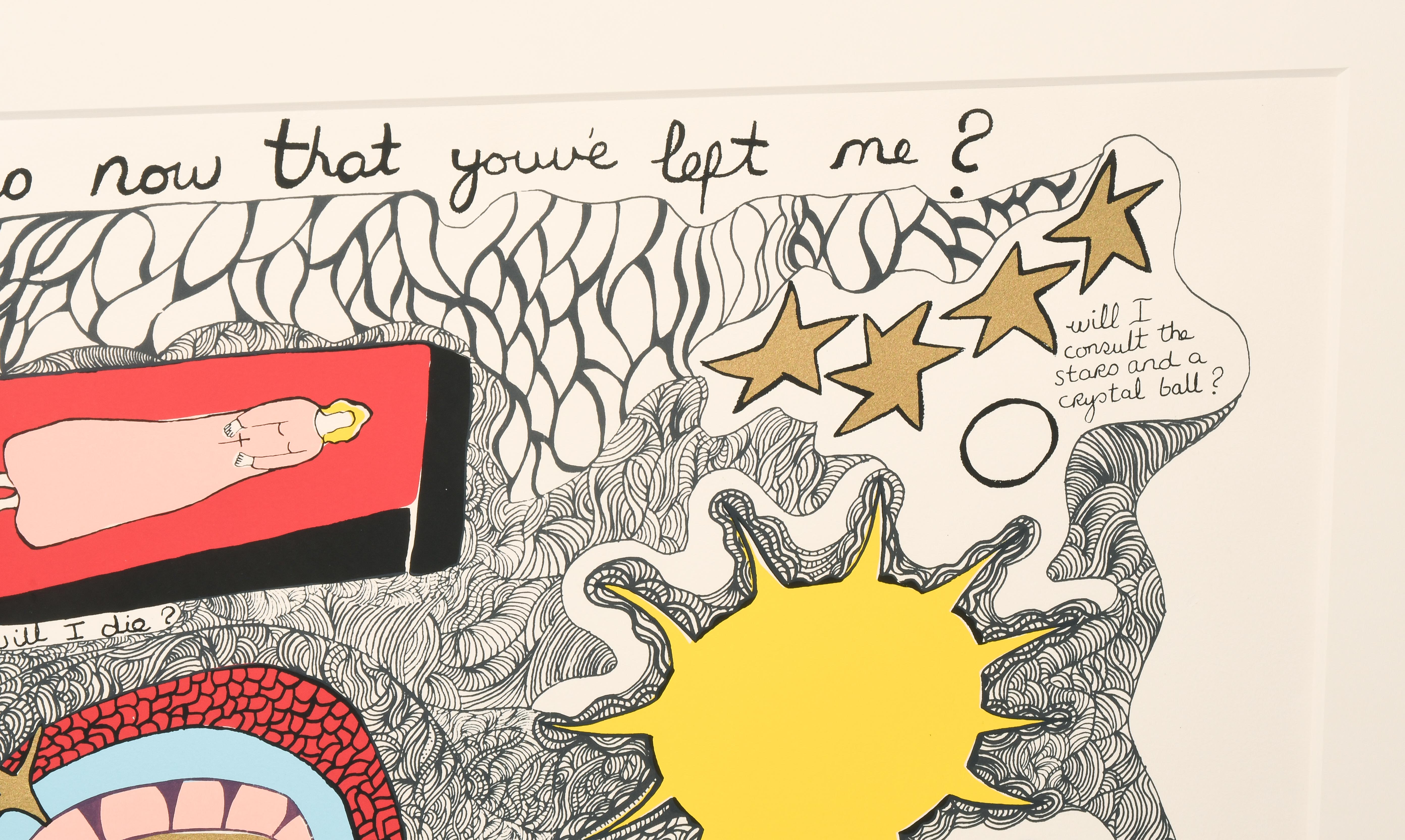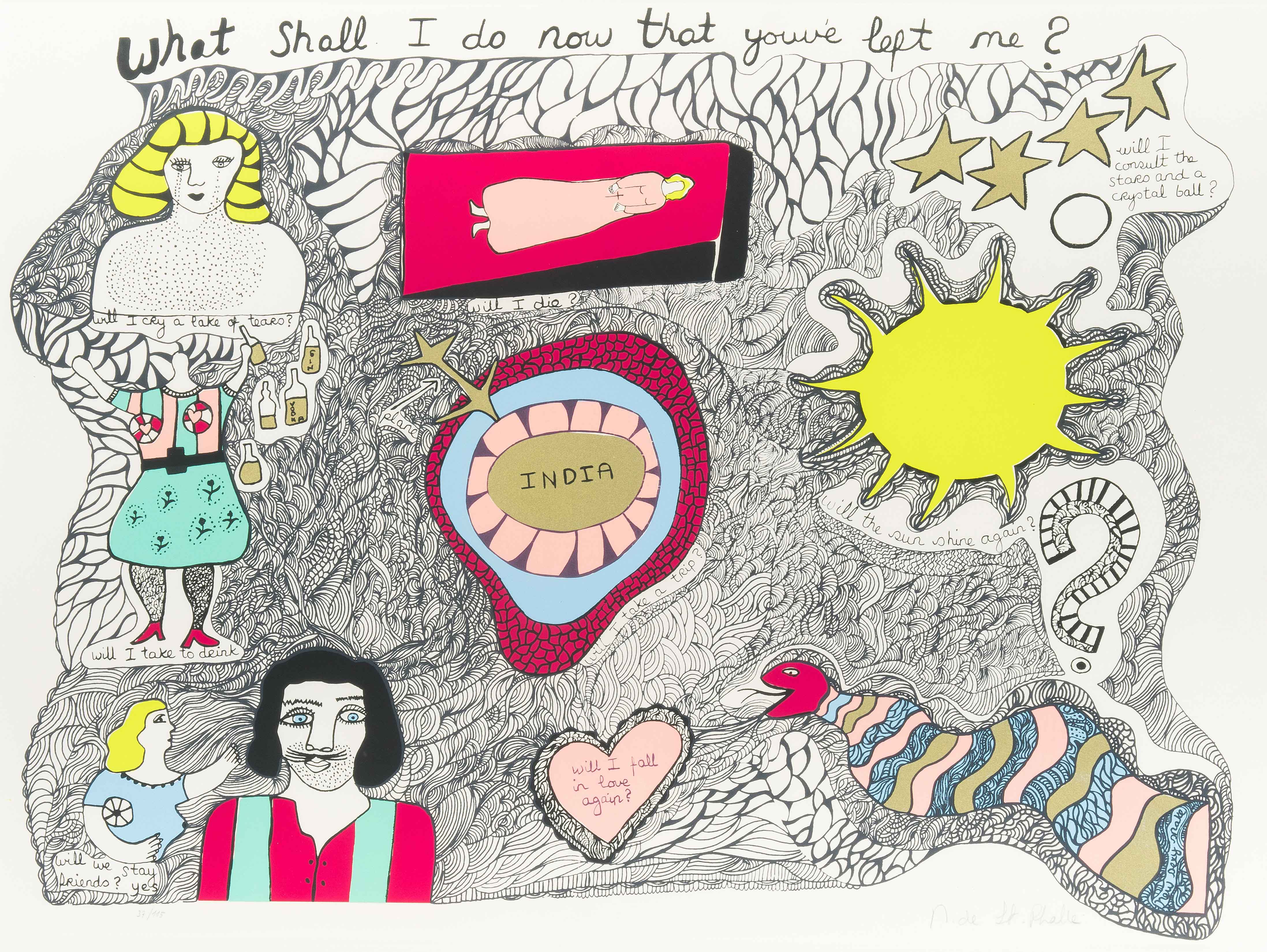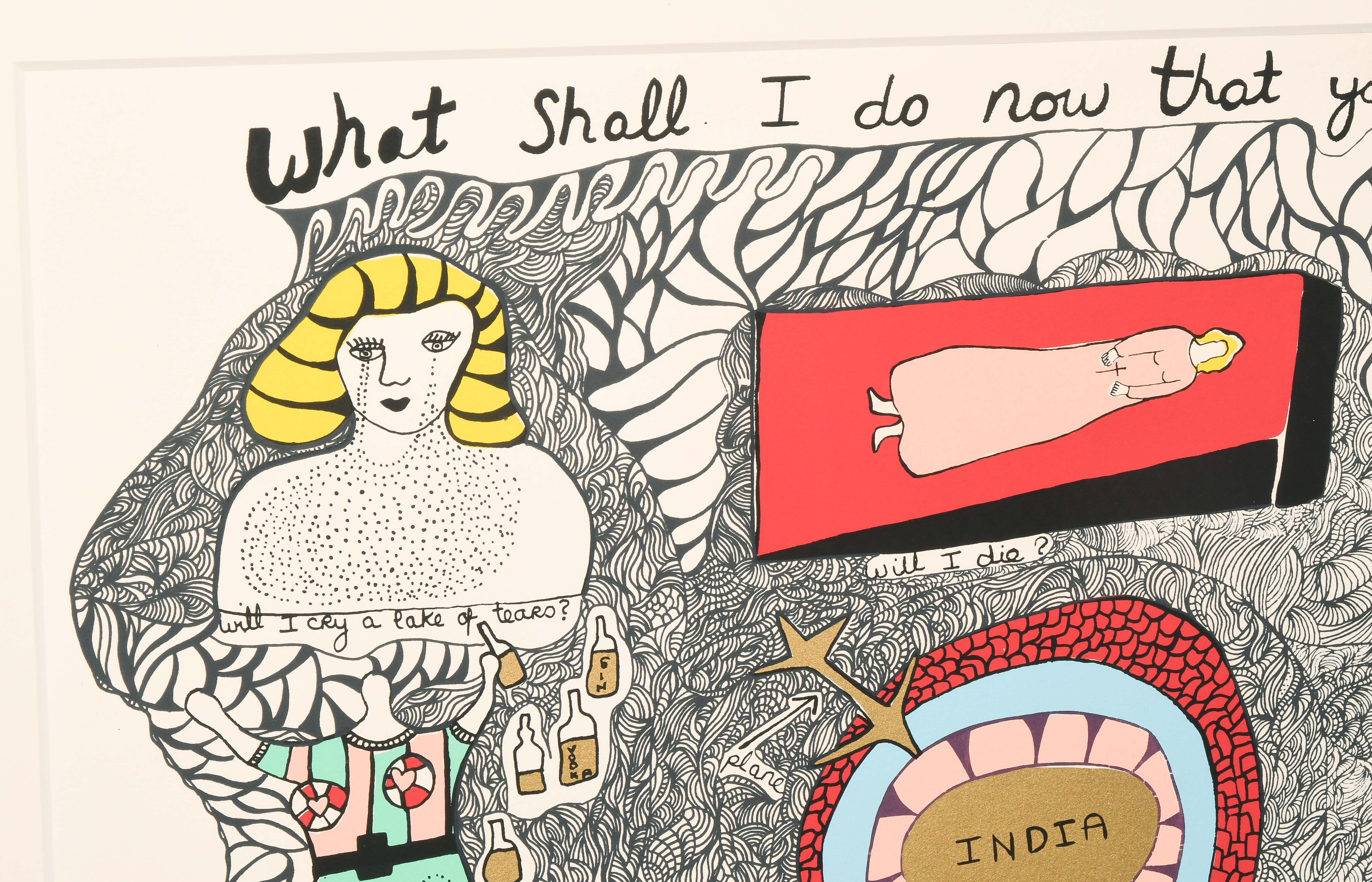 "What shall I do now that you've left me?". 1973. Farblithographie. 37/115. Unten rechts in Bleistift signiert. Blattgrösse 56x75,8 cm. Gerahmt. -Blatt leicht gebräunt. Hellerer Lichtrand. Verso am oberen Rand partiell an Rückkarton montiert.