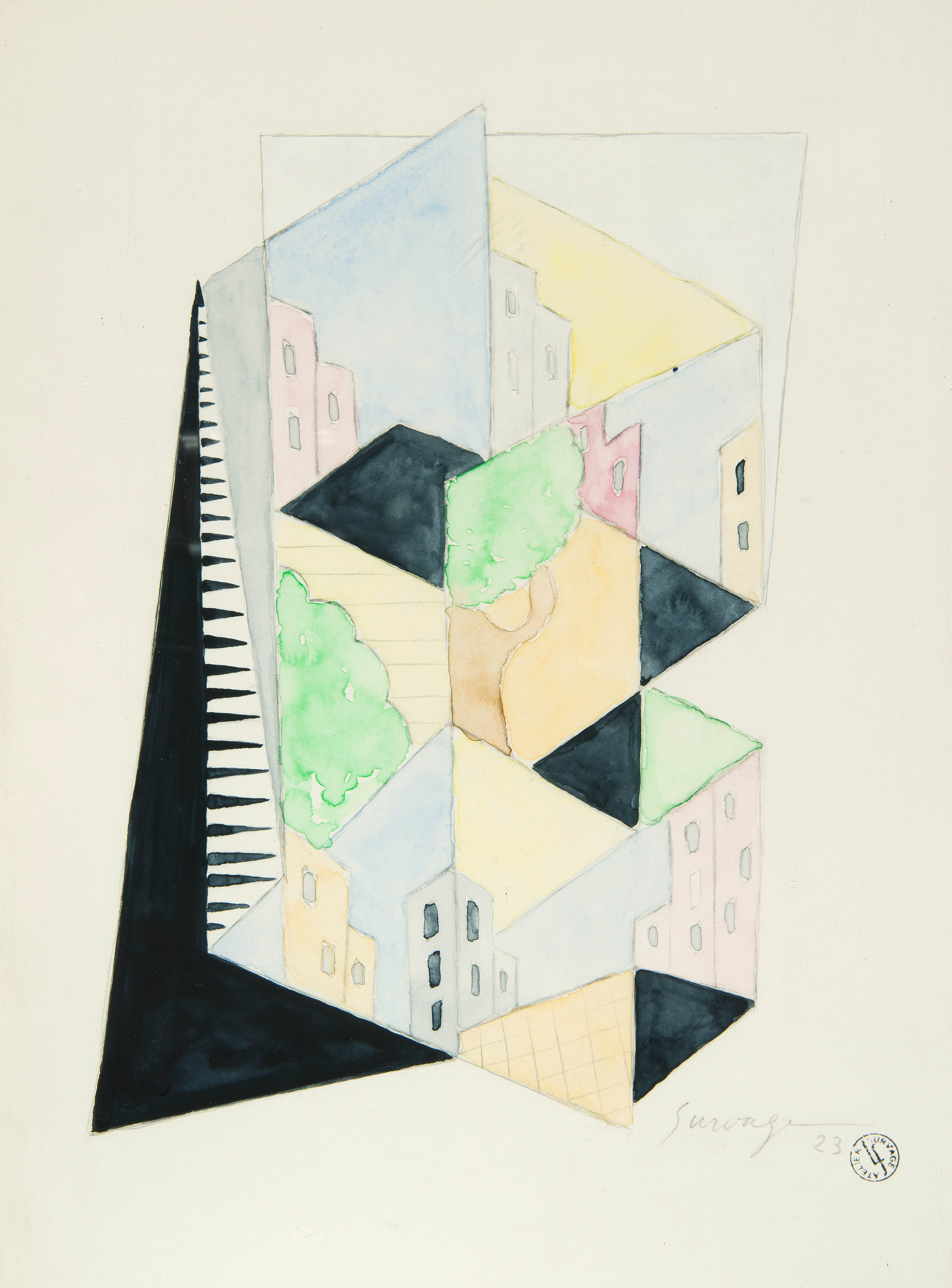 Kubistische Stadtansicht. 1923. Aquarell und Bleistift auf Papier. Unten rechts in Bleistift signiert und datiert. Mit Stempel: "Atelier Survage". Blattgrösse 29,8x21,7 cm. Gerahmt. -Blatt mit wenigen Knittern. Ränder und Ecken leicht bestossen.