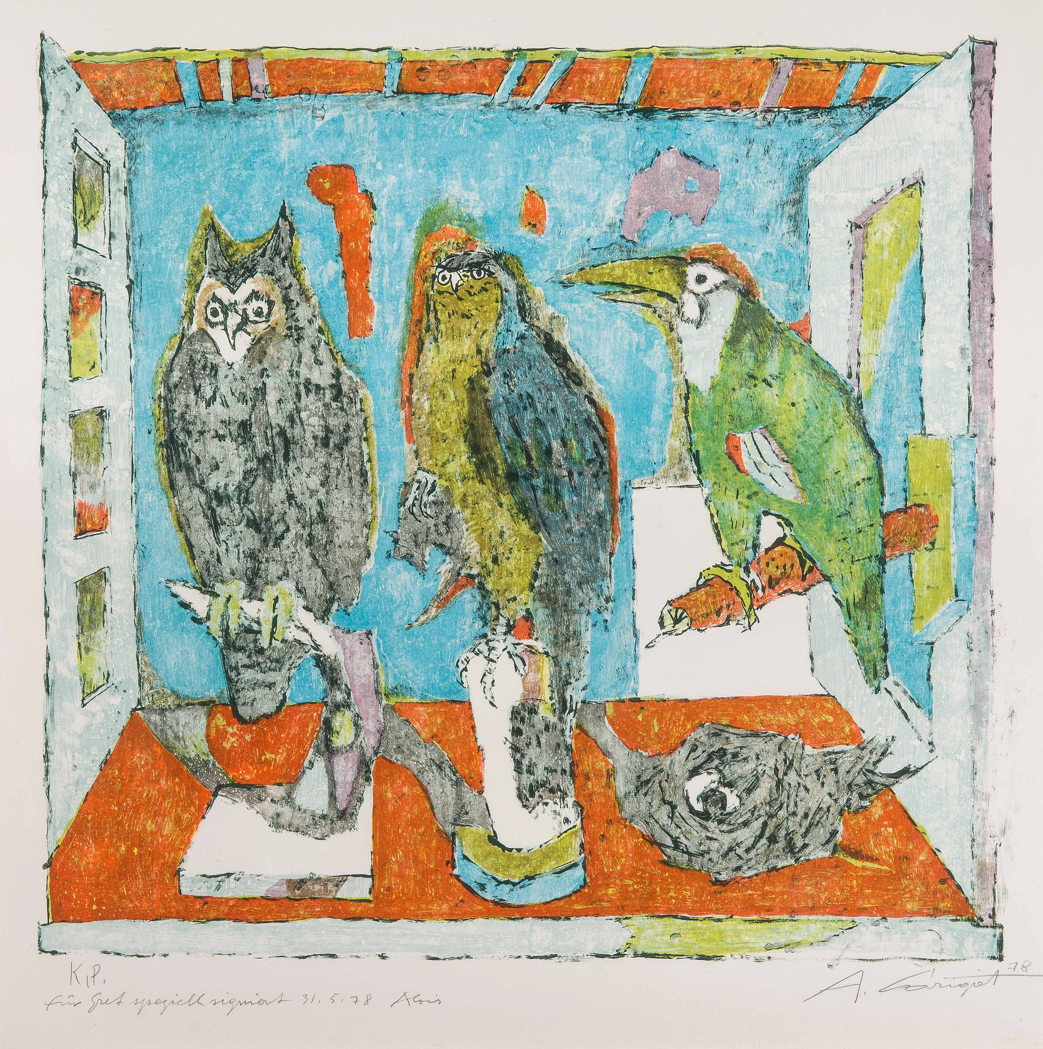 Volière mit Nest. 1978. Farblithographie. K.P. Unten rechts in Bleistift signiert und datiert. Unten links mit Widmung und Prägestempel Matthieu Litho. Blattgrösse 62x62,5 cm. Gerahmt. -Blatt mit Knitter. Ränder und Ecken leicht bestossen.