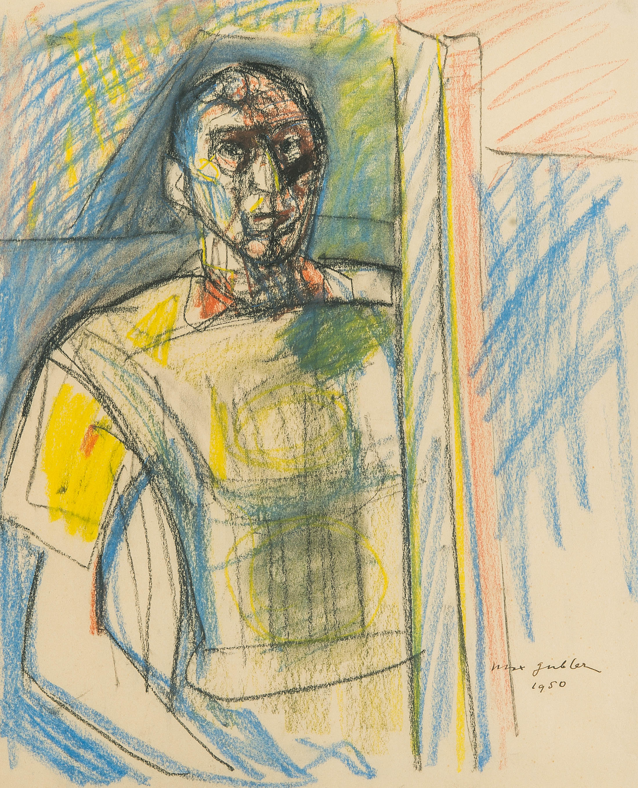 Selbstportrait. 1950. Pastell auf Papier. Unten rechts in Tusche signiert und datiert. Blattgrösse 46x37 cm. Gerahmt. -Blatt leicht gebräunt und leicht fleckig. Dunklerer Lichtrand. Am linken Rand Abrissspuren eines Skizzenblocks. Verso am oberen Rand an Rückkarton montiert.