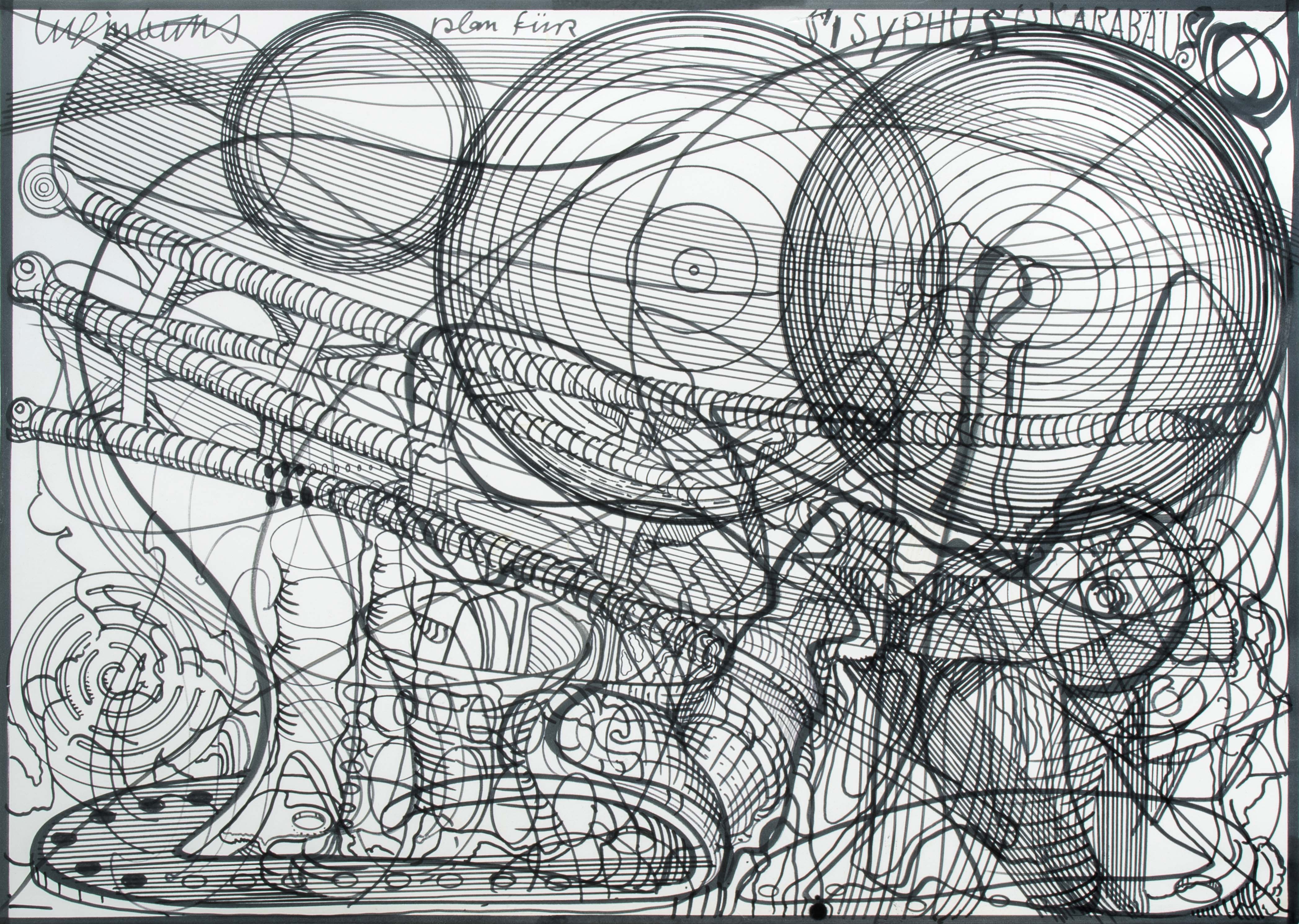 "Plan für Sisyphus Skarabäus". 1979. Tusche und Filzstift auf Papier. Oben signiert und betitelt. Oben rechts Prägestempel: "Sihl Déposé Superbus 460M". Blattgrösse 73x102 cm. -Am oberen Rand Kratzspur von ca. 4 cm. Blatt leicht gewellt. Ränder und Ecken minimst bestossen. Verso leicht fleckig und mit Klebspurresten an allen Rändern.