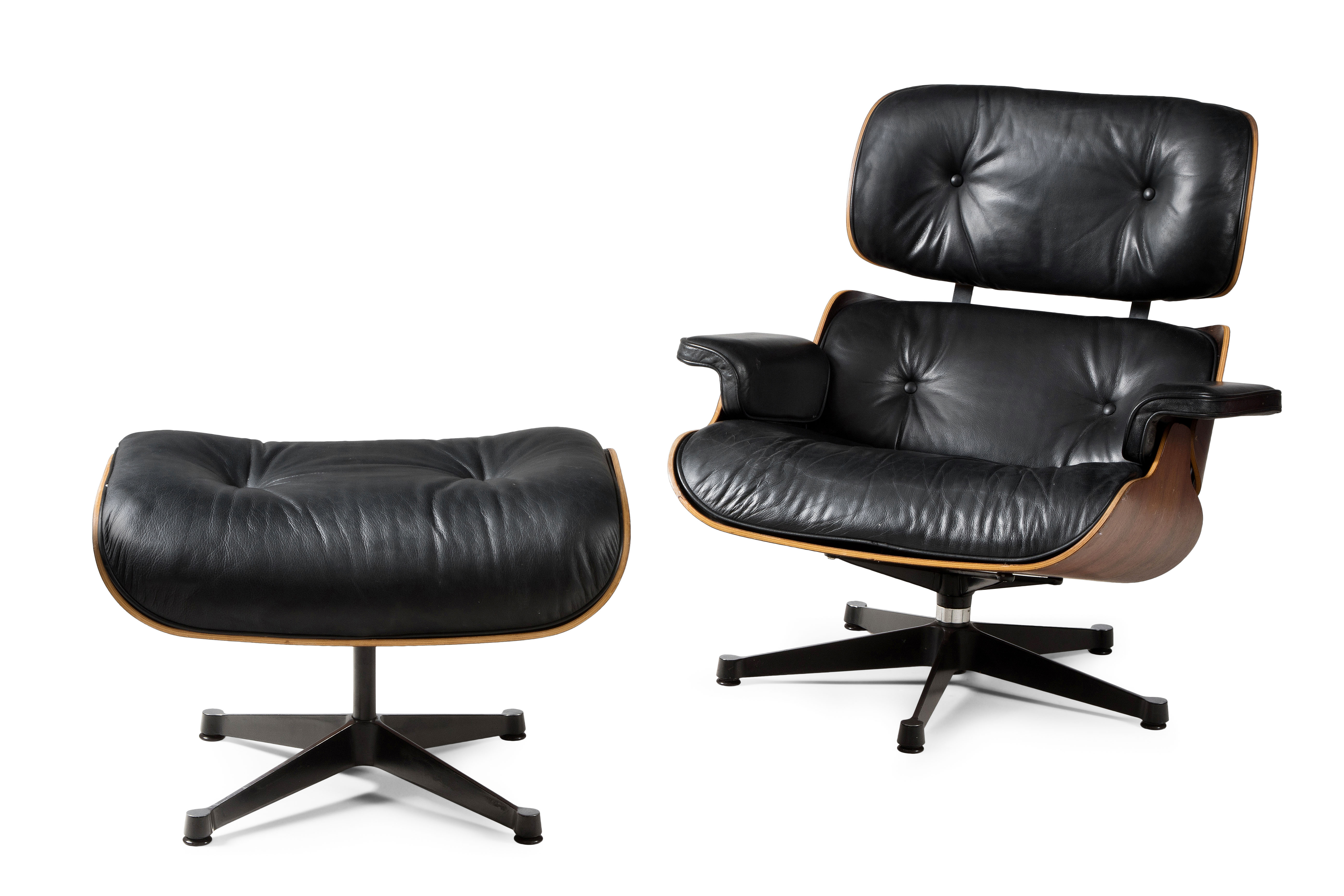 Lounge Sessel mit Ottoman, Modell Nr. 670. Entwurf 1956. Ausführung: Vitra. Sitzschale aus Palisander, gepolsterter schwarzer Lederbezug. 86x85x84 cm. Sitzhöhe ca. 38 cm.