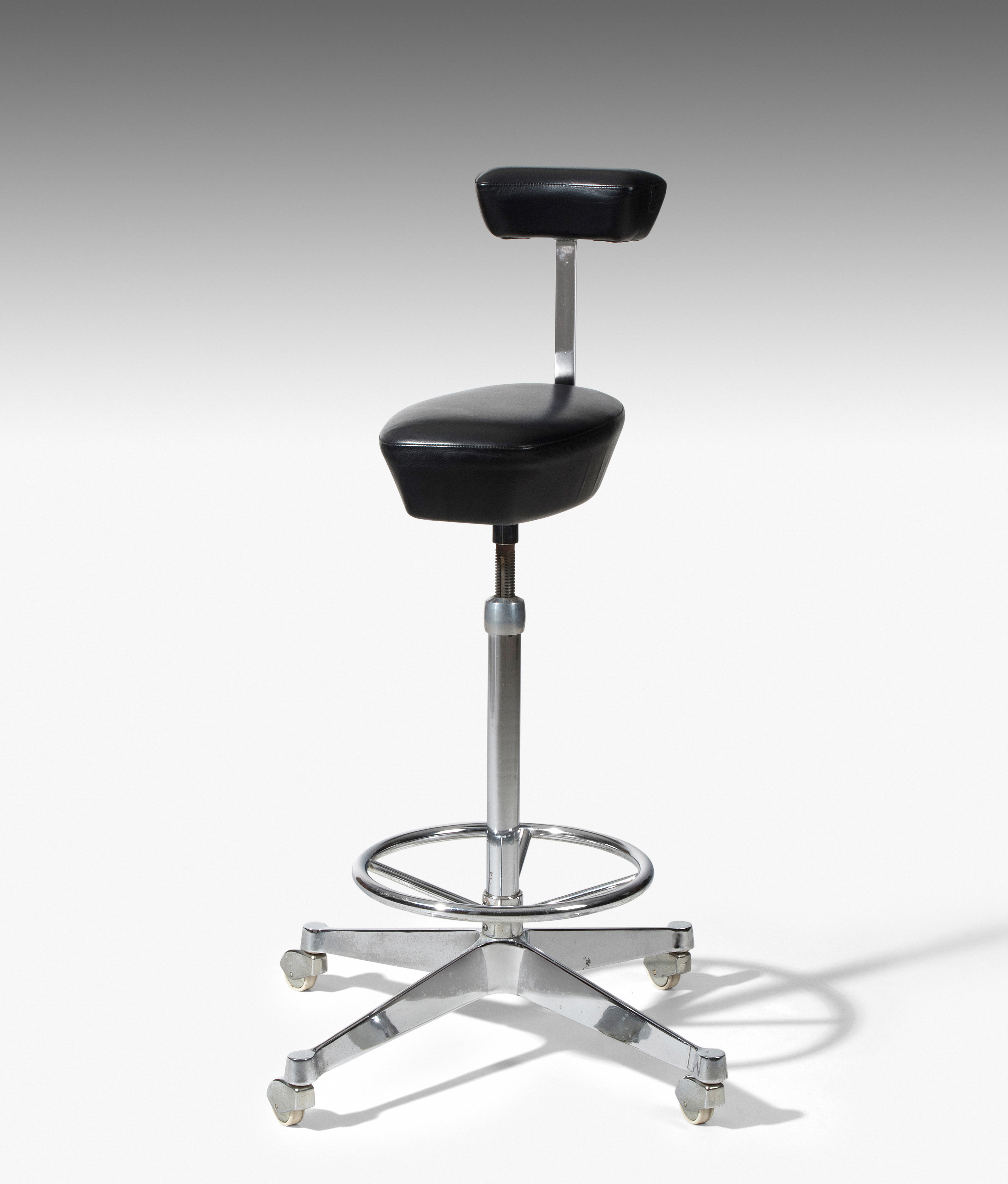 Drehstuhl (Nelson perch). Entwurf 1964, im Rahmen des Büroeinrichtungskonzept Action Office 1. Metall, verchromt, schwarzer Lederbezug. 4-Stern-Untergestell (1. Serie) mit Rollen. Höhe verstellbar. 102x50x48 cm.