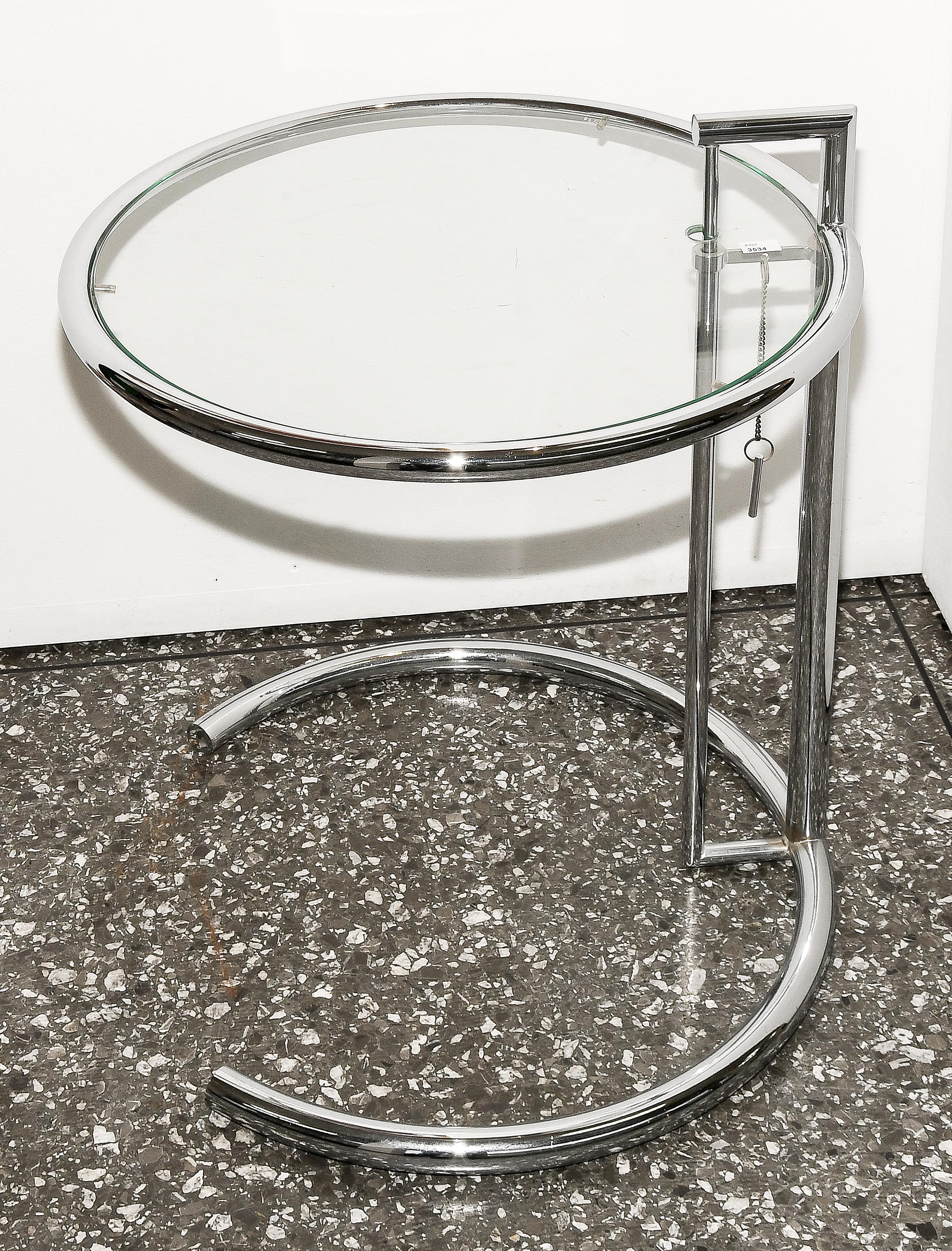In der Art von Eileen Gray. Chrom, Kristallglasplatte. 63x51x51 cm.