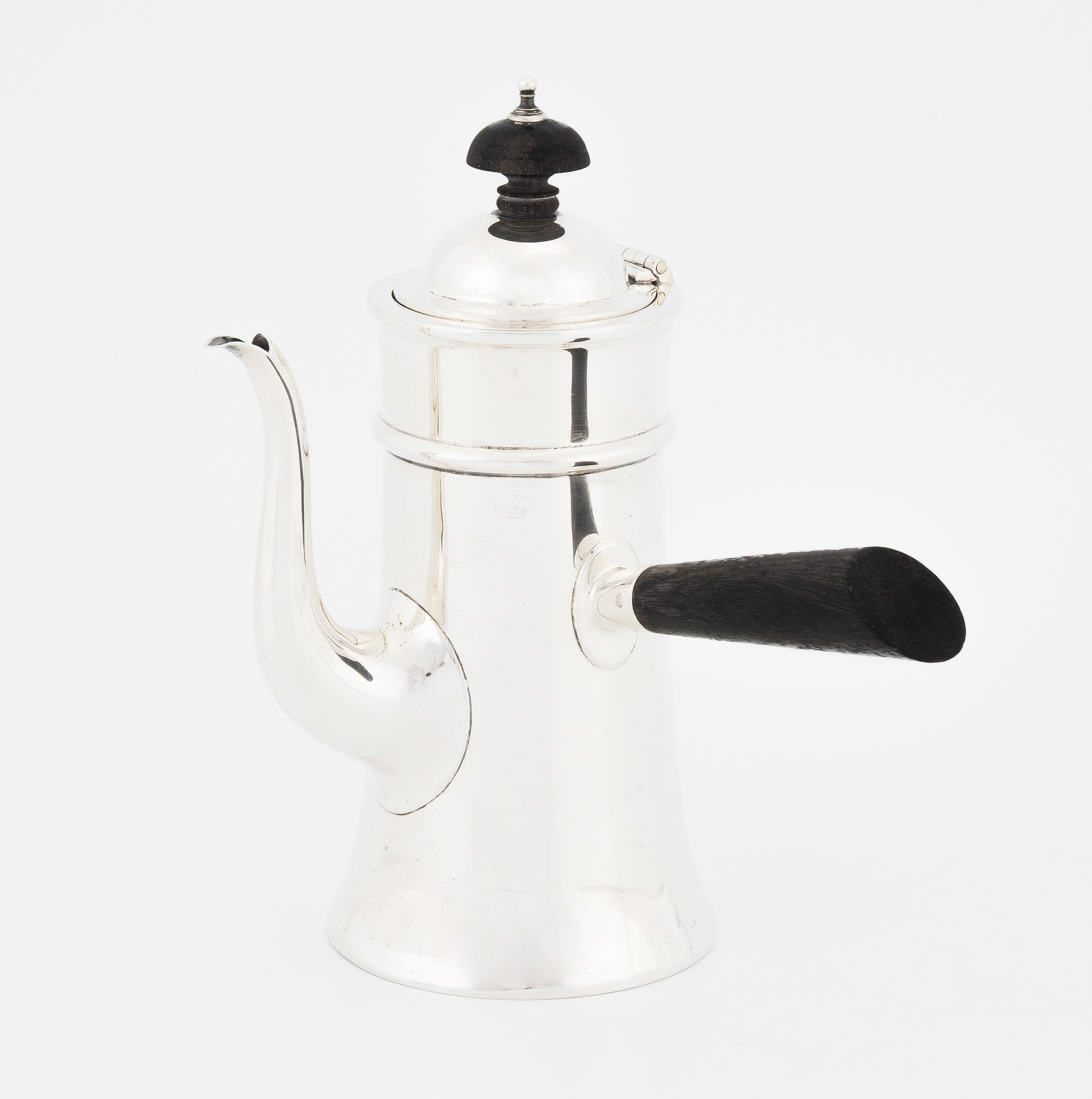 Birmingham, 1919. Silber. Herstellermarke Wilson & Sharp. Zylindrische Form mit geschweiftem Ausguss, gerader Henkel und Deckelknauf ebonisiert. Gemarkt, Feingehalt 925. H 18,5 cm, ca. 292 g.