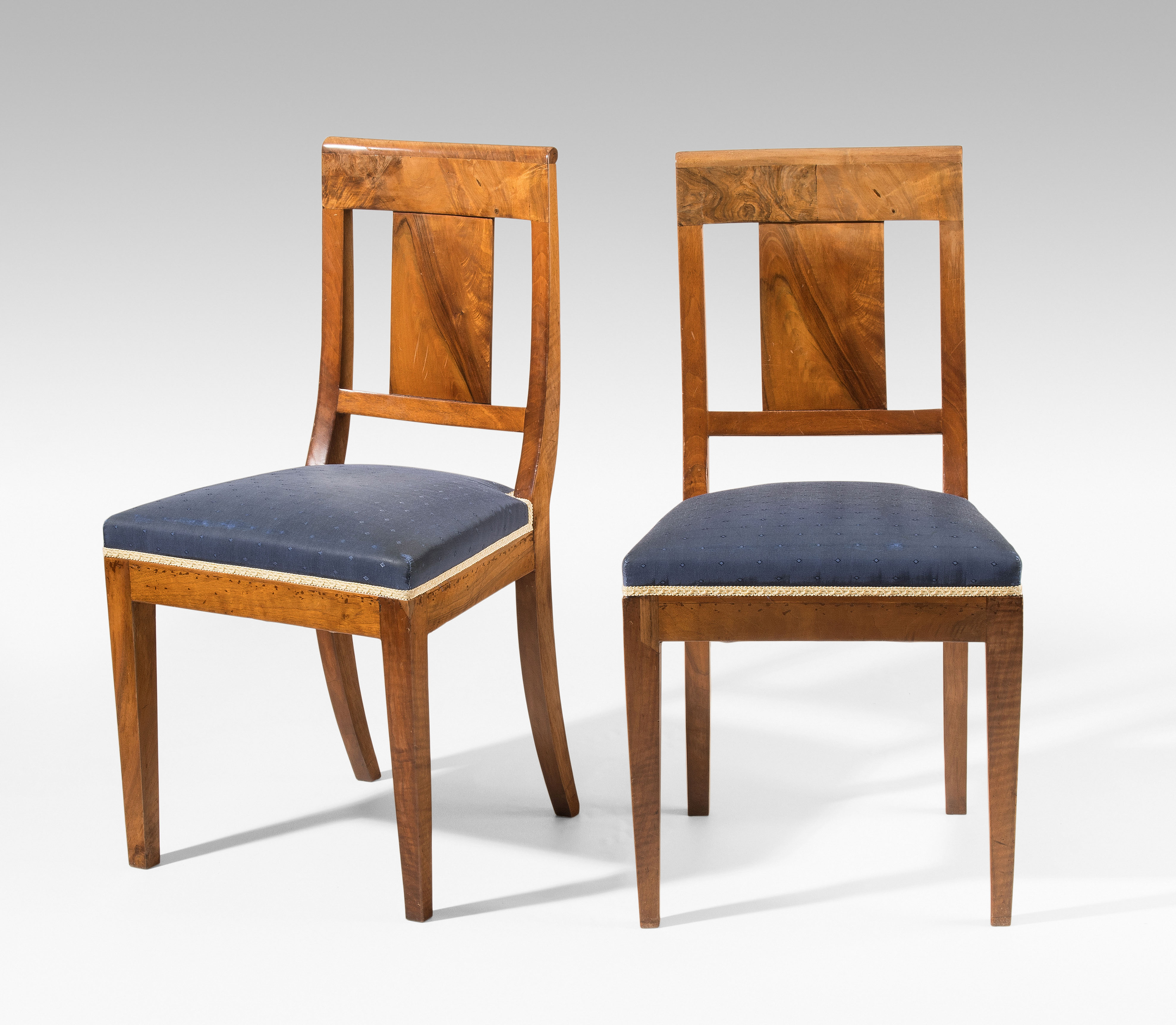 Biedermeier ca. 1820/30. Nussbaum. Trapezförmiges Gestell auf hohen konischen Beinen, mit gebauchtem Rückenbrett. Bezug: Blau. Alters und Gebrauchsspuren. 46x47x87 cm.