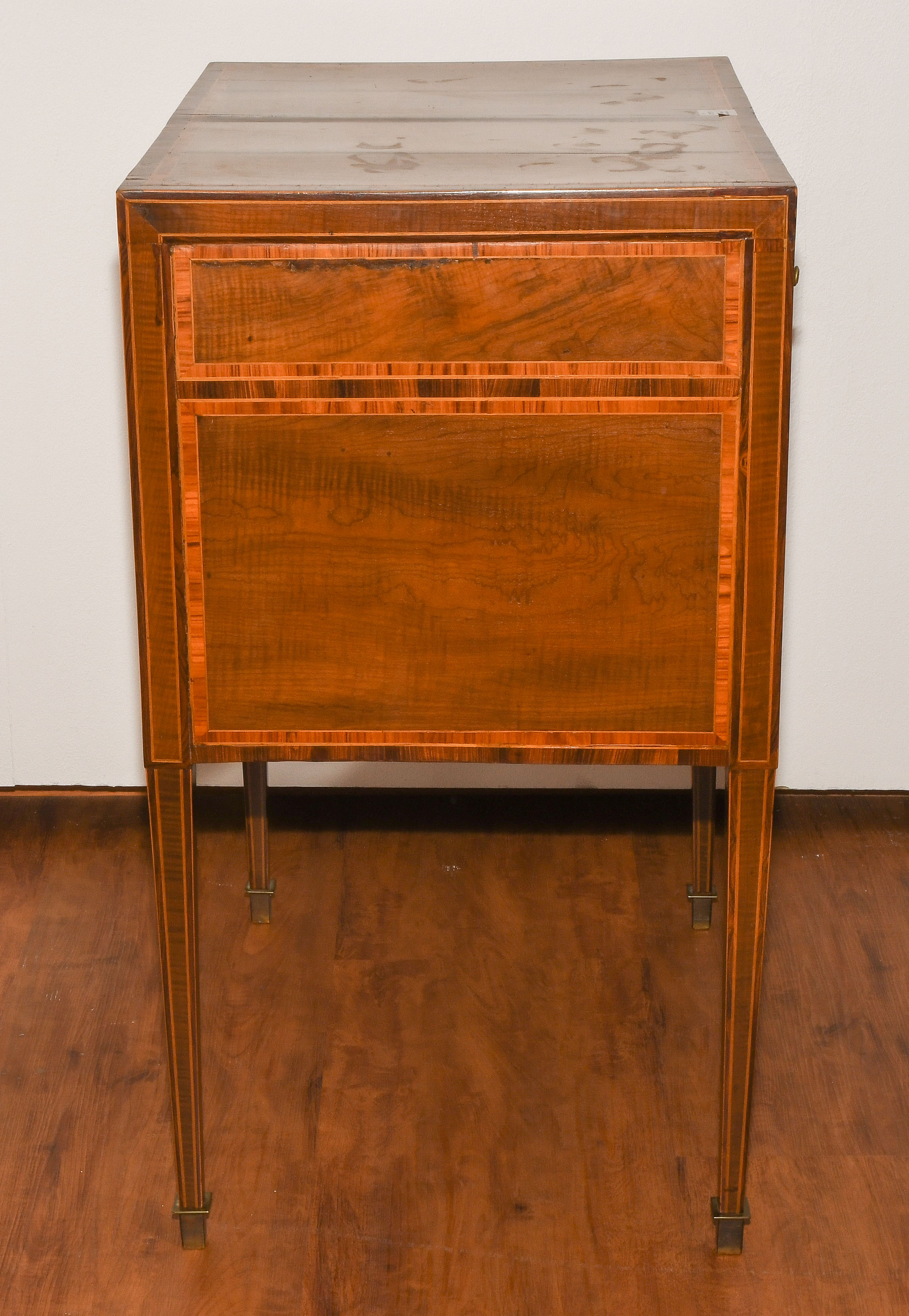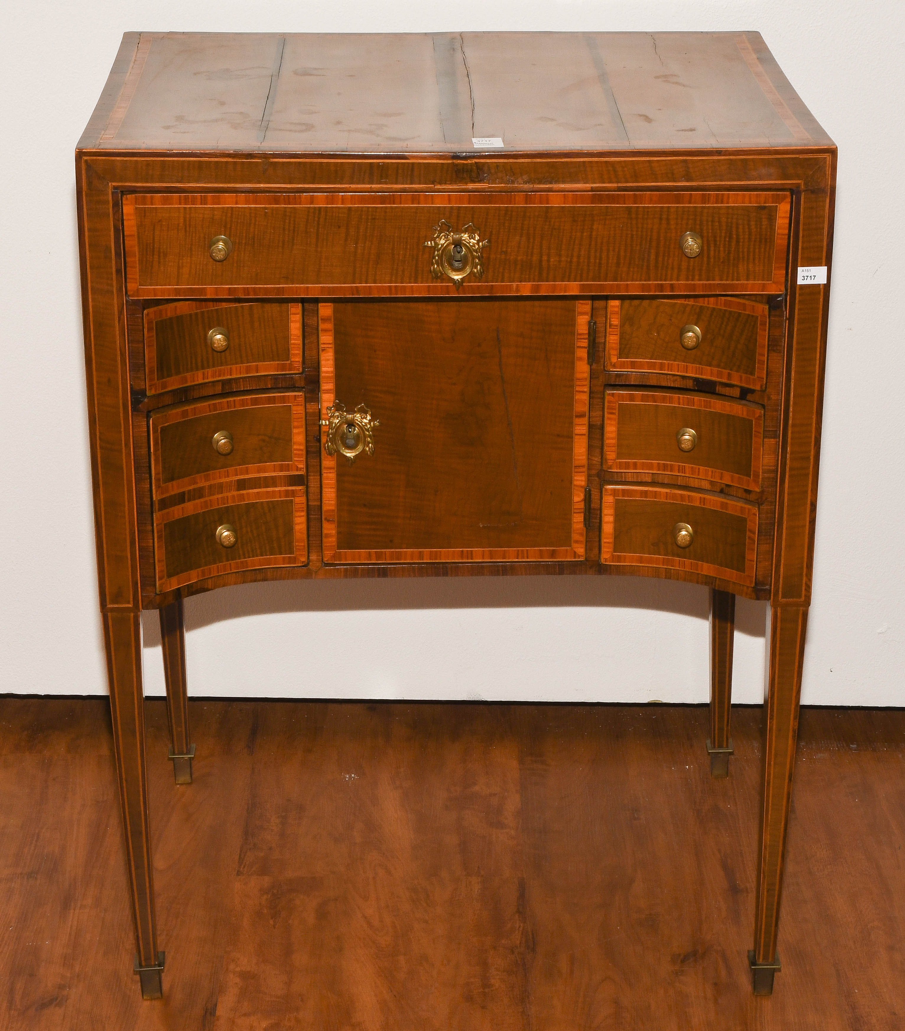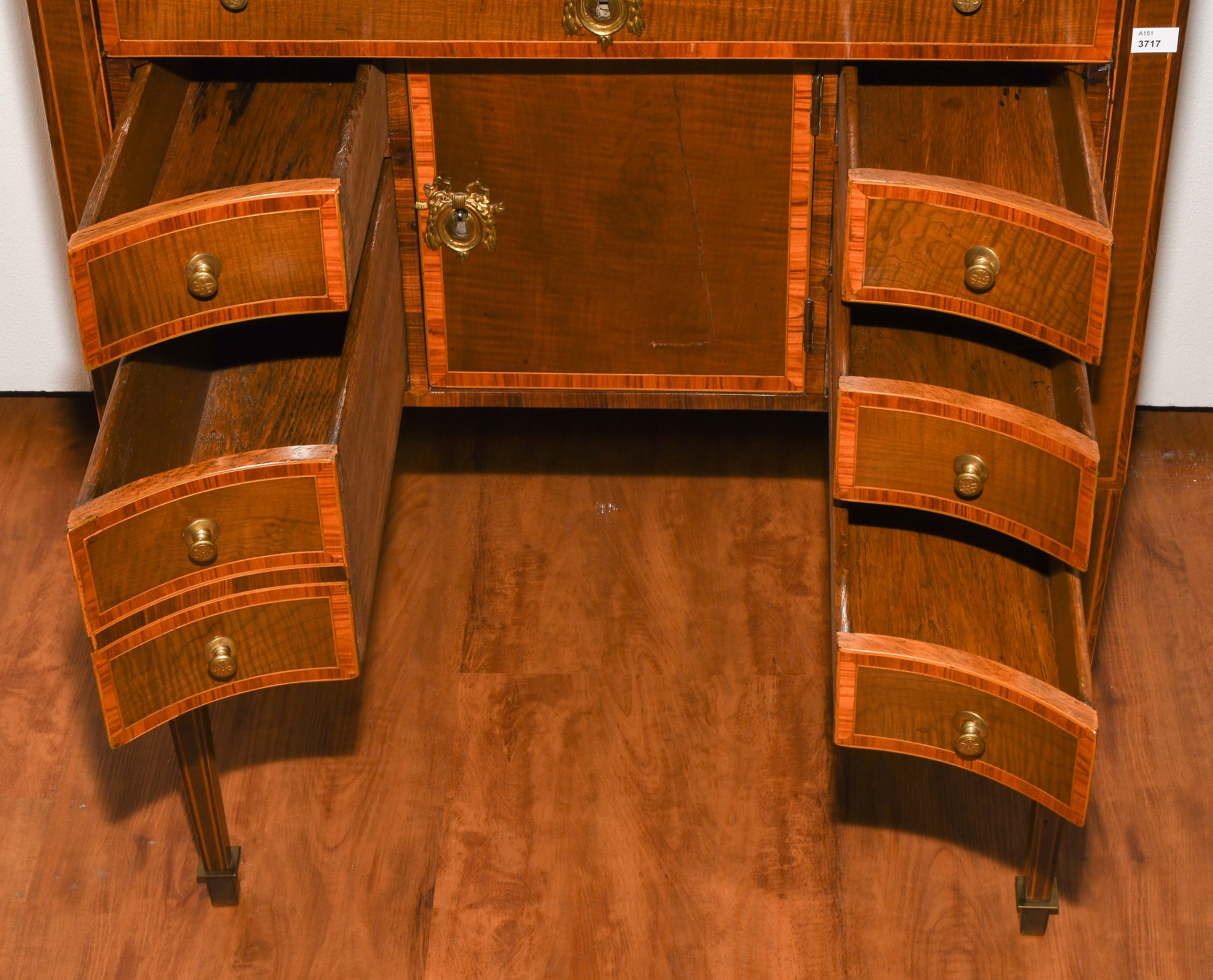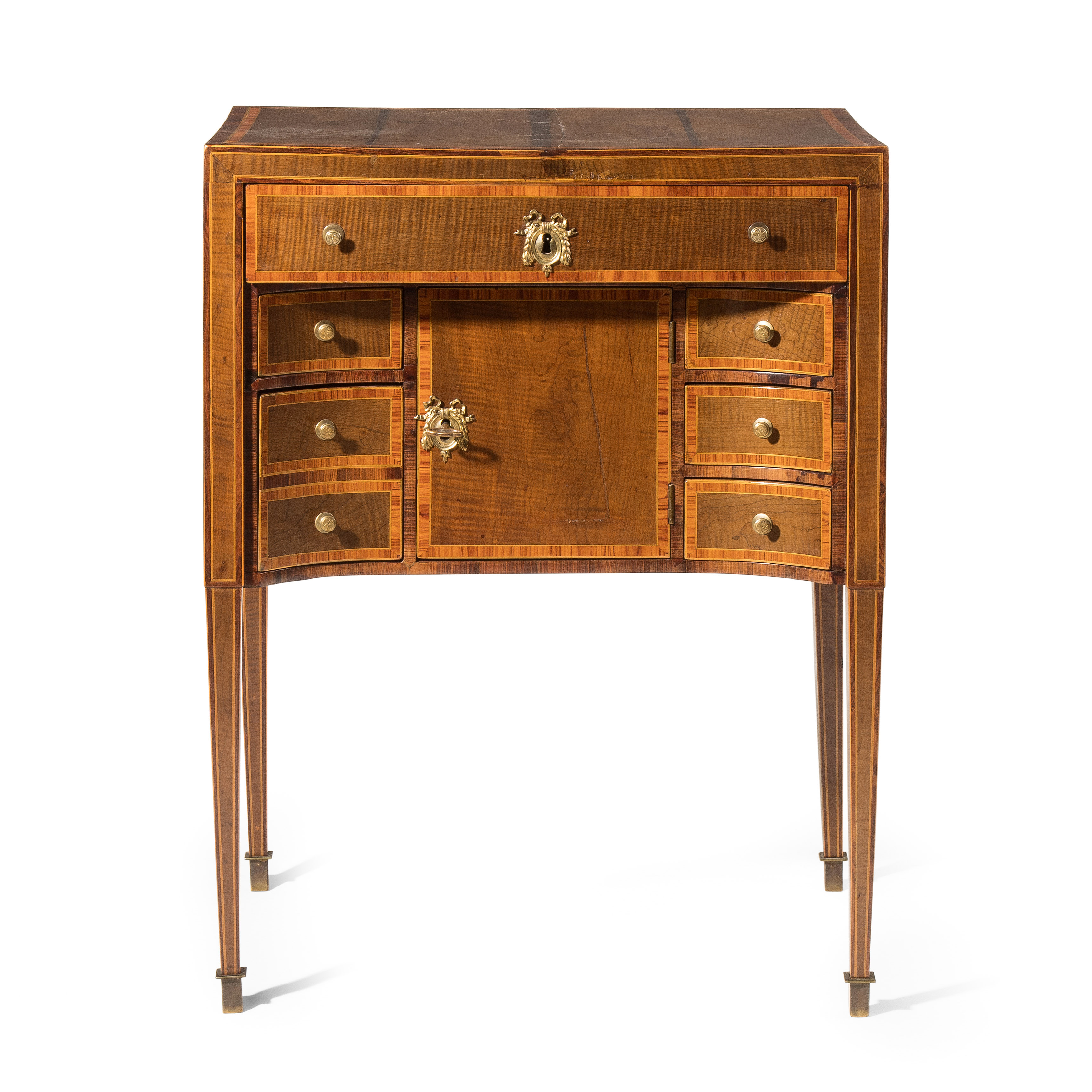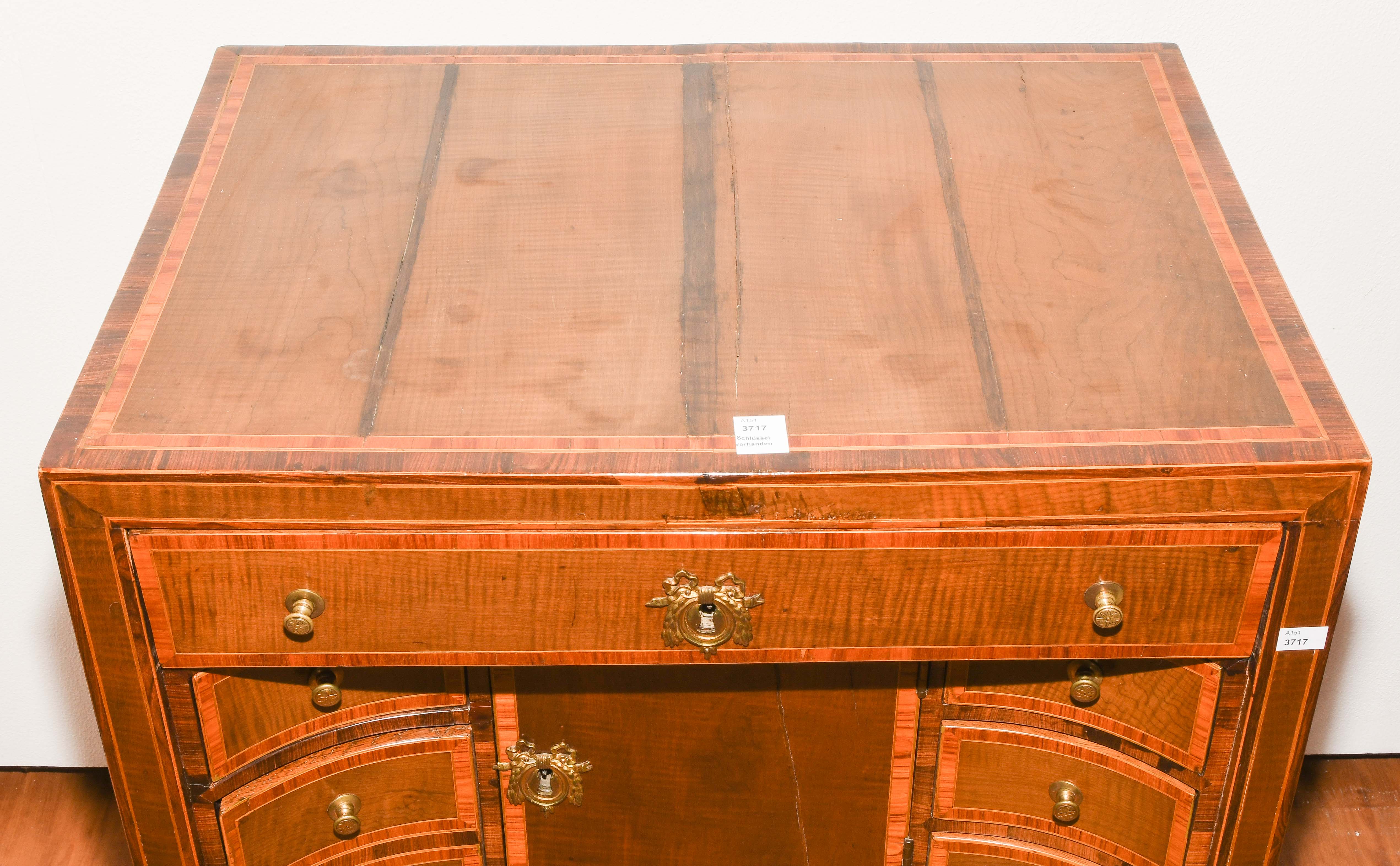 Louis XVI um 1800. Ahorn, Palisander, Rosenholz. Rechteckiger Korpus mit fünf Schubladen, auf hohen schlanken Beinen mit zentraler Türe. Umseitig gefeldert furniert und mit Kontrastbändern belegt. Aufzufrischen. 64x47x85 cm.