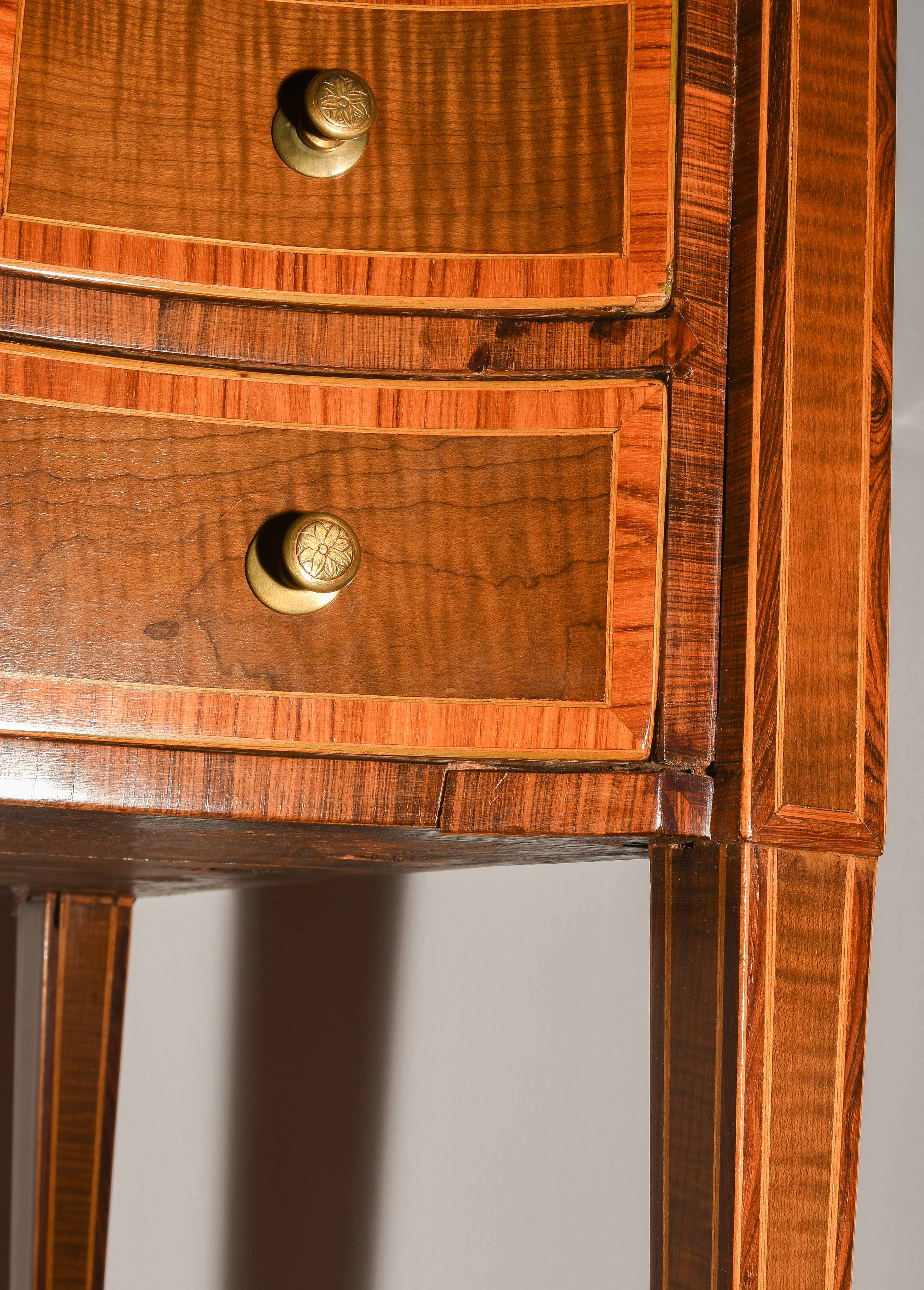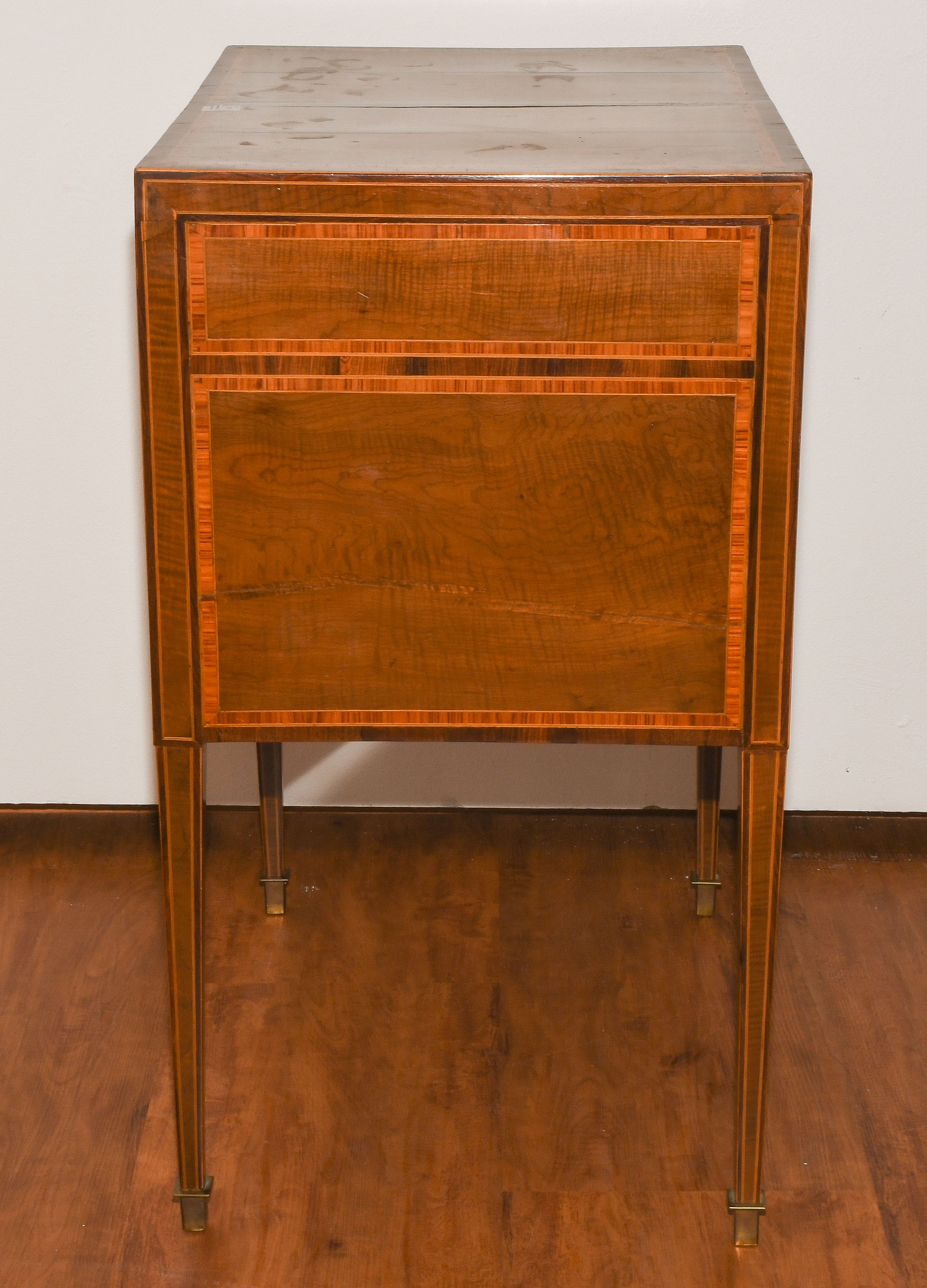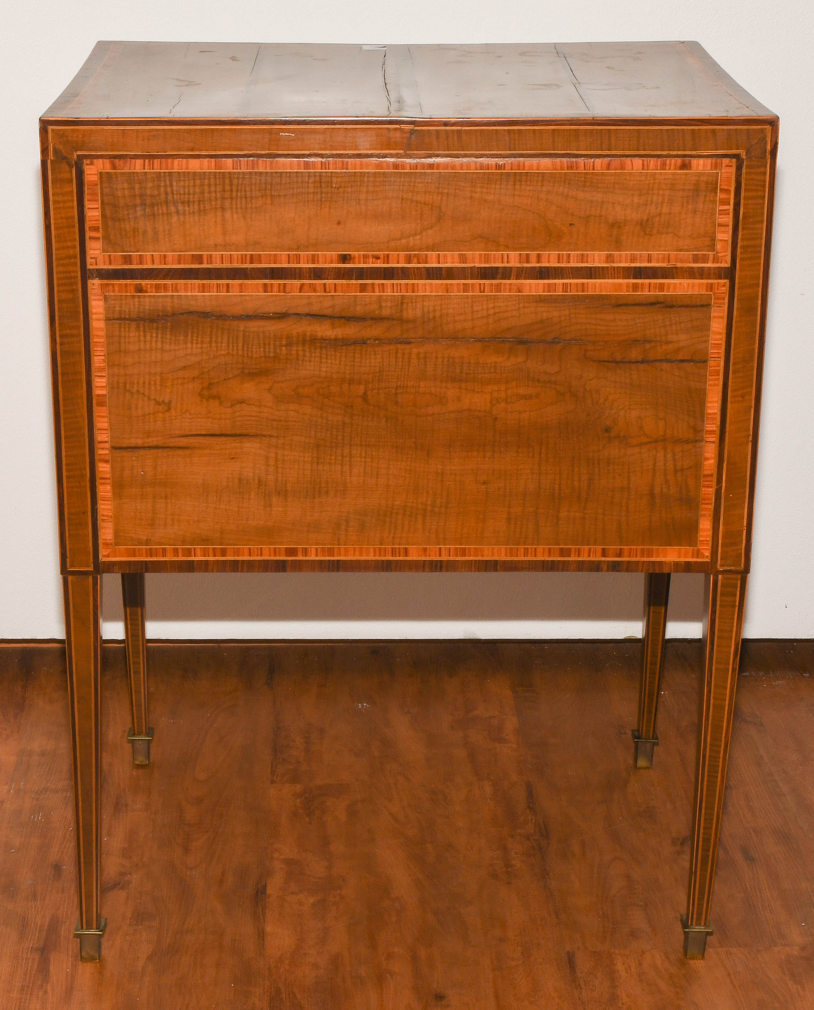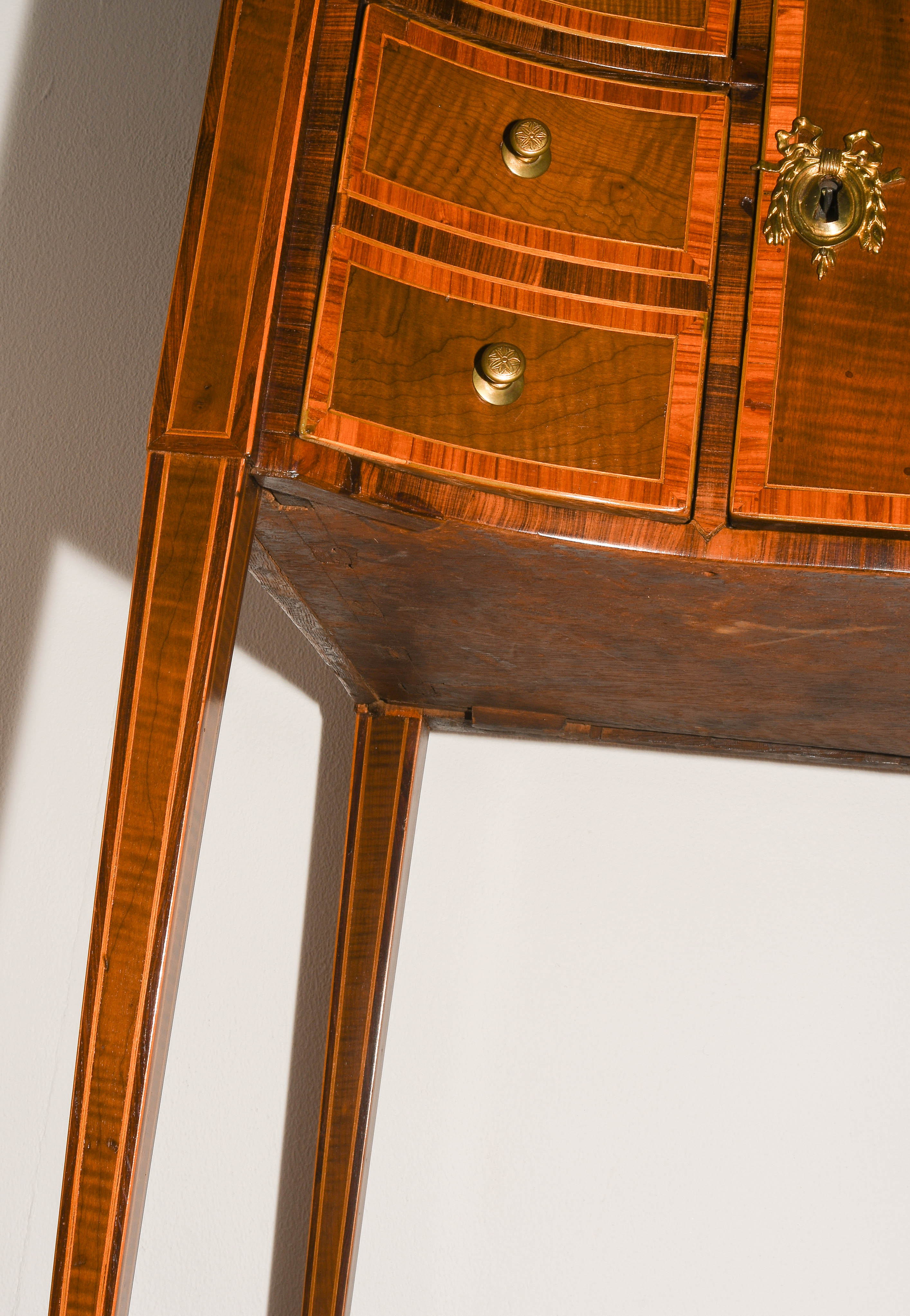 Louis XVI um 1800. Ahorn, Palisander, Rosenholz. Rechteckiger Korpus mit fünf Schubladen, auf hohen schlanken Beinen mit zentraler Türe. Umseitig gefeldert furniert und mit Kontrastbändern belegt. Aufzufrischen. 64x47x85 cm.