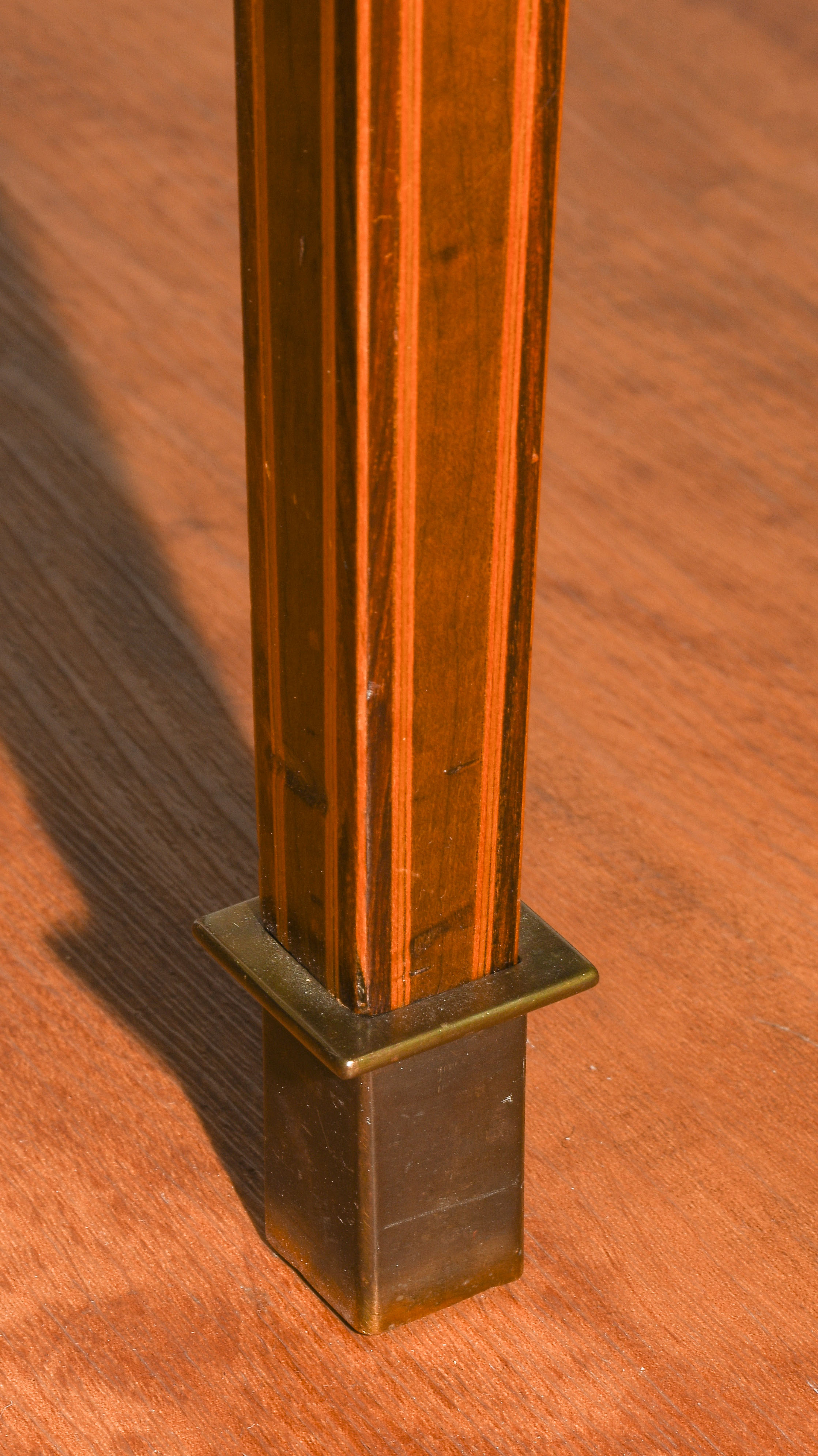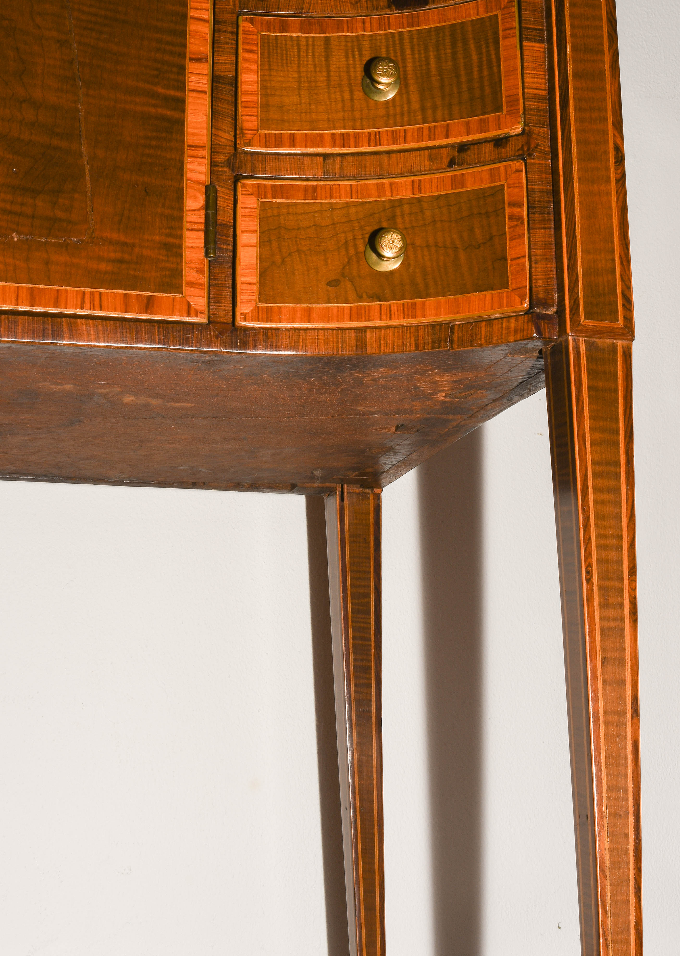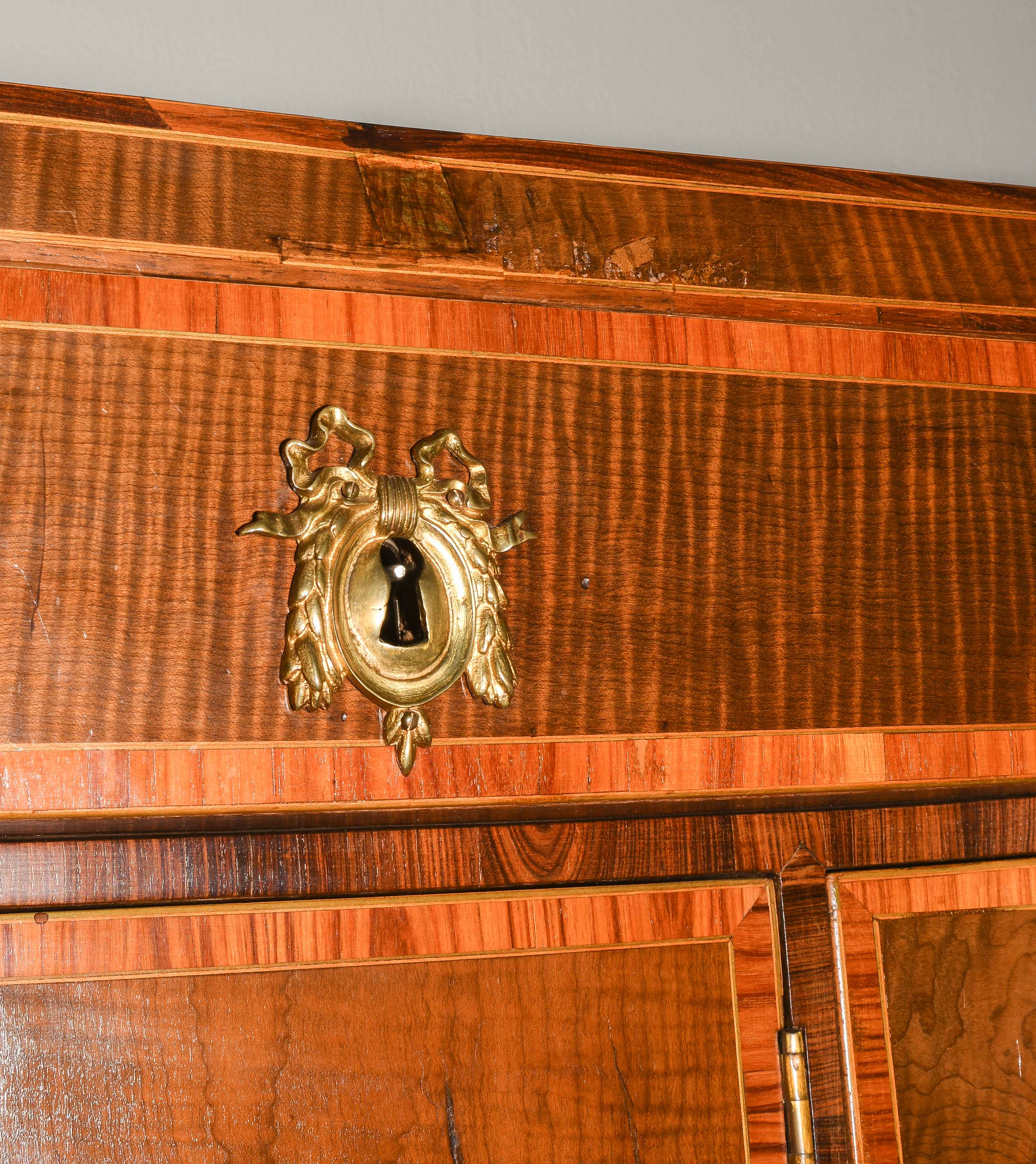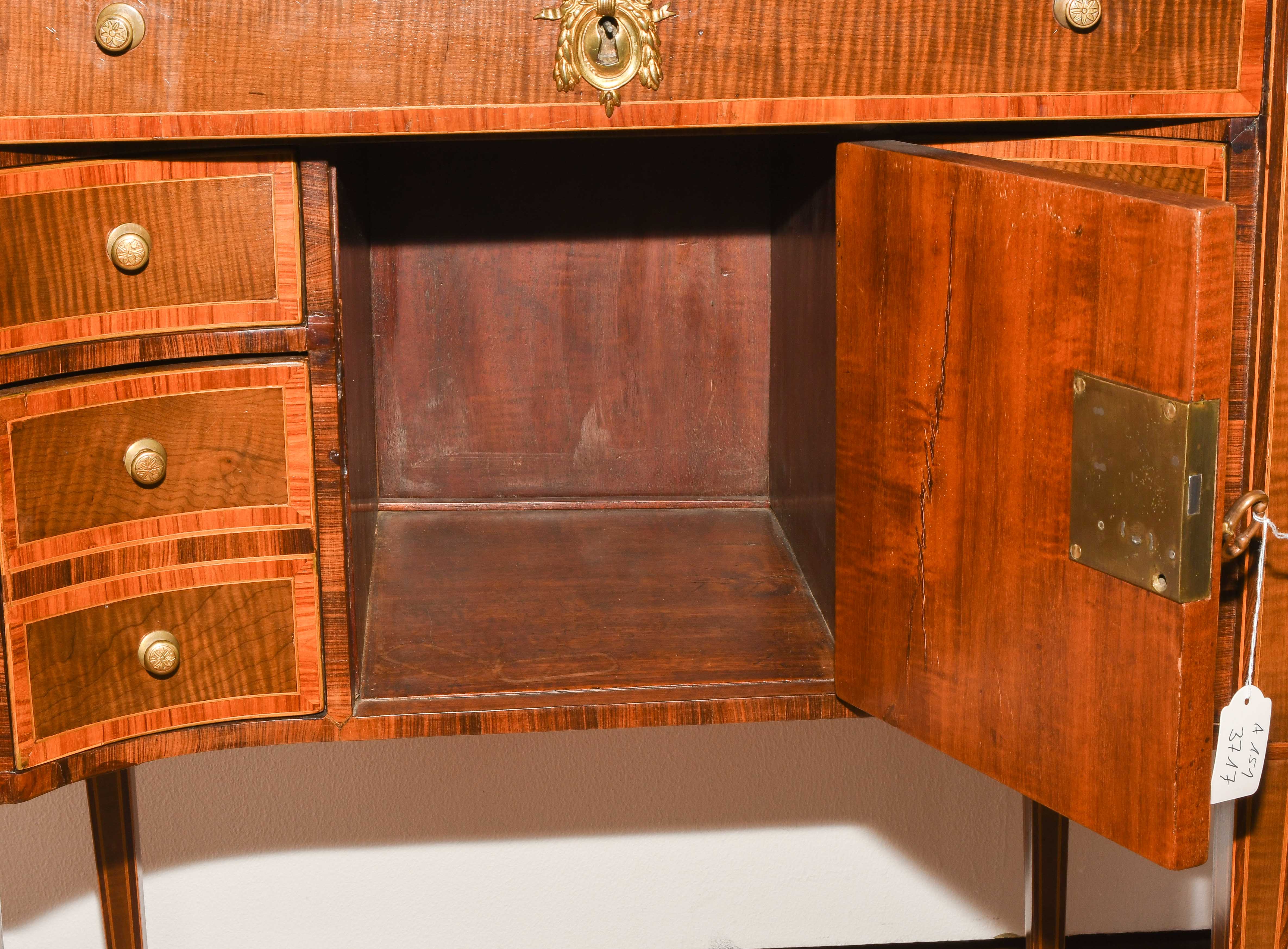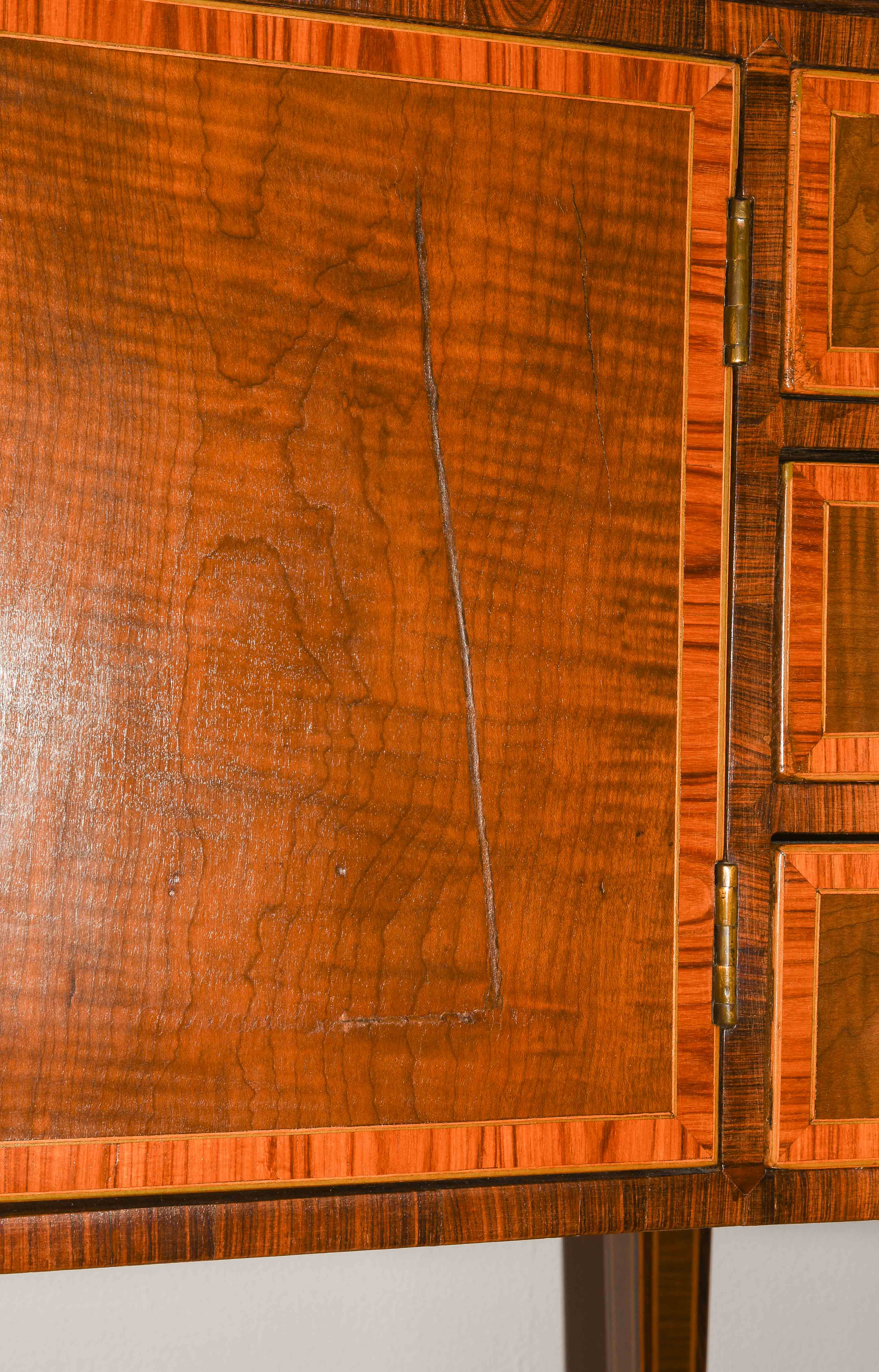 Louis XVI um 1800. Ahorn, Palisander, Rosenholz. Rechteckiger Korpus mit fünf Schubladen, auf hohen schlanken Beinen mit zentraler Türe. Umseitig gefeldert furniert und mit Kontrastbändern belegt. Aufzufrischen. 64x47x85 cm.