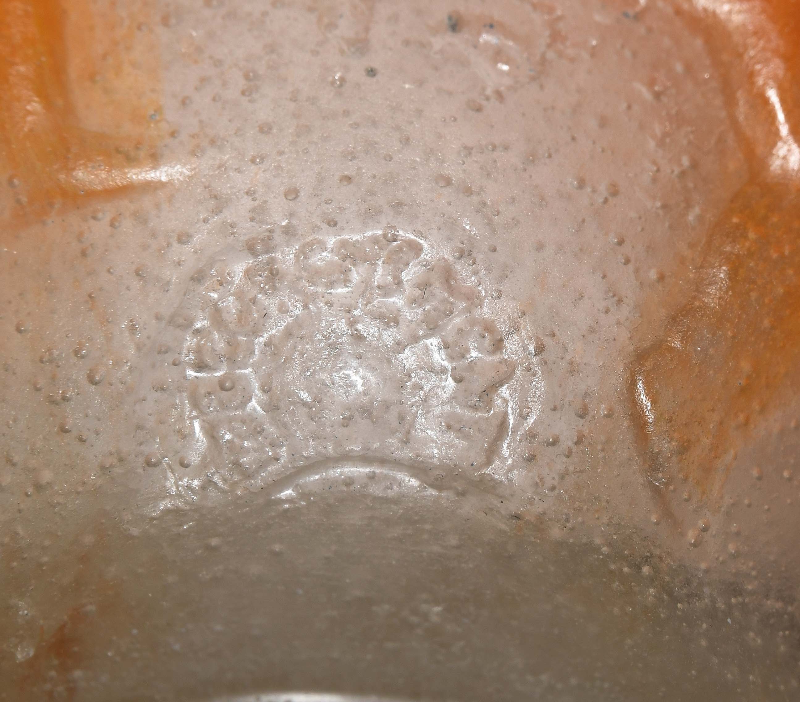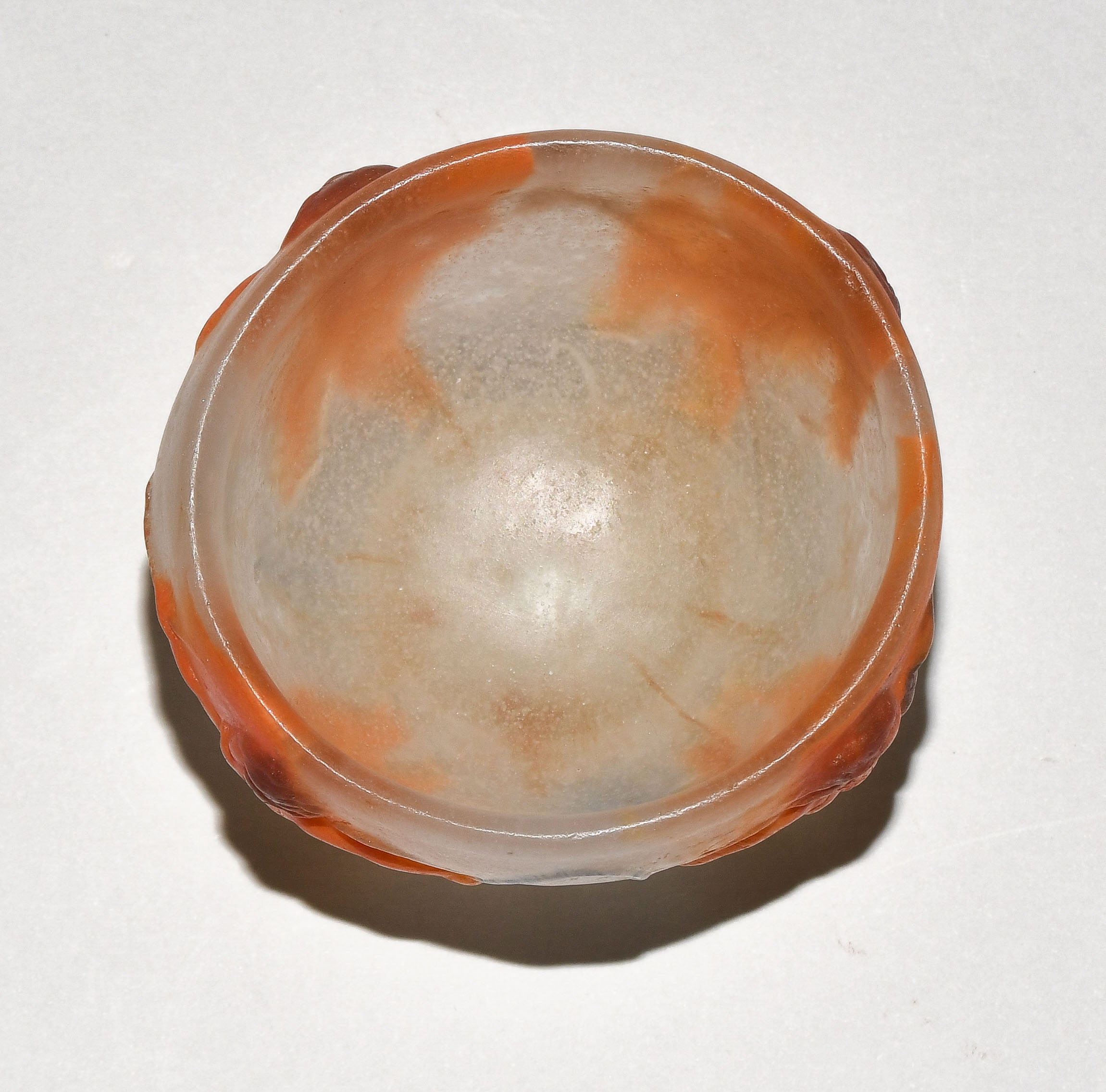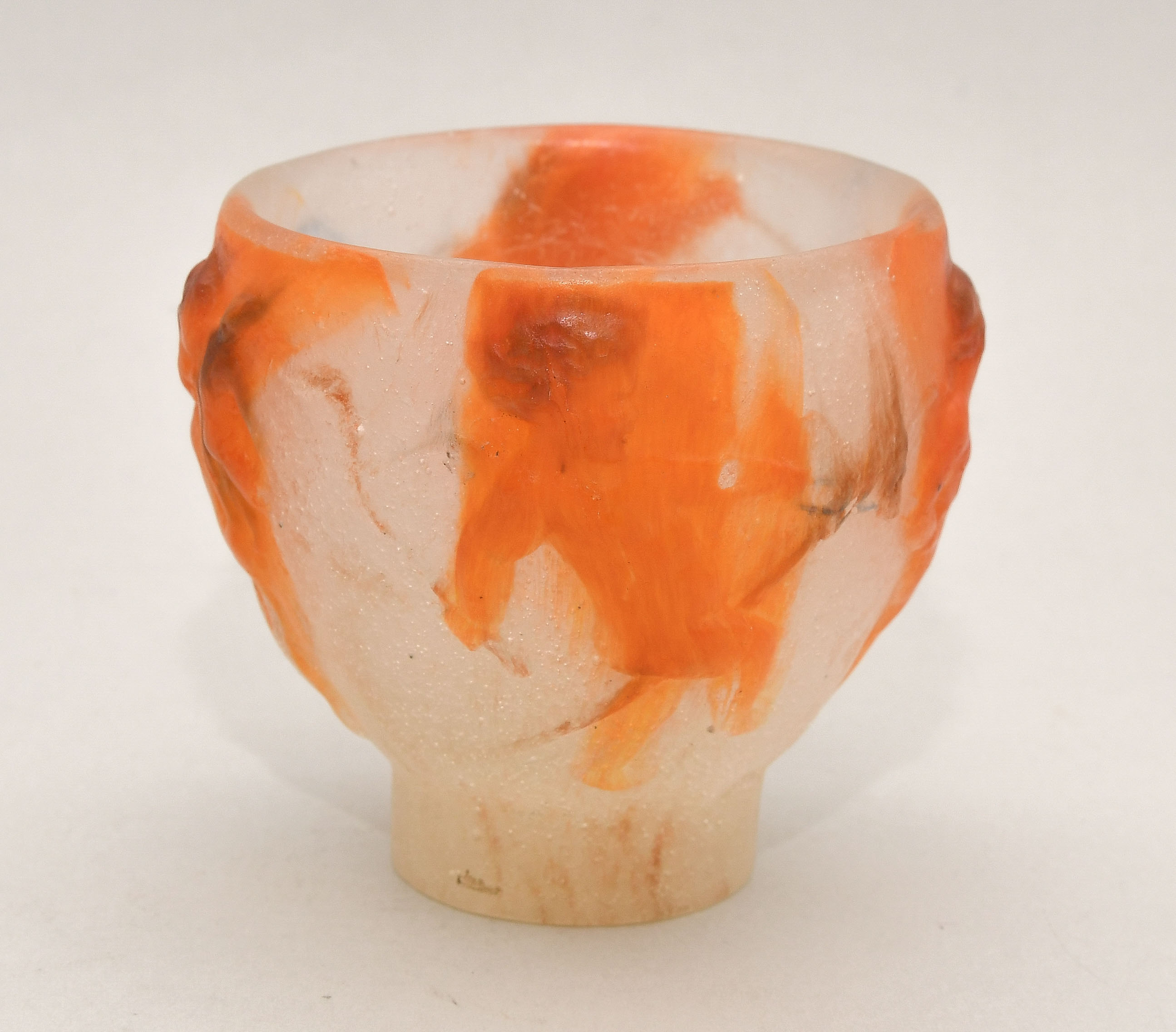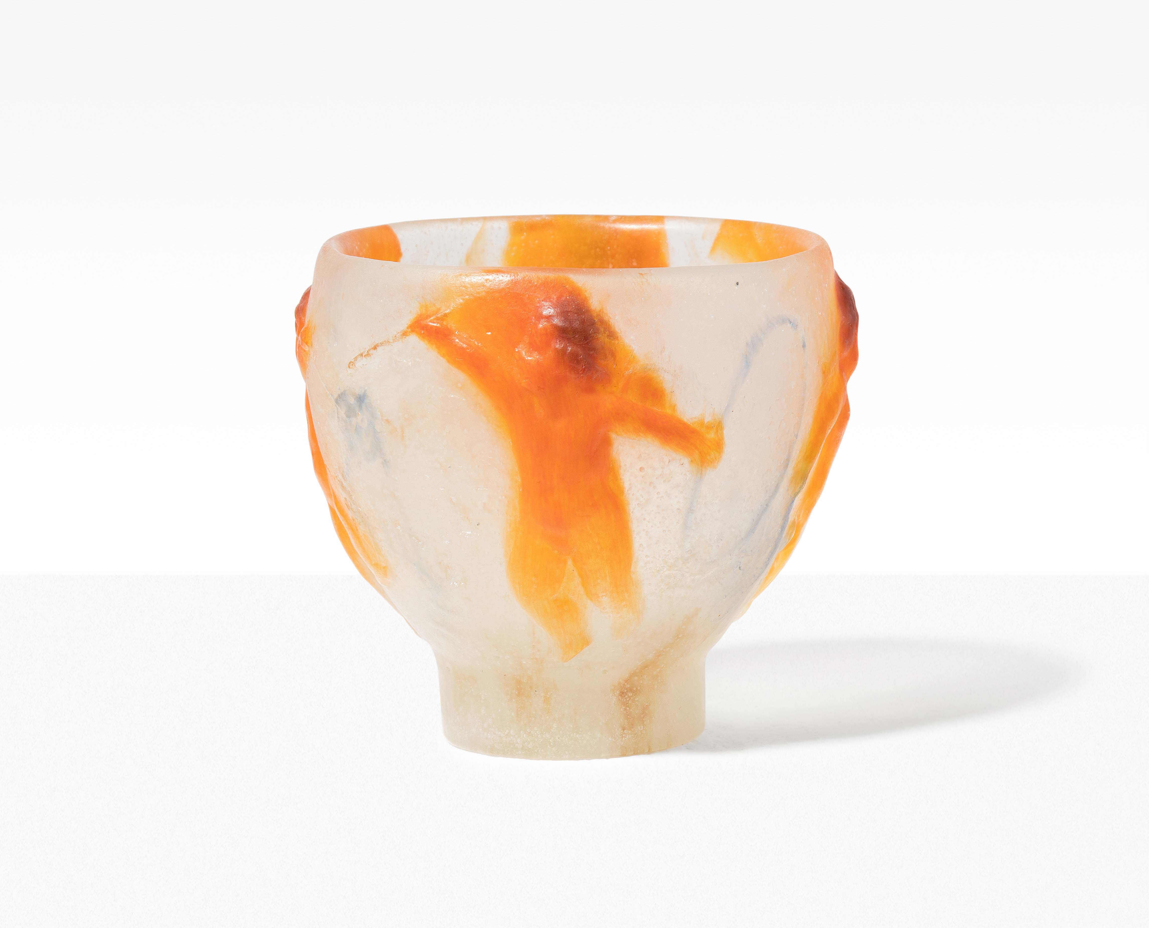 Conches/Eure, um 1920. Vase. Pâte-de-verre in Milchigweiss, Orange und Hellblau, reliefierte Putten mit Reif, Steckenpferd, fliegendem Drachen und Puppen. Bezeichnet: Marke "DECORCHEMENT" (tiefgepresst). H 8 cm.
