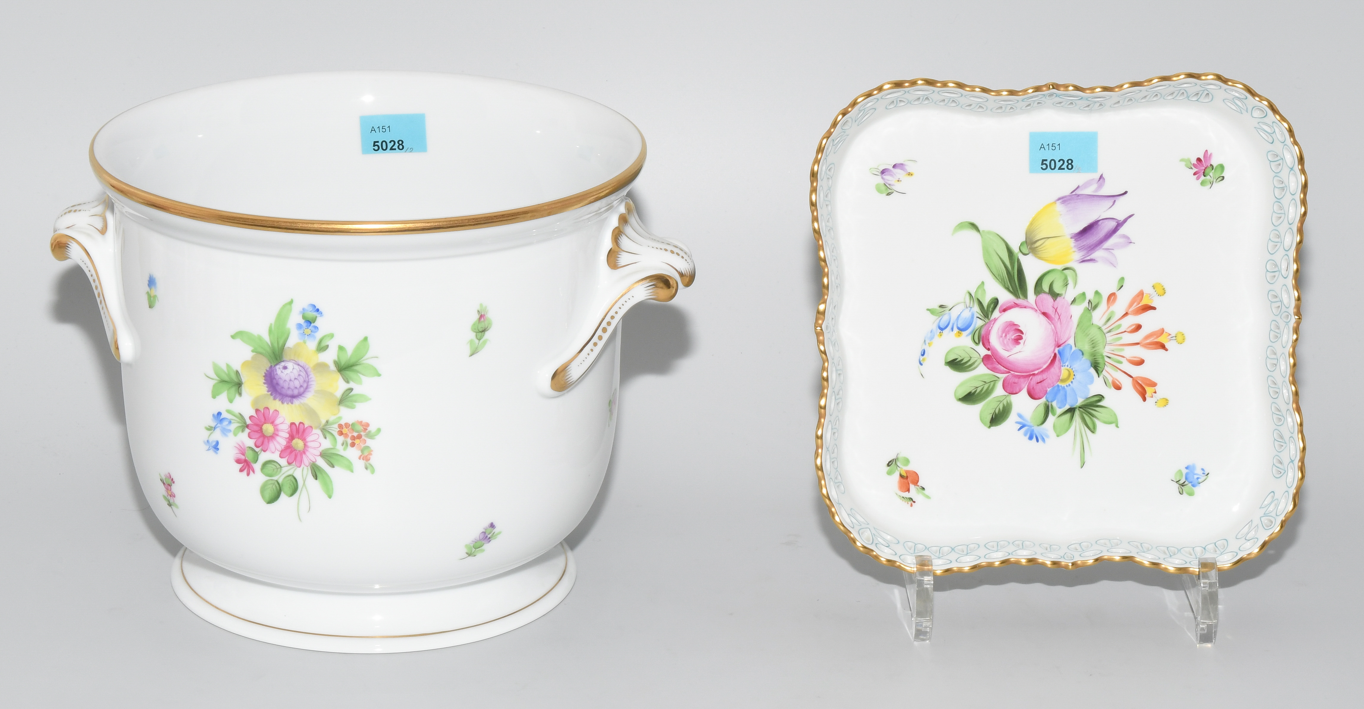 Herend, nach 1945. Porzellan, Dekor Schale "Bouquet de tulipe", Dekor Cachepot "Vieux bouquet de Saxe". Cachepot H 17; Schale 18x18 cm.