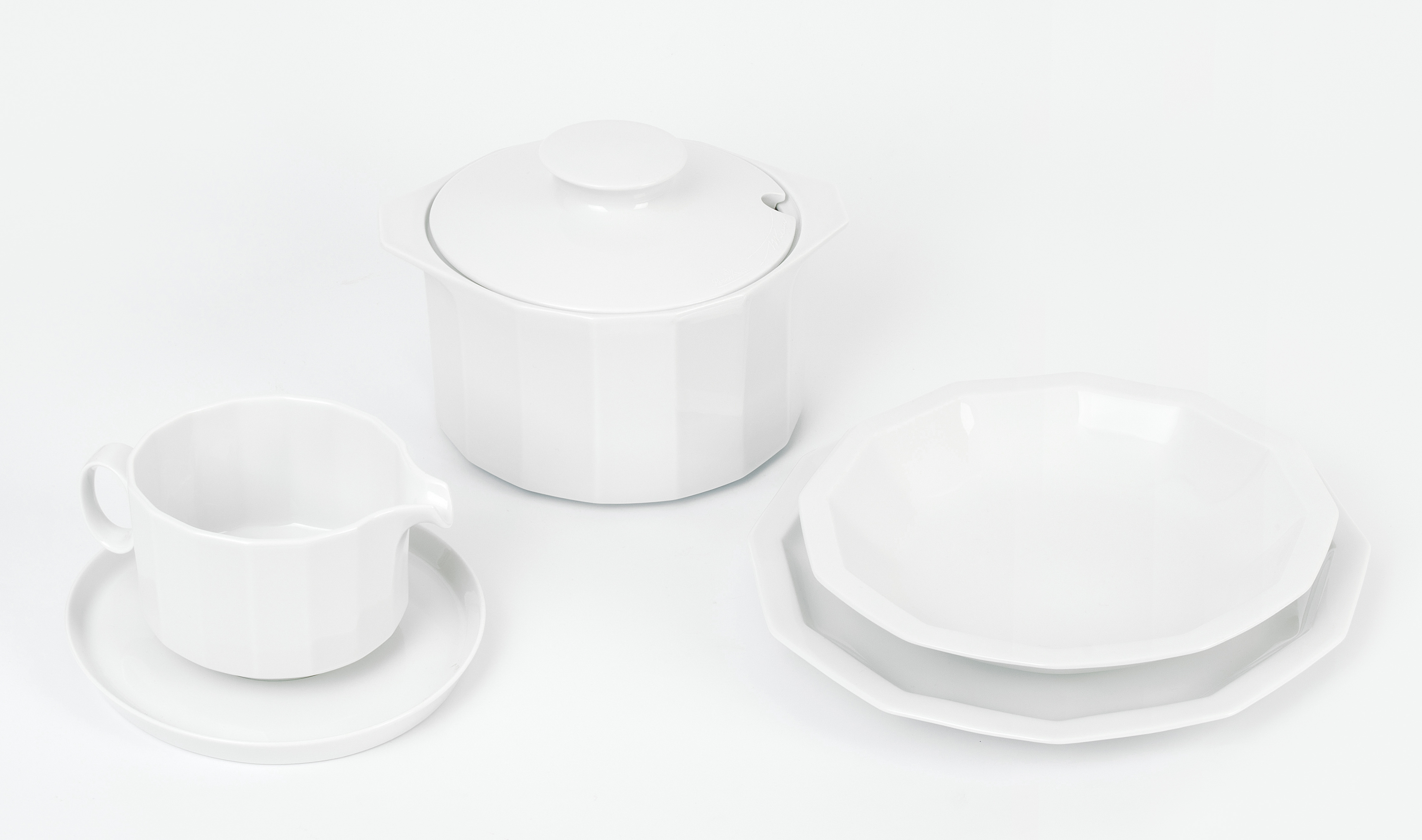 Rosenthal. Erstausformung 1973. Entwurf Form: Tapio Wirkkala. Porzellan weiss. Bezeichnet: Firmenstempel. Bestand: 6 Fleischteller, 6 Suppenteller, 6 Dessertteller, 6 Suppentassen mit U'tassen, 6 kl. Schalen, 1 runde Deckelterrine, 2 runde Schüsseln, 1 achteckiger Tischwärmer mit passendem Spargeleinsatz, 1 Butterdose, 1 Salz- und Pfefferstreuer. Total 38 Teile.