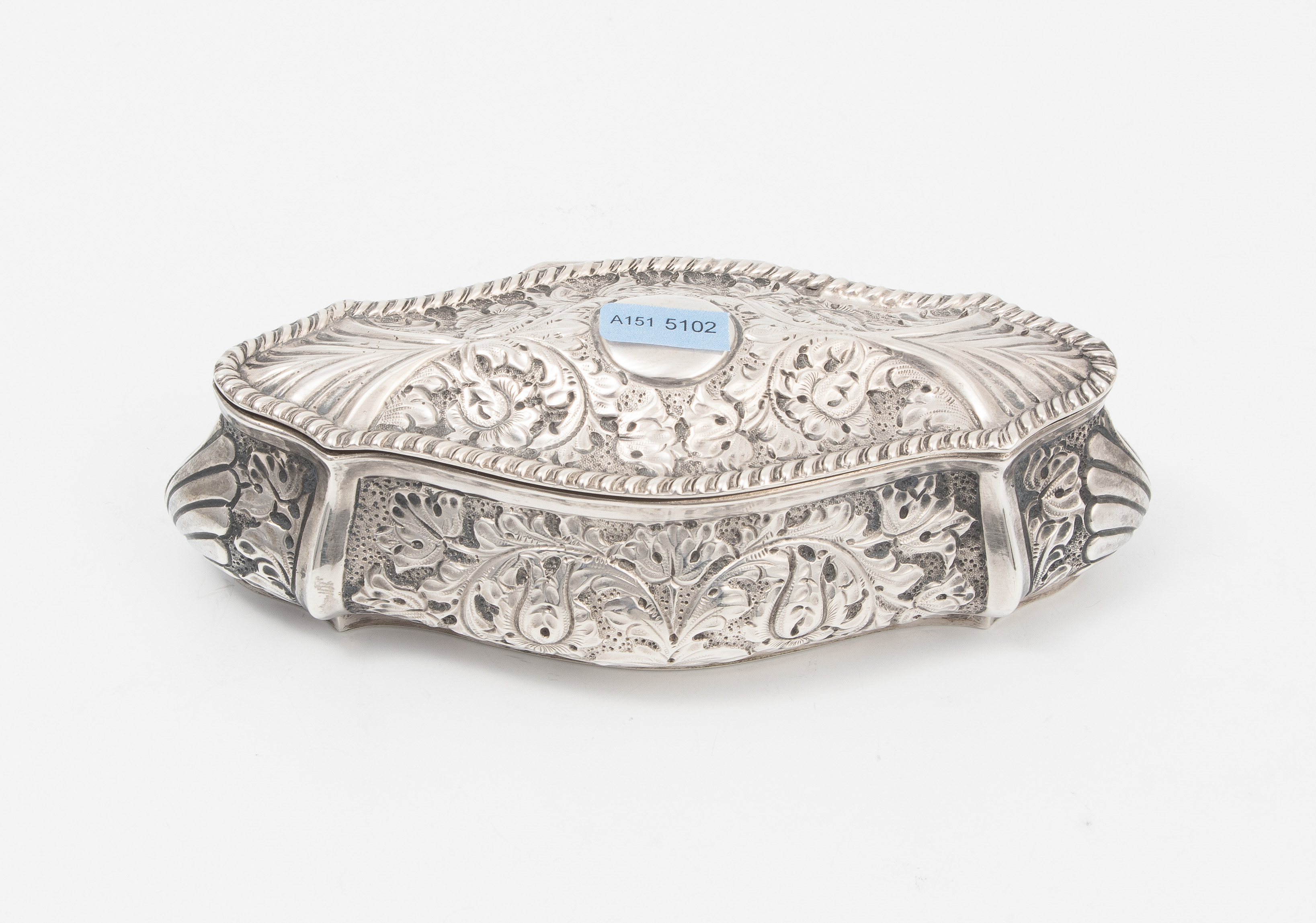 Birmingham, 1909. Silber. Fassonierte Form mit scharniertem Deckel. Allseitig reliefierter Blattdekor. Gemarkt, Feingehalt 925. 14x5x4,5 cm, ca. 106 g.