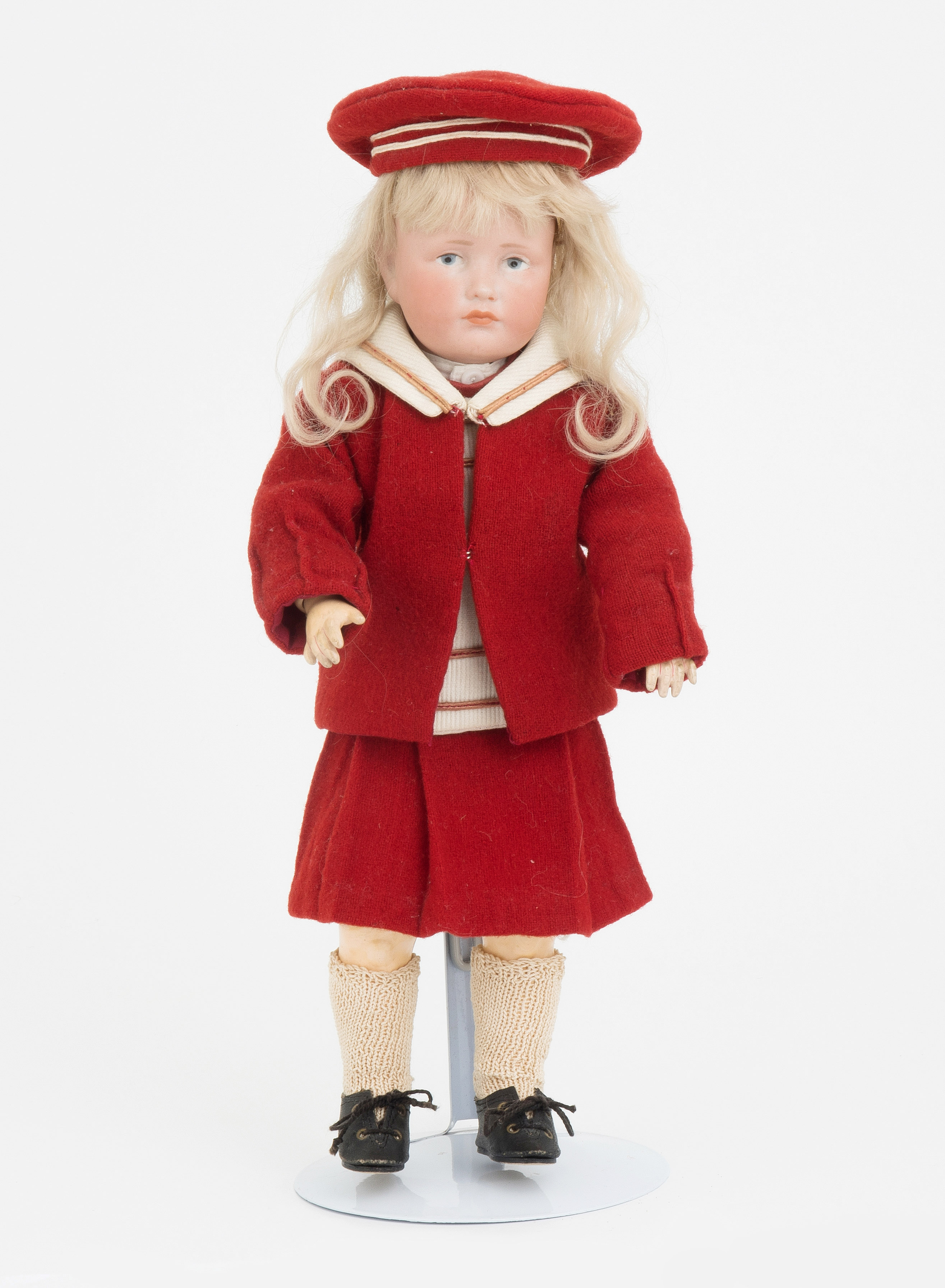 Deutschland, um 1909. Kurbelkopf mit blau gemalten Augen und geschlossenem Mund. Halsmarke: "K &(in Stern) R, 114, 30". Gelenkkörper aus Masse. Blonde Mohairperücke. Bekleidung im alten Stil. H 30 cm.
