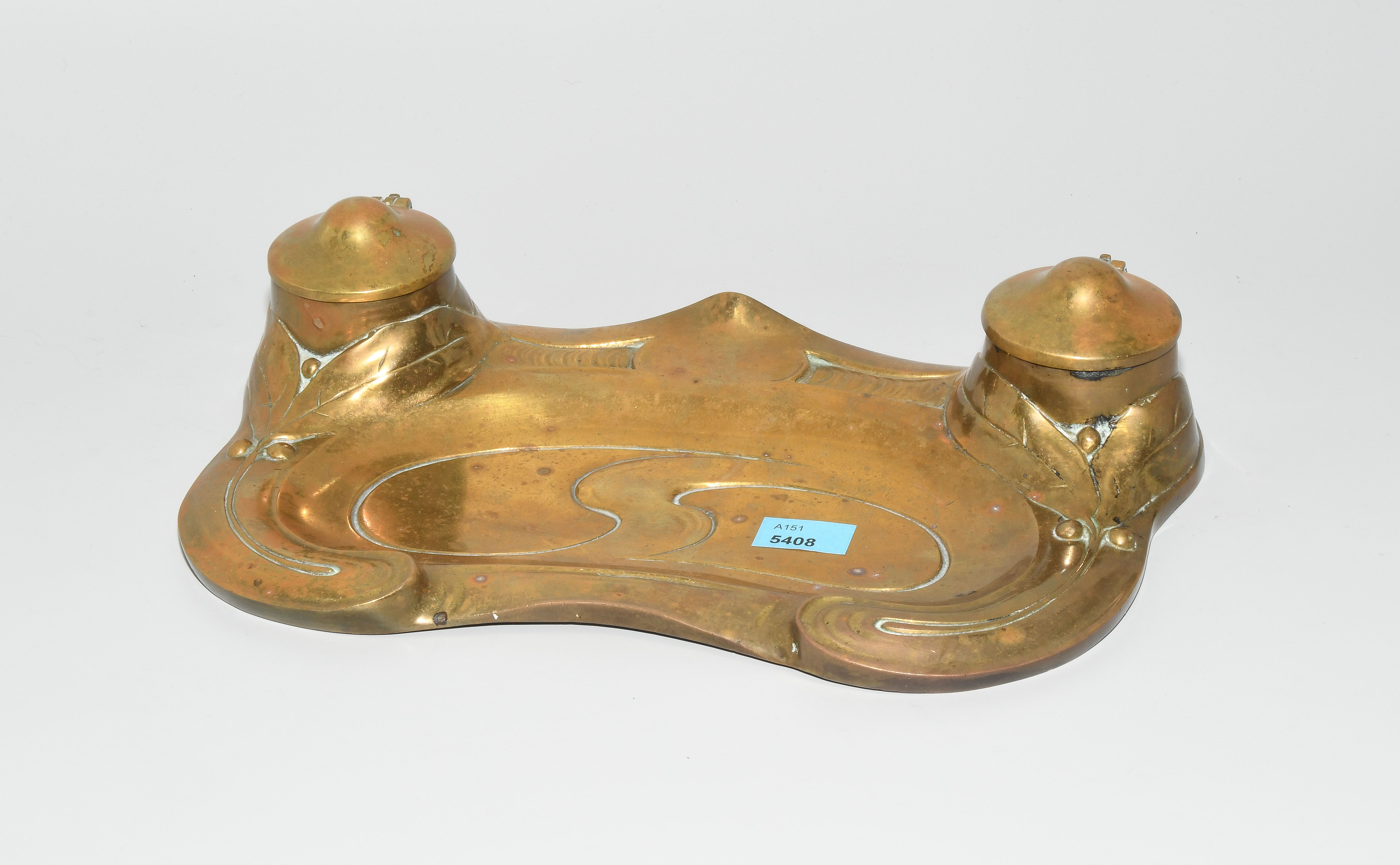 Jugendstil. Messing. Pinselablage mit Tinten- bzw. Sandfässchen mit Glaseinsatz. Reliefdekor. L 27,5 cm.