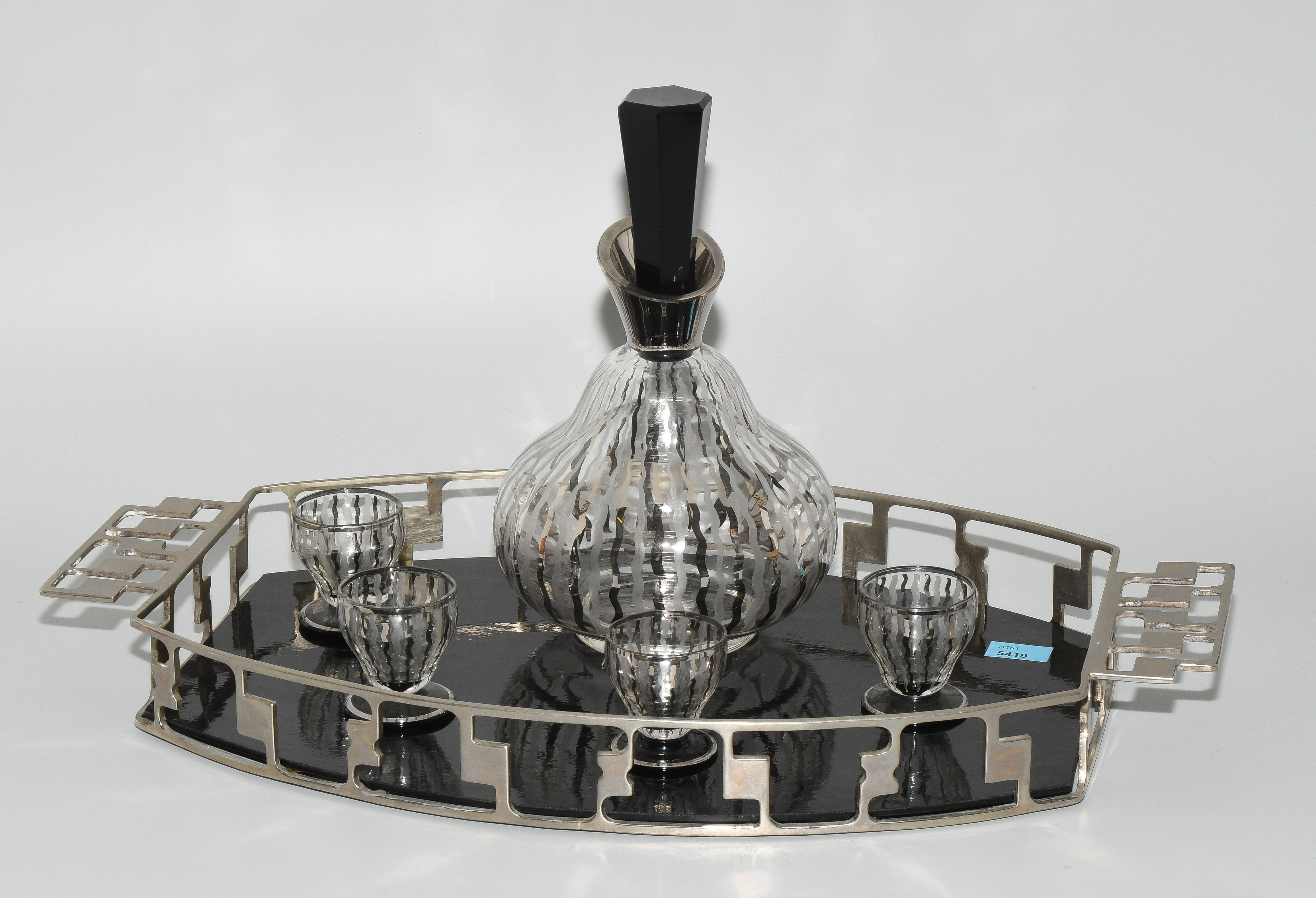 Art Déco. Durchbrochen gearbeitetes, verchromtes Metalltablett mit eingesetztem, schwarzem Glasboden. Karaffe und 4 Schnapsgläschen aus farblosem bzw. schwarzem Glas. L 45 cm (Tablett).