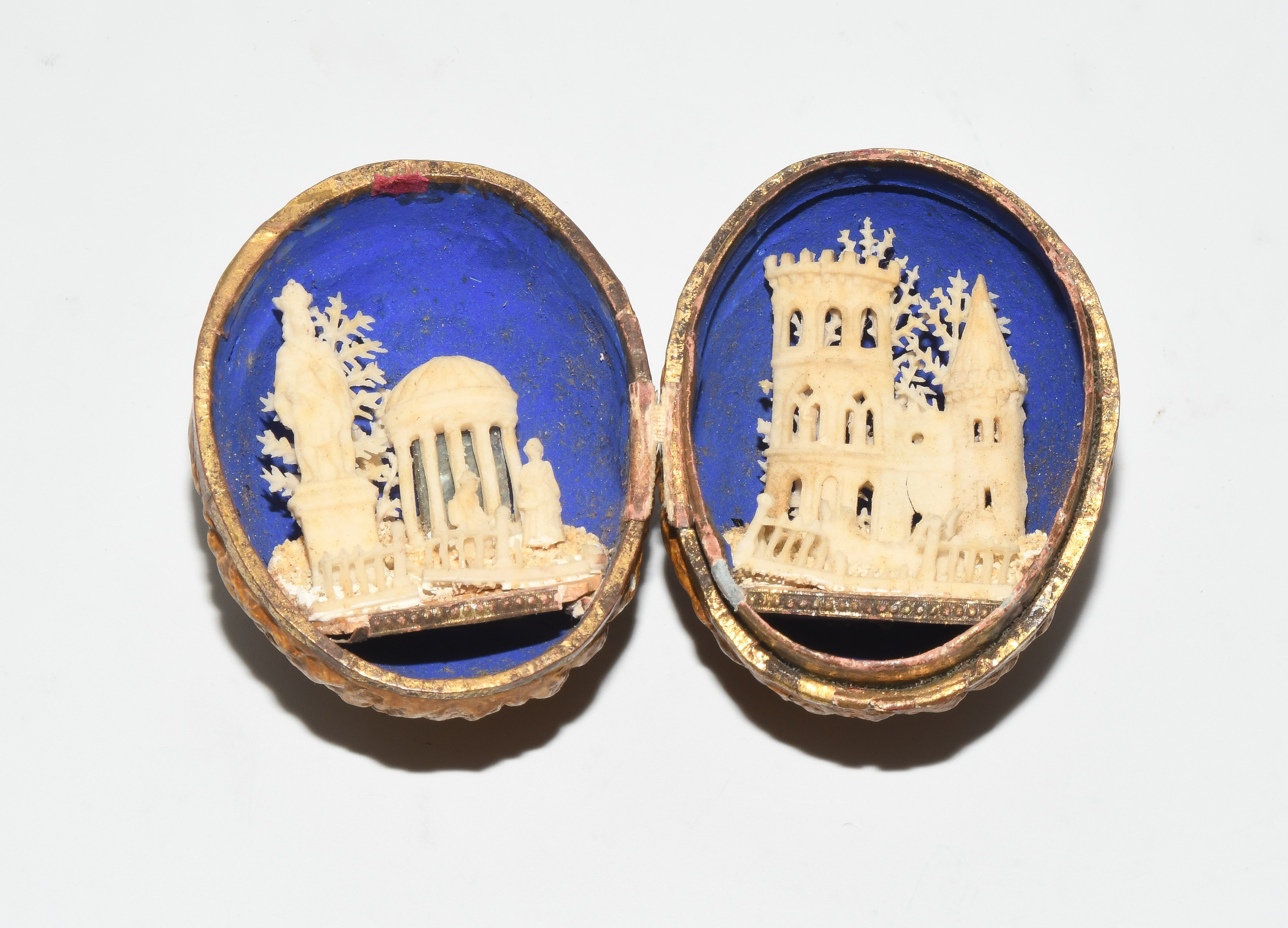 Um 1900. Aufklappbare Nussschale mit Messingmontur. Darin Szene figürliche Szene aus Tragant. H 6,5 cm.
