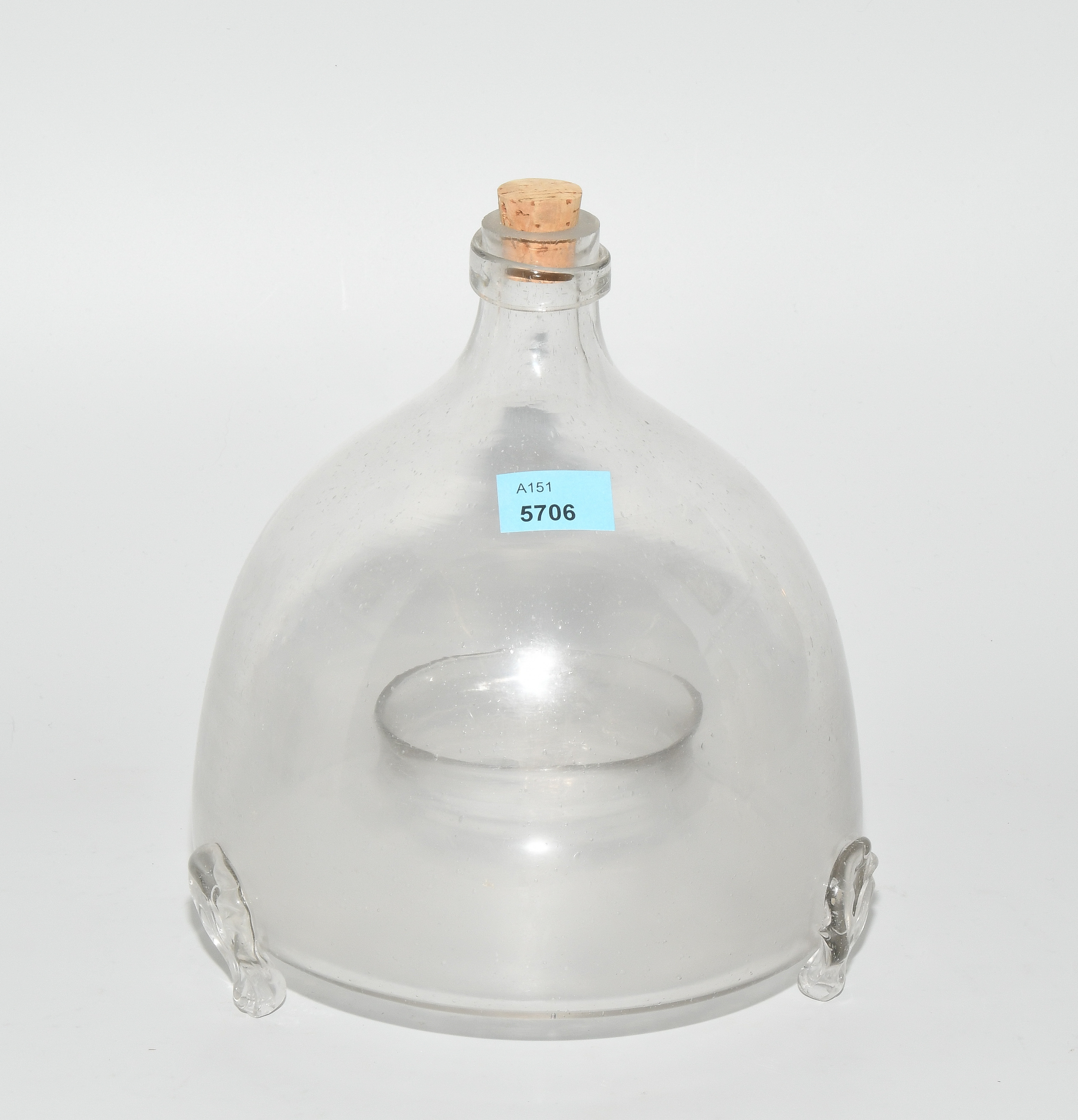 19.Jh. Farlboses Glas. Gefässkörper mit eingezogenem, offenem Boden auf drei applizierten, gekniffenen Füssen. H 18 cm.