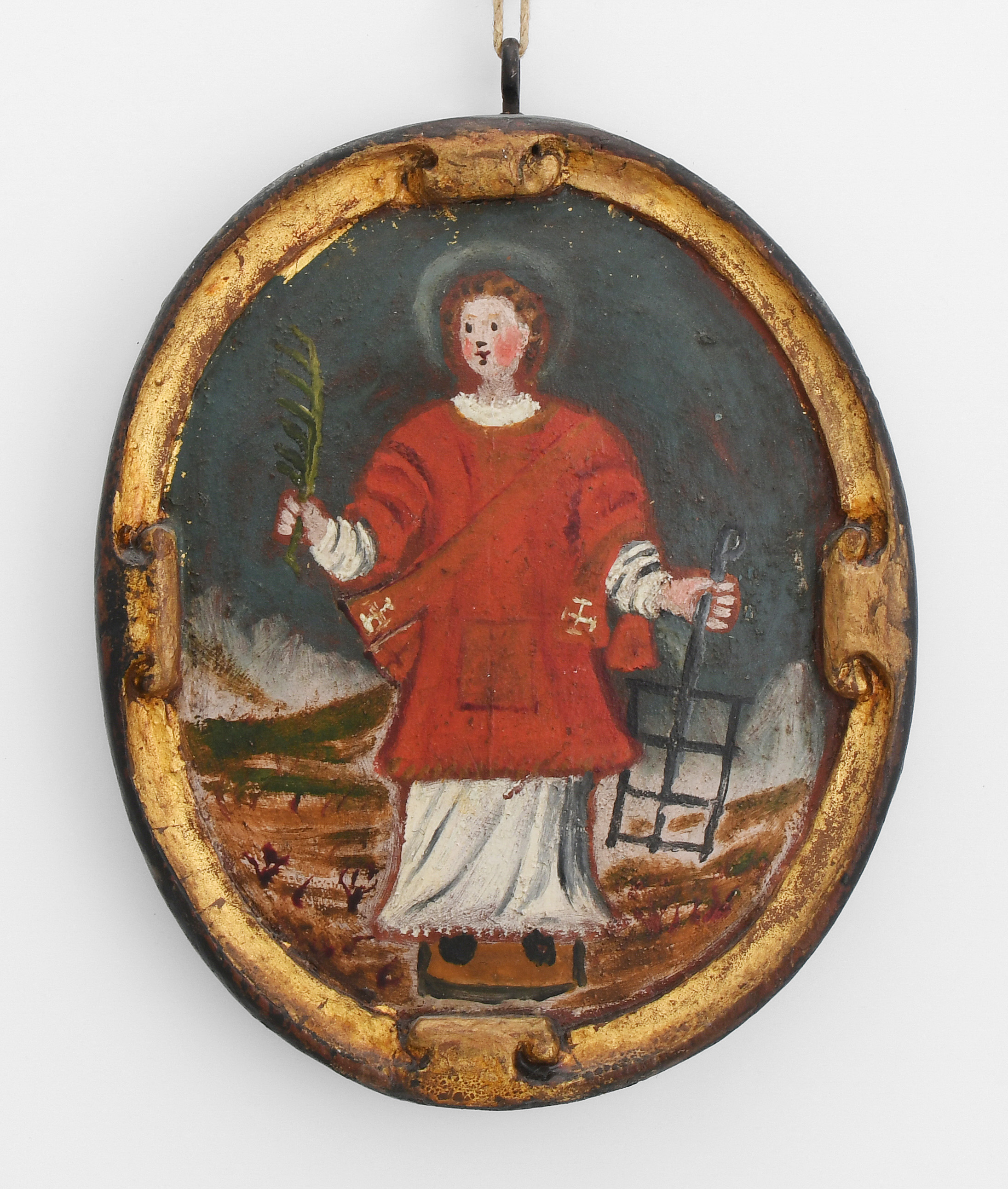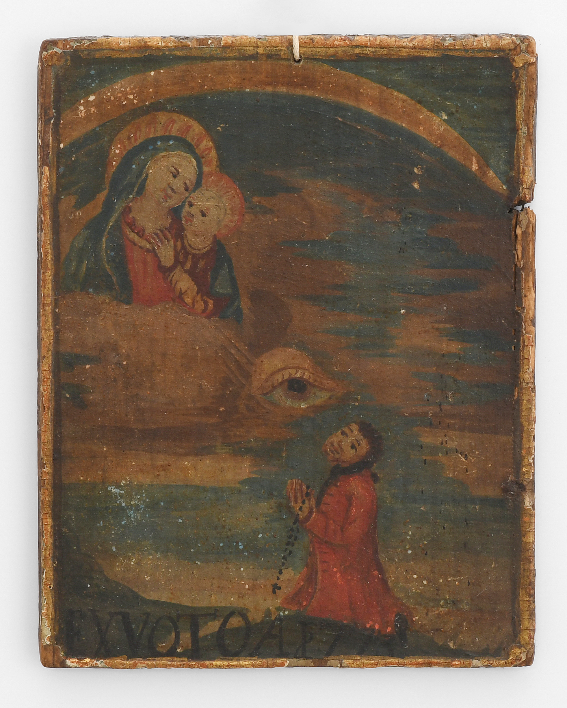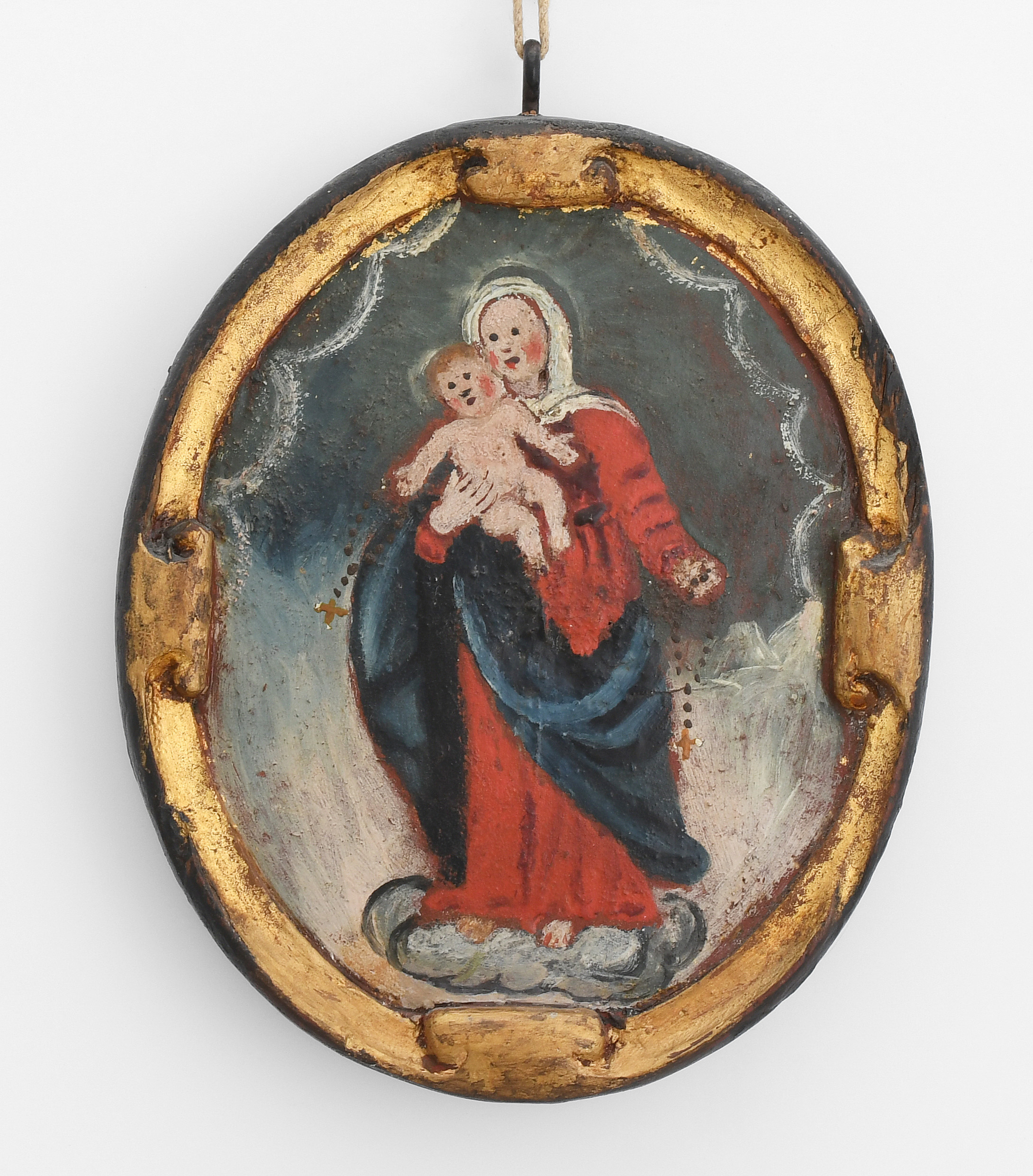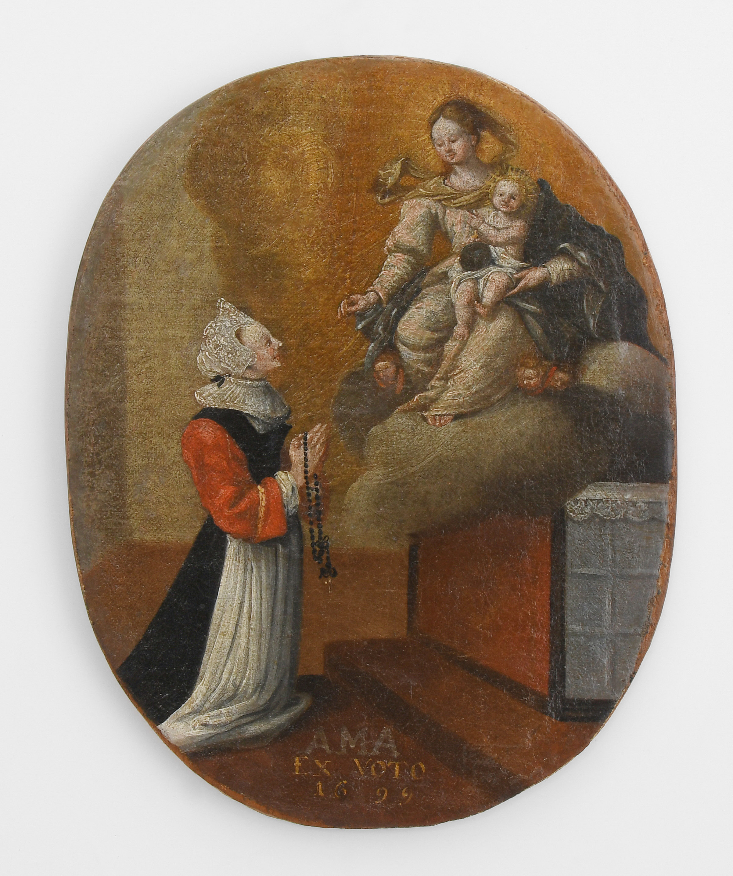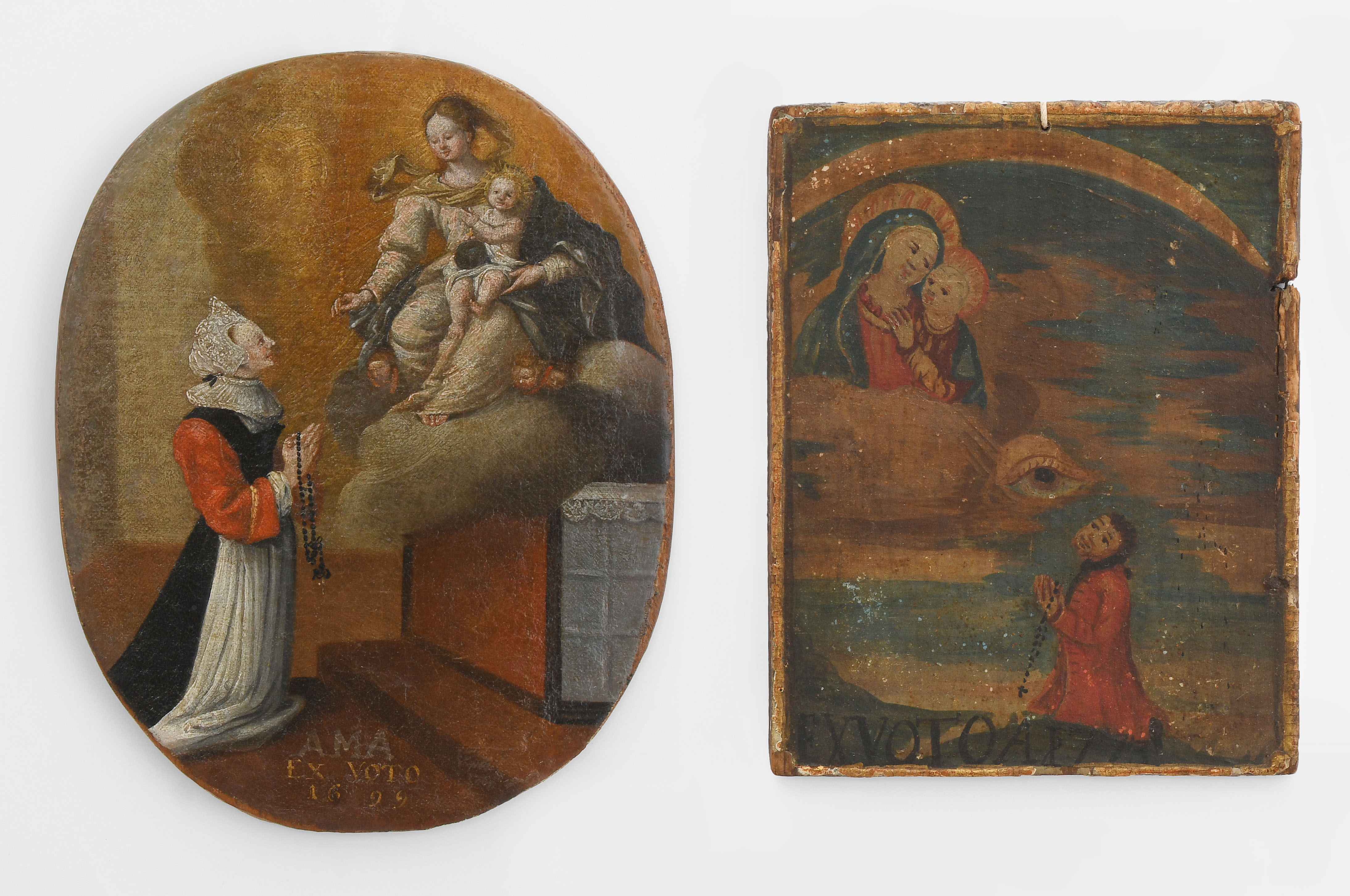Oberitalien, 18.Jh. (1) Öl auf Leinwand, auf ovale Holztafel aufgezogen. In den Wolken thronende Maria mit Kind. Auf den Knien betende Votantin mit Spitzenhaube und Rosenkranz. Inschrift: "AMA EX VOTO 1699". 25x20 cm. (2) Öl auf Holz. Hochrechteckig. In den Wolken Maria mit Kind. Auf den Knien betender Votant mit Rosenkranz. Inschrift: "EX VOTO 1773". 17,5x13,5 cm. Dazu: Andachtsbild. Öl auf Holz, beidseitig bemalt. Oval. Maria mit Kind bzw. Hl. Laurentius. 17x14 cm.