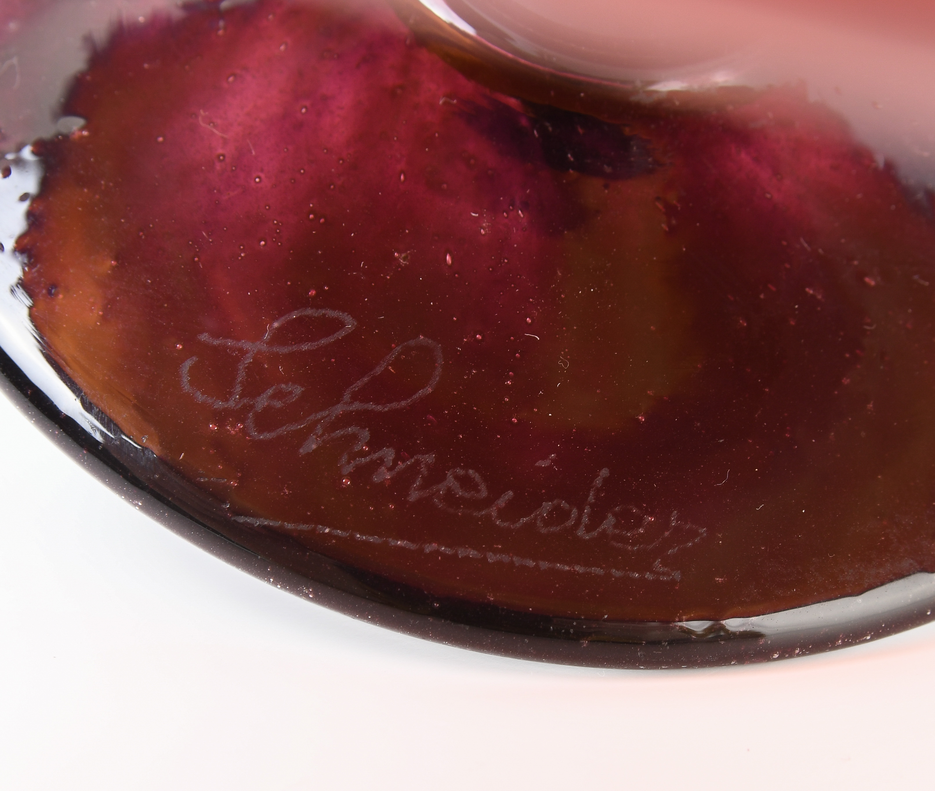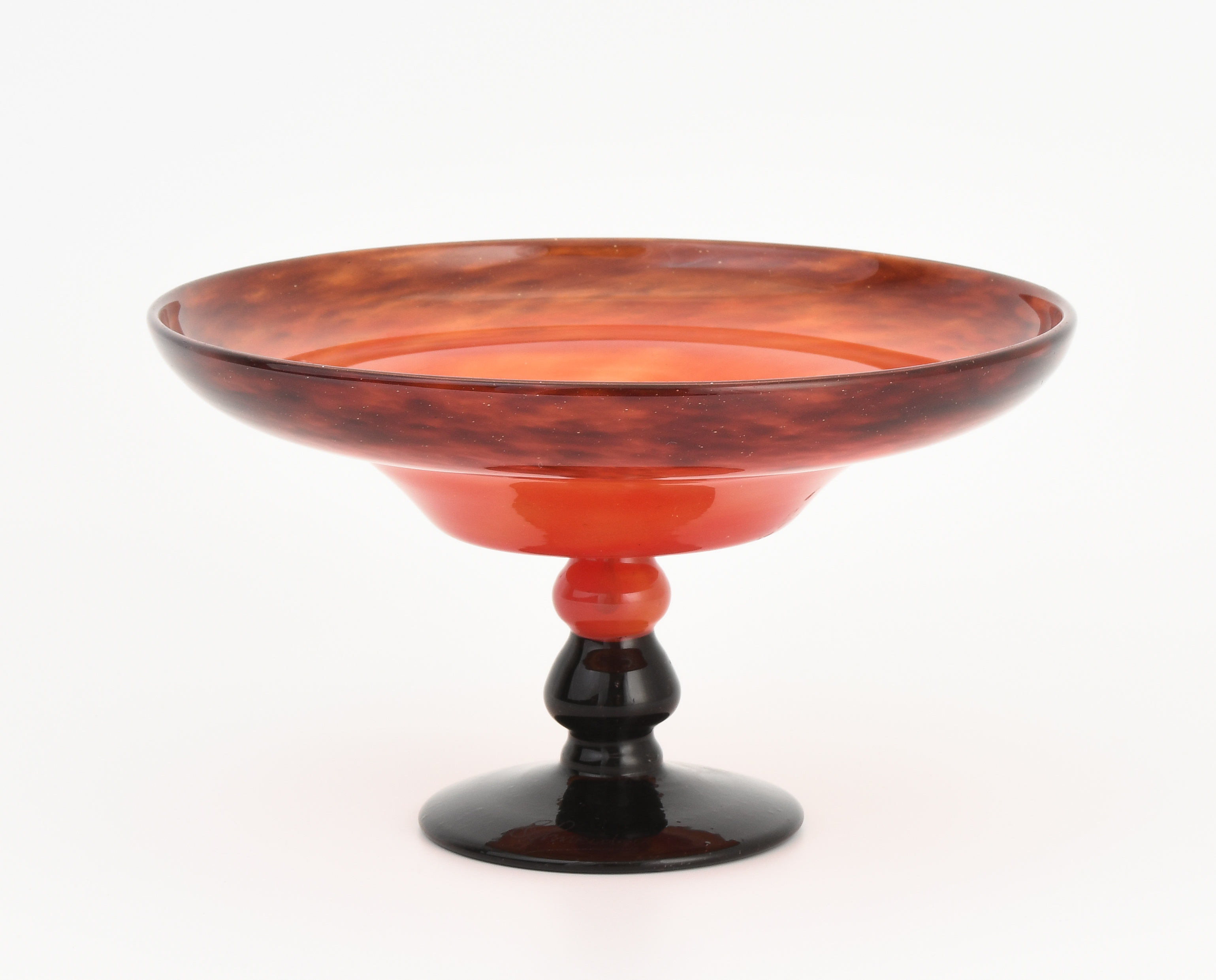 Epinay-sur-Seine, um 1925. Fussschale. Farbloses Glas mit violetten Pulvereinschmelzungen, Fuss aus violettem Glas. Bezeichnet: Schneider (Nadelätzung). H 12 cm.
