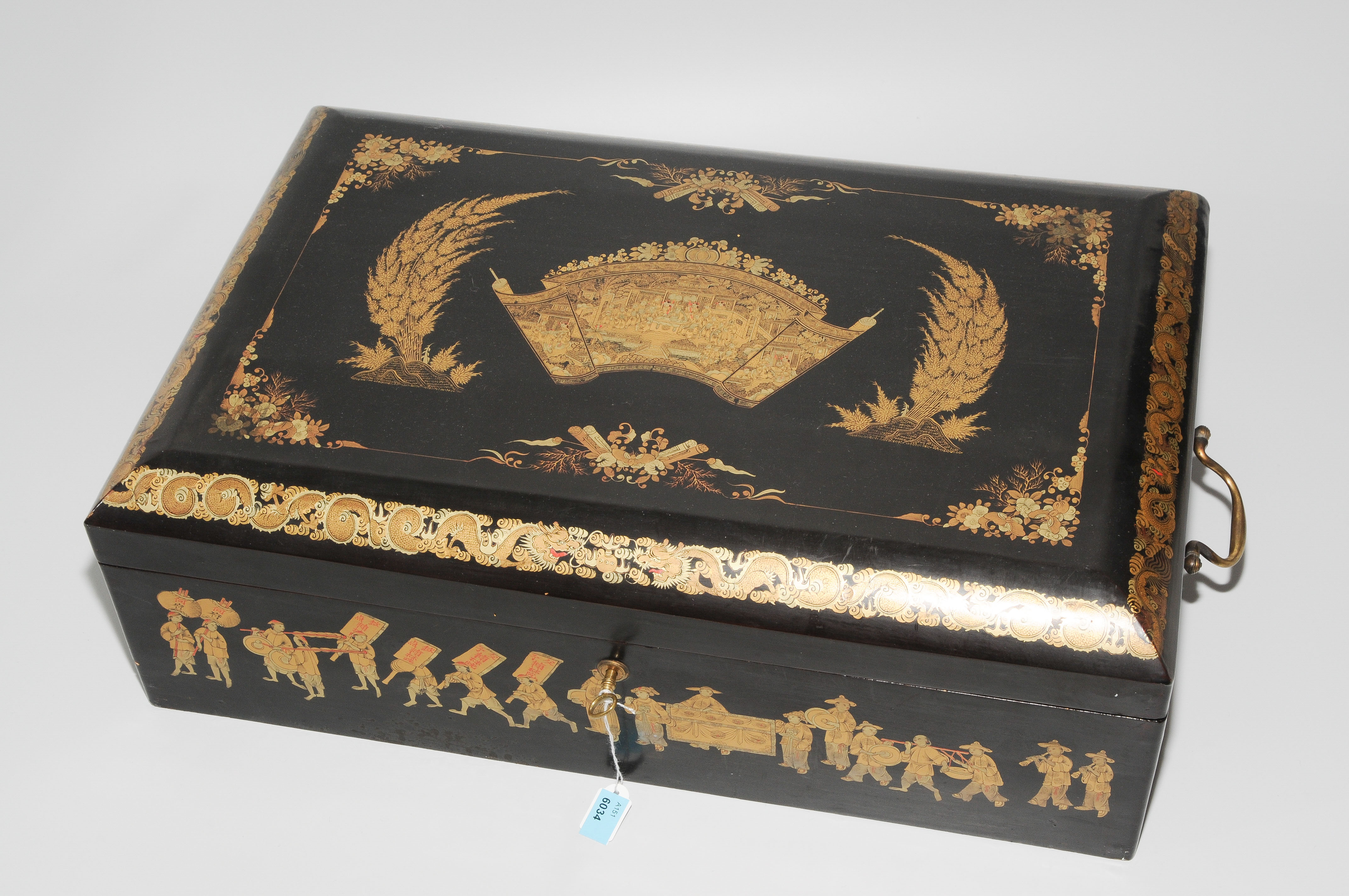 China, um 1900. Holz mit Lackmalerei. Rechteckiger Corpus mit Scharnierdeckel und seitlichen Traghenkel. Allseitig mit Goldfarben auf schwarzem Grund bemalt mit feinem Figurendekor, Umzugszenen und Drachenbordüre. Schlüssel vorhanden. 50x32x16,5 cm. - Altersspuren.