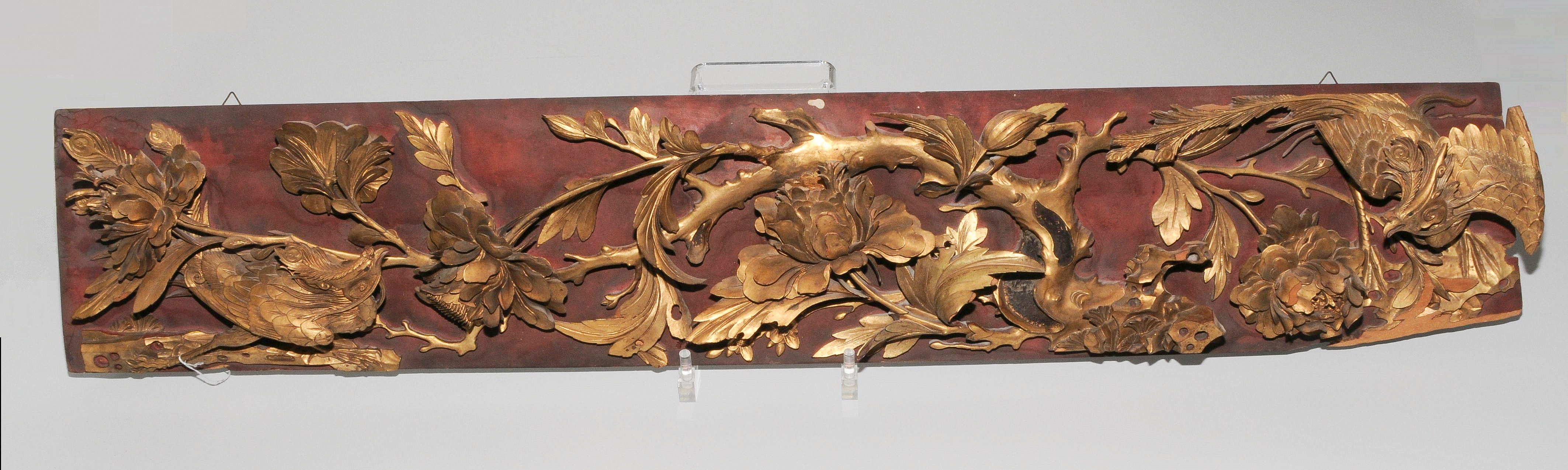 China, um 1900. Holz, vergoldet und lackiert. Relief mit zwei Phönixen und Päonienzweig mit vier vollen Blüten. L 112,5 cm. - Schadstellen.