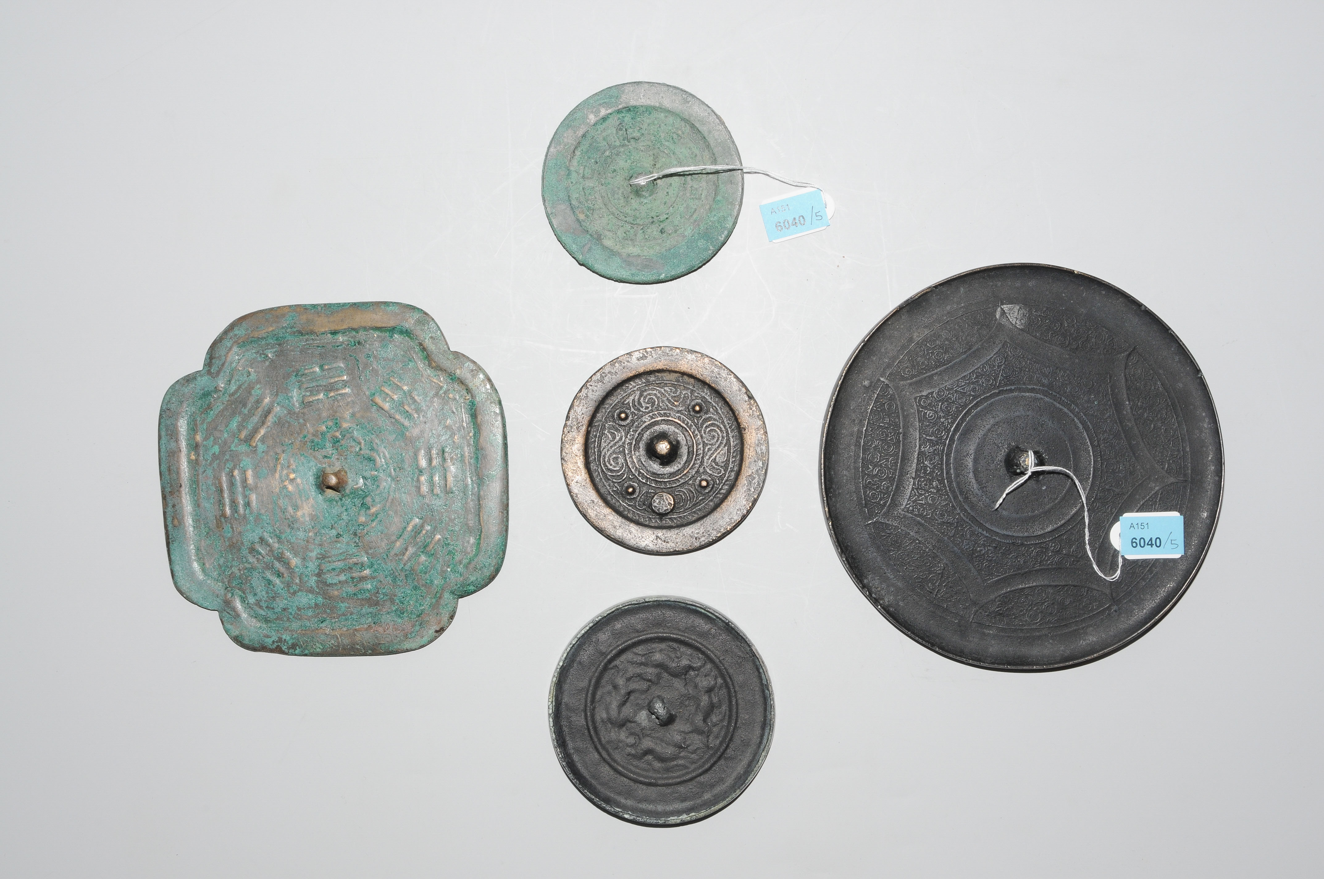 China. Bronze. Ein grosser, drei kleine sowie ein passig geschwungener Spiegel. Ø 8–16 cm. - Patina.
