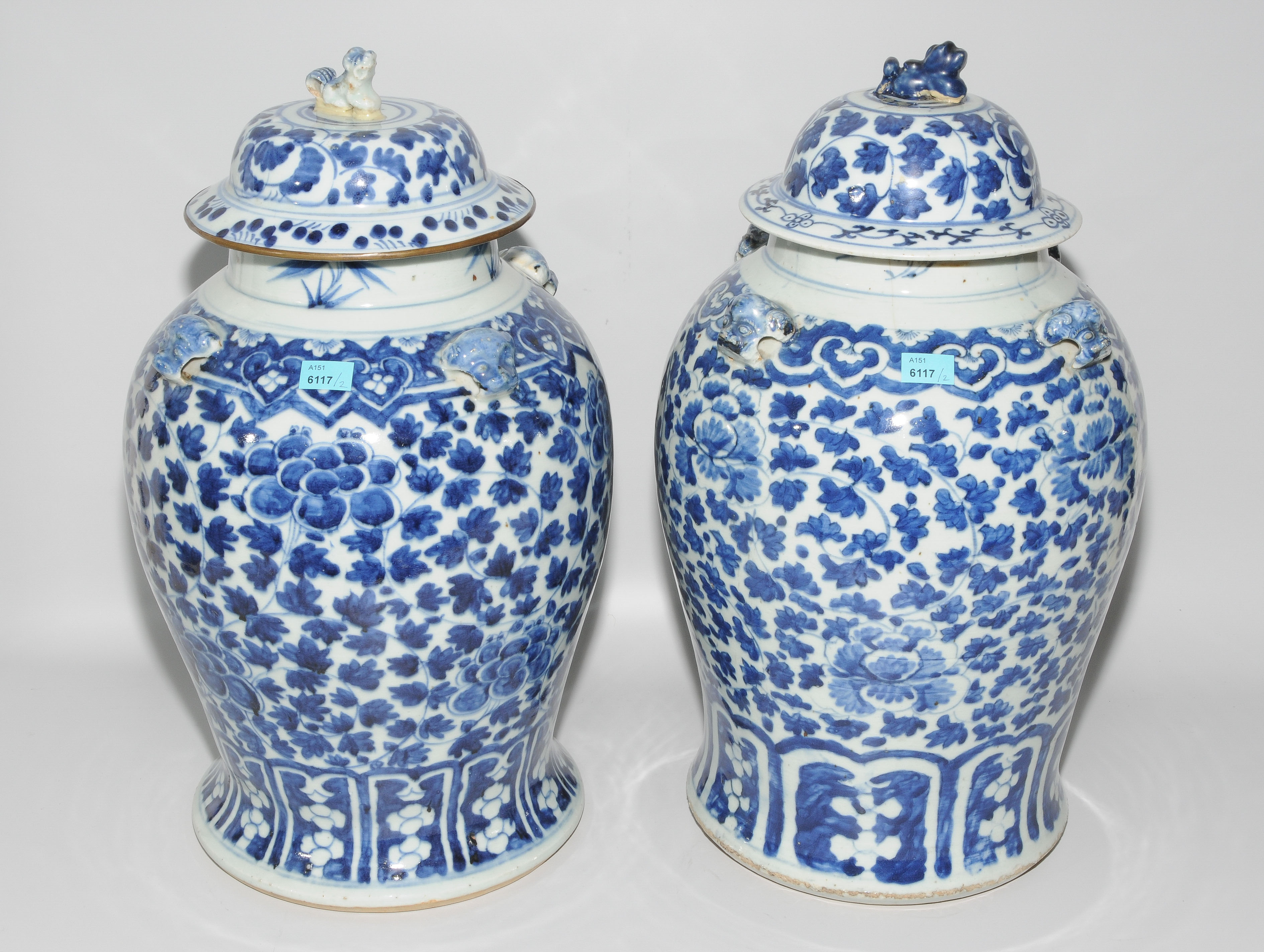 China, 20.Jh. Blau-Weiss-Porzellan. Balusterform mit floralem Rankendekor. Auf den Schultern vier plastische Löwenköpfe mit Löcher für Ringhenkel. Deckel mit plastischem Fo-Hund als Knauf. H 44 cm. - Restauriert.