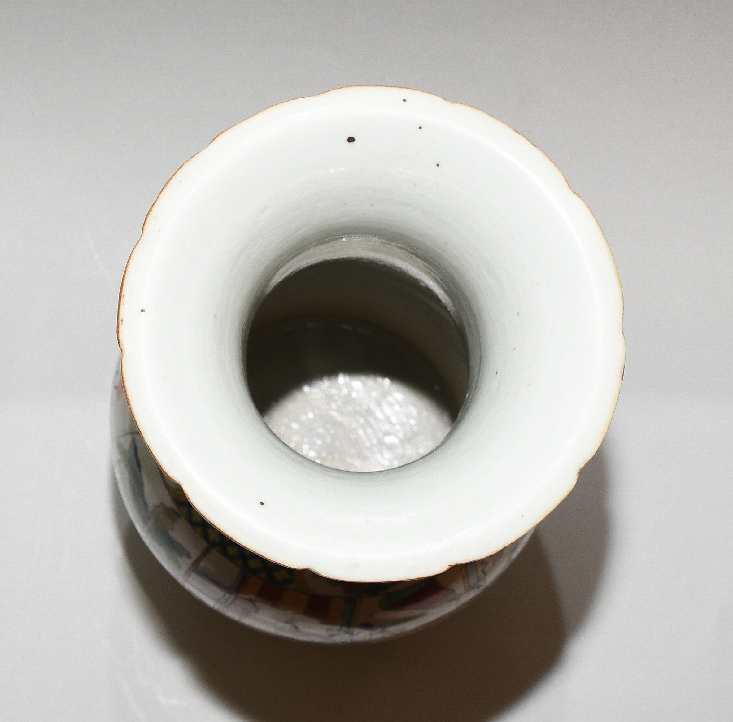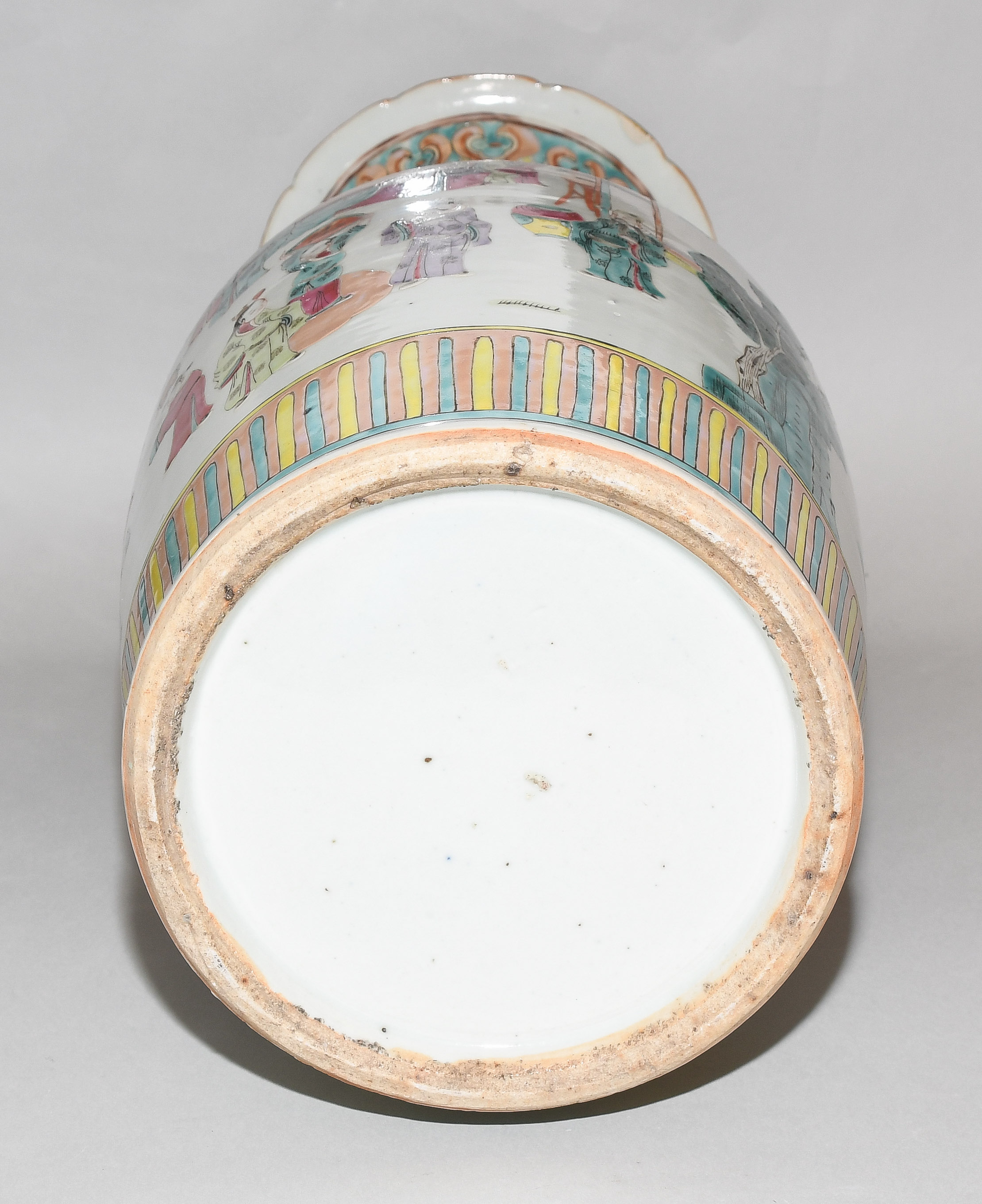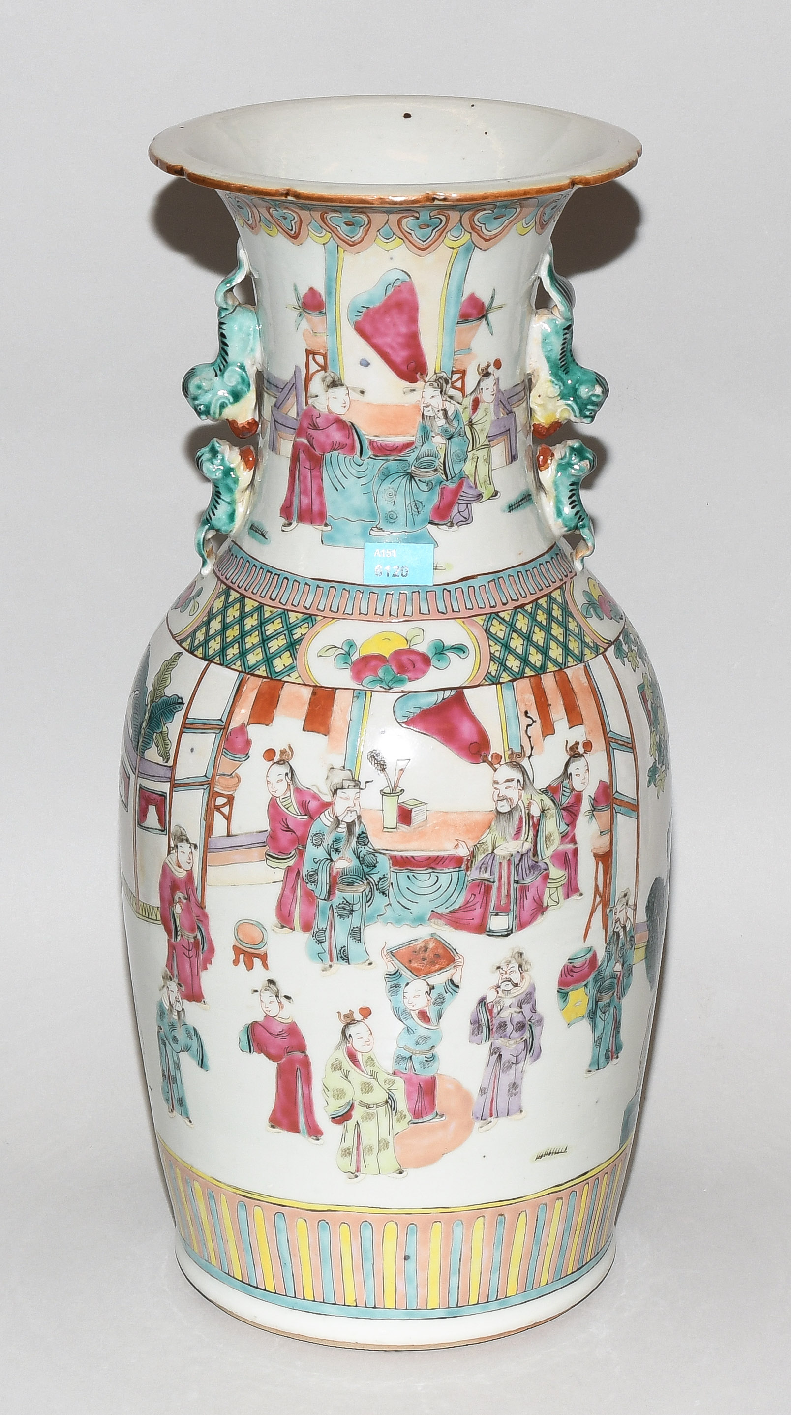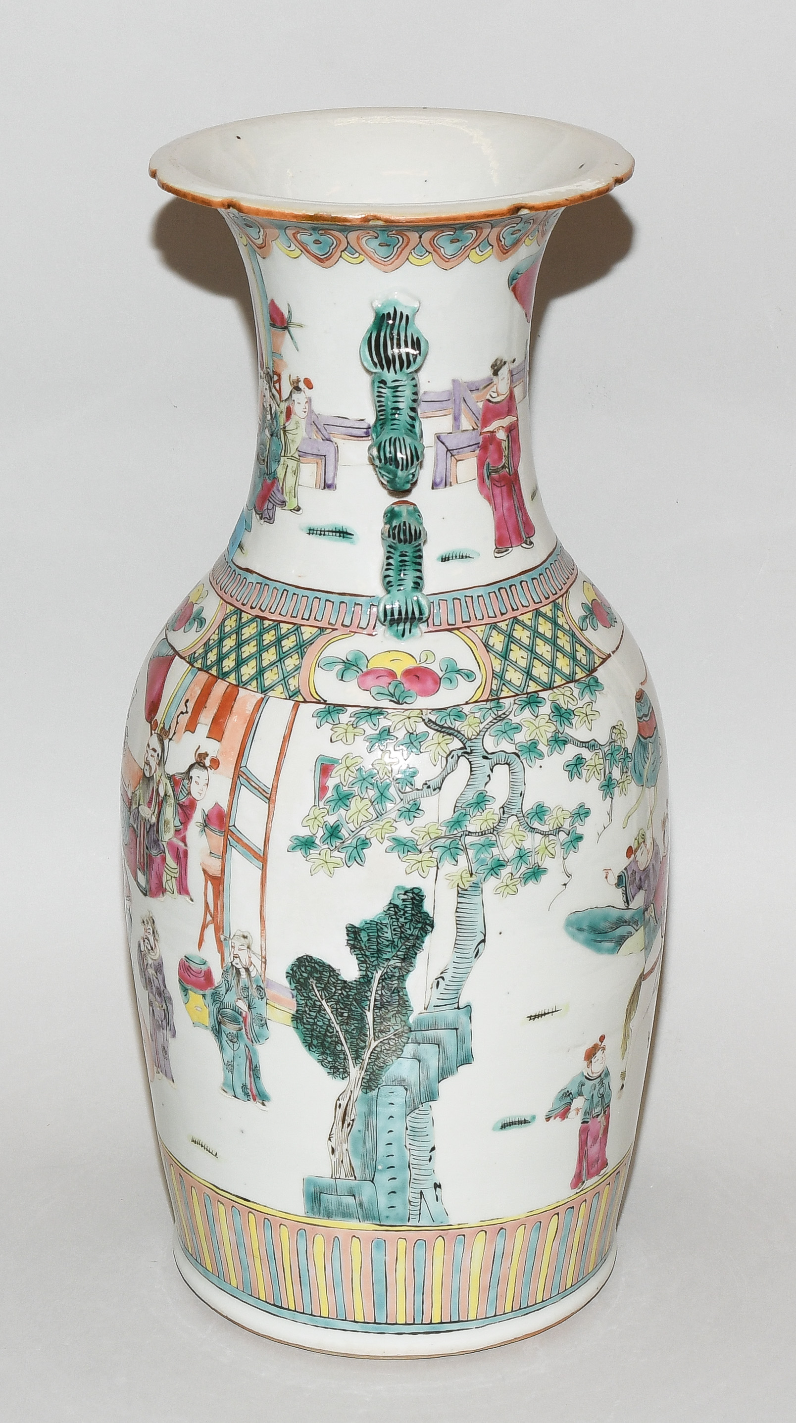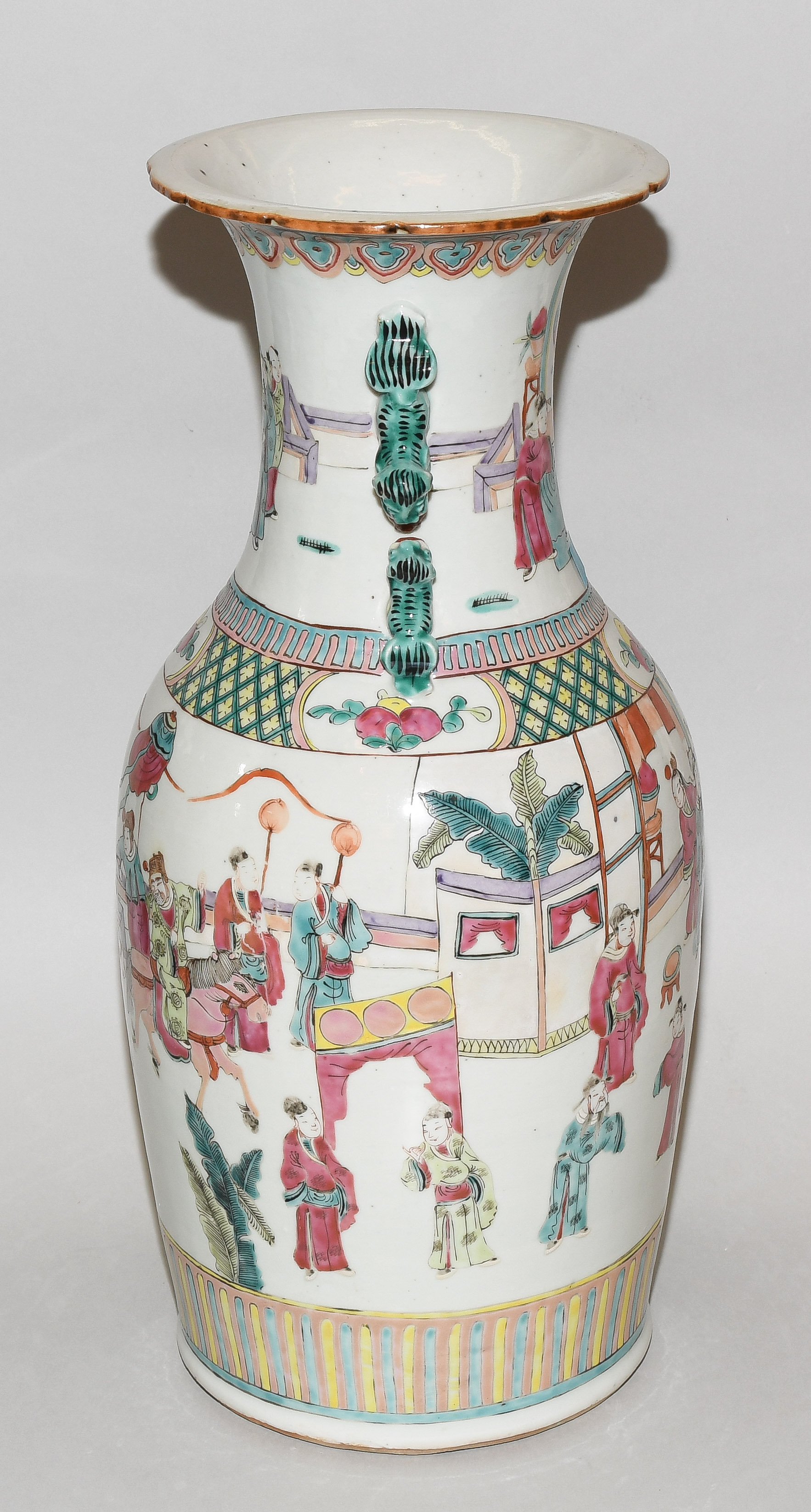 China, 20.Jh. Porzellan. Balusterform mit passig geschweiftem Rand. Polychrome figürliche Szene. Mit zwei plastischen Fo-Hunde-Handhaben. H 45,5 cm. - Schadstellen.