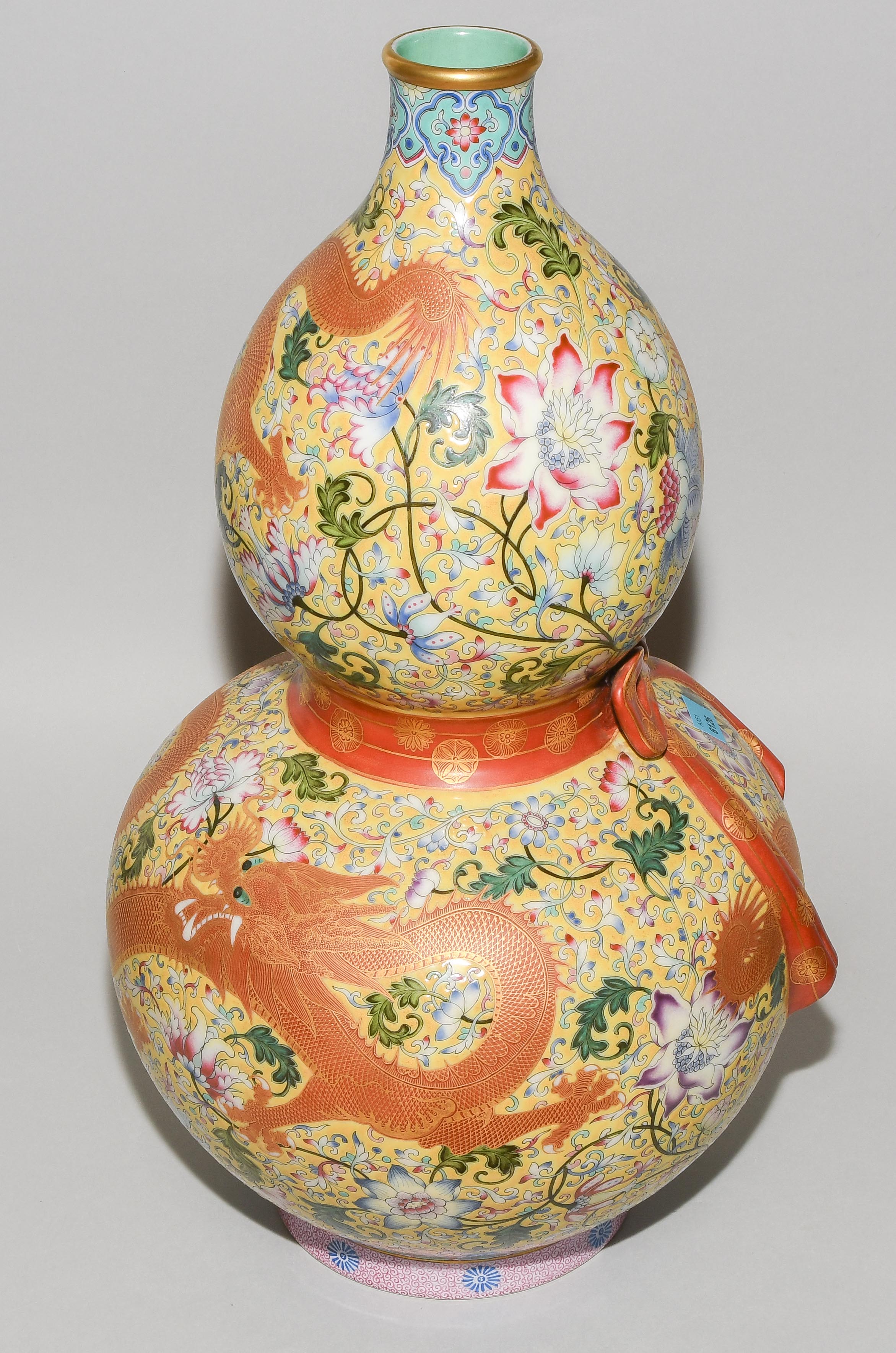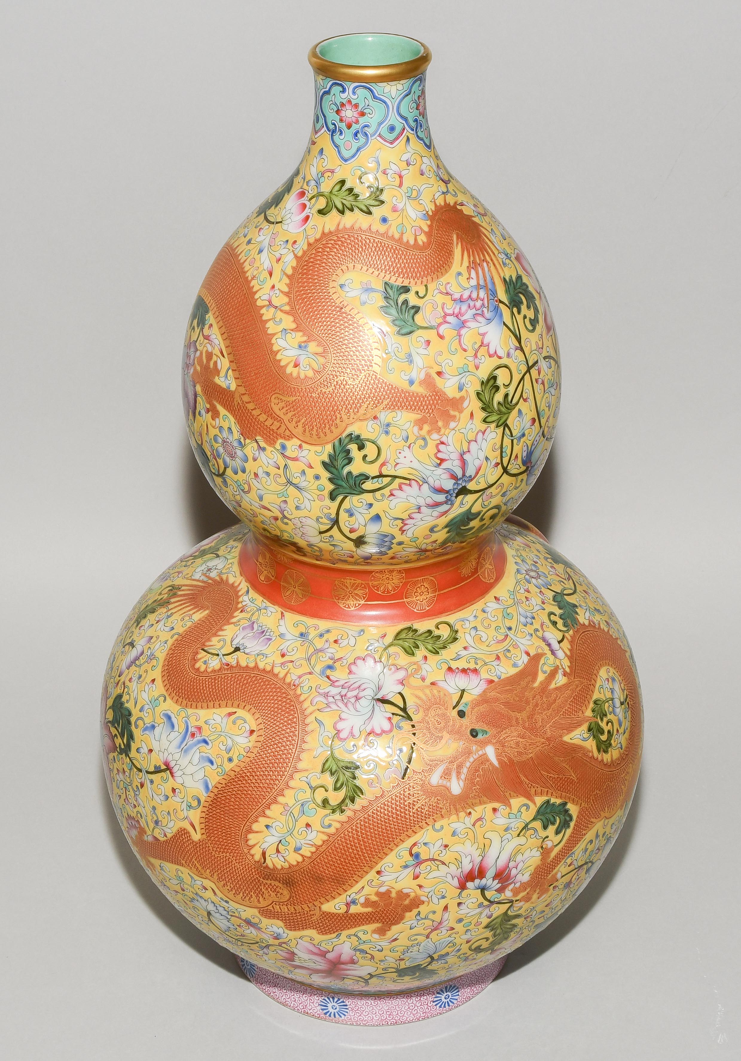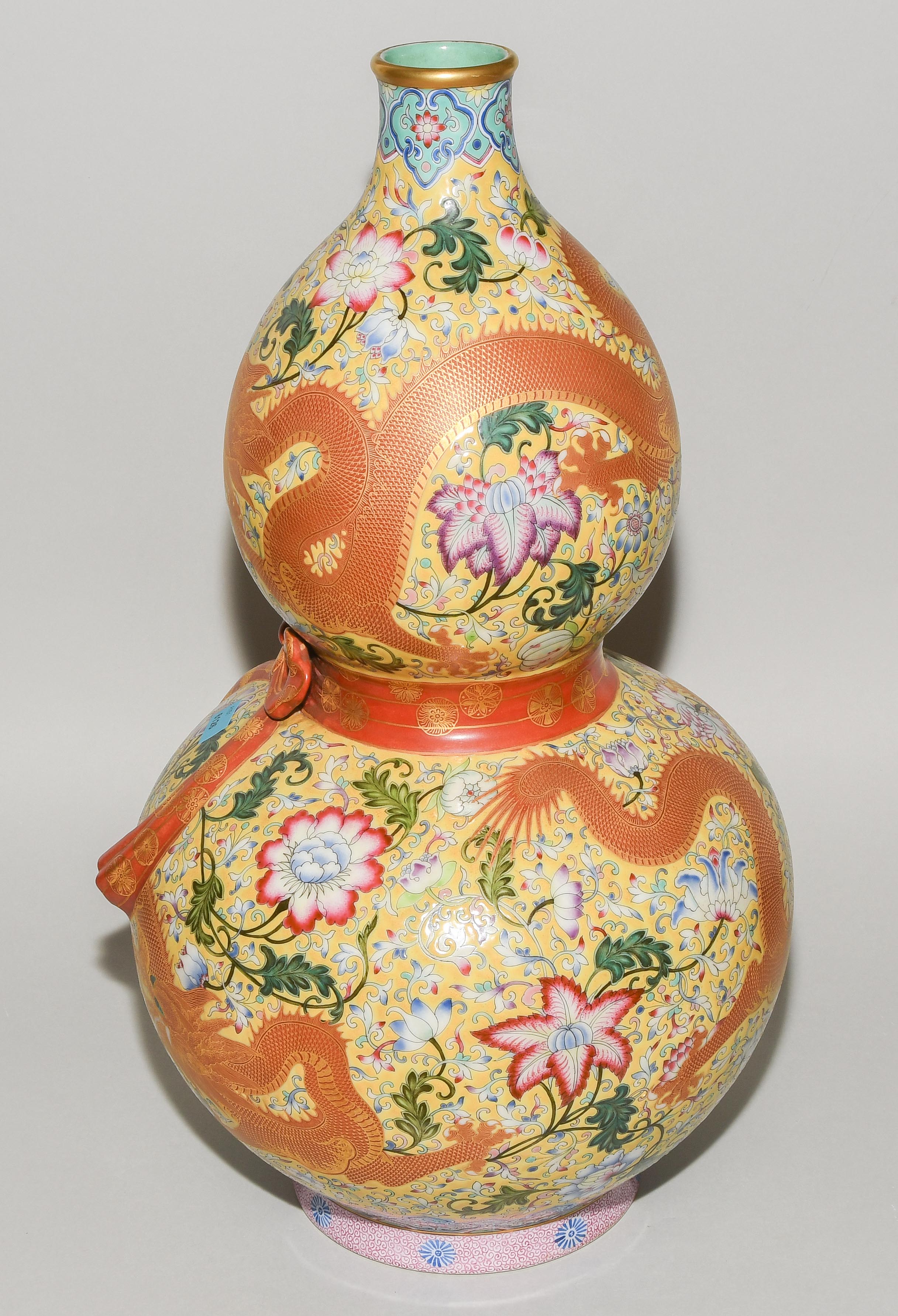 China, 2.Hälfte 20.Jh. Porzellan. Äusserst dekorative Vase in Kalebassenform mit eisenrotem Drachen sowie Blumendekor in Famille Rose auf gelbem Fond. H 47 cm