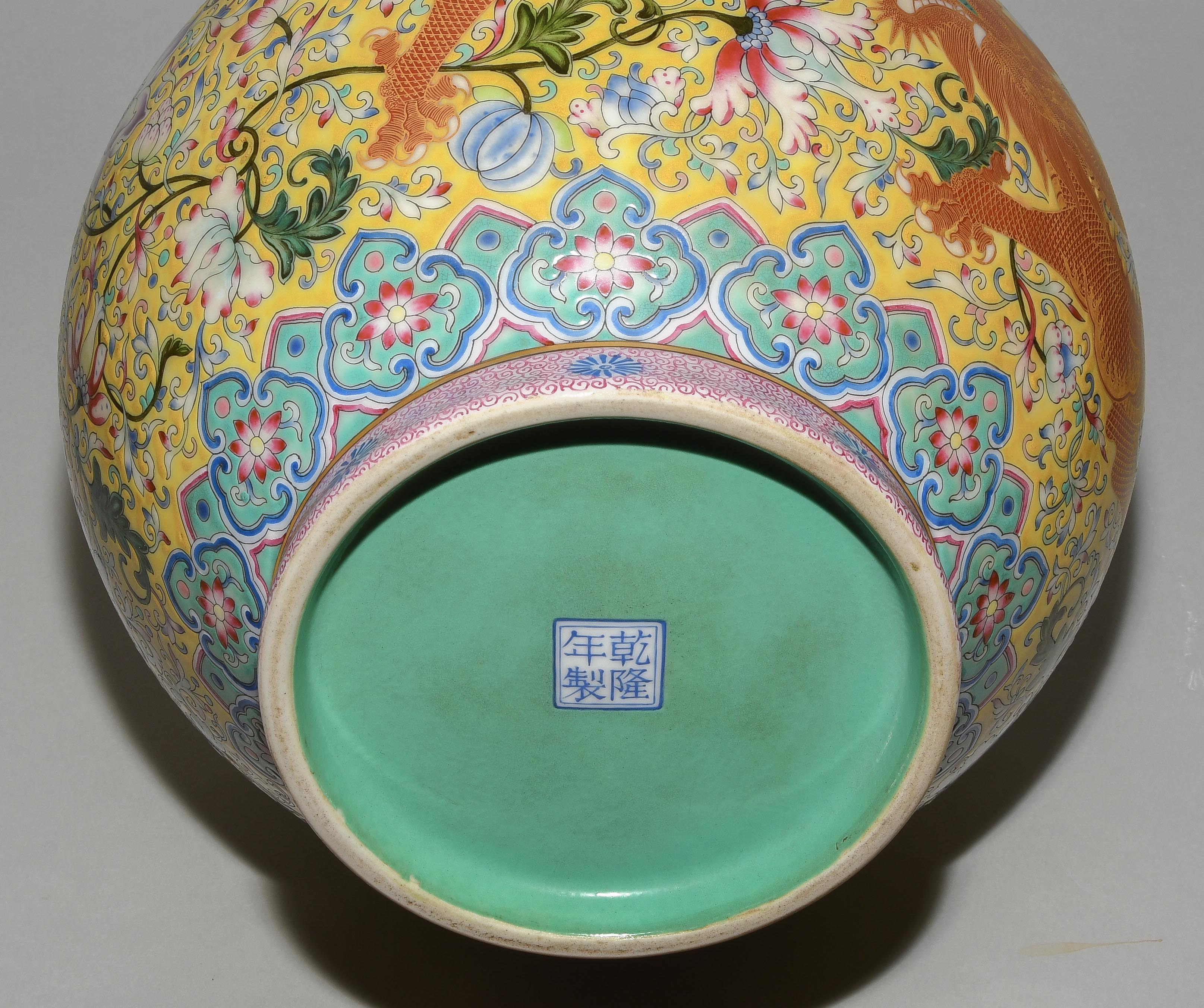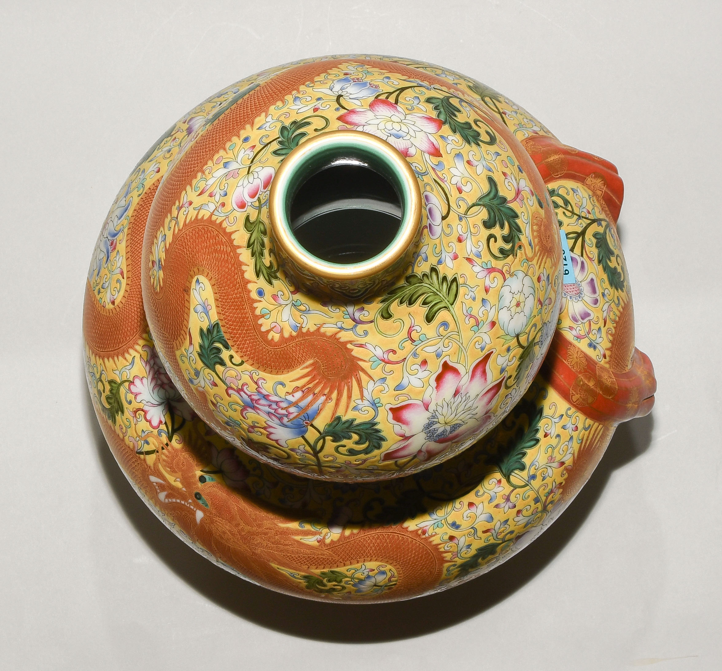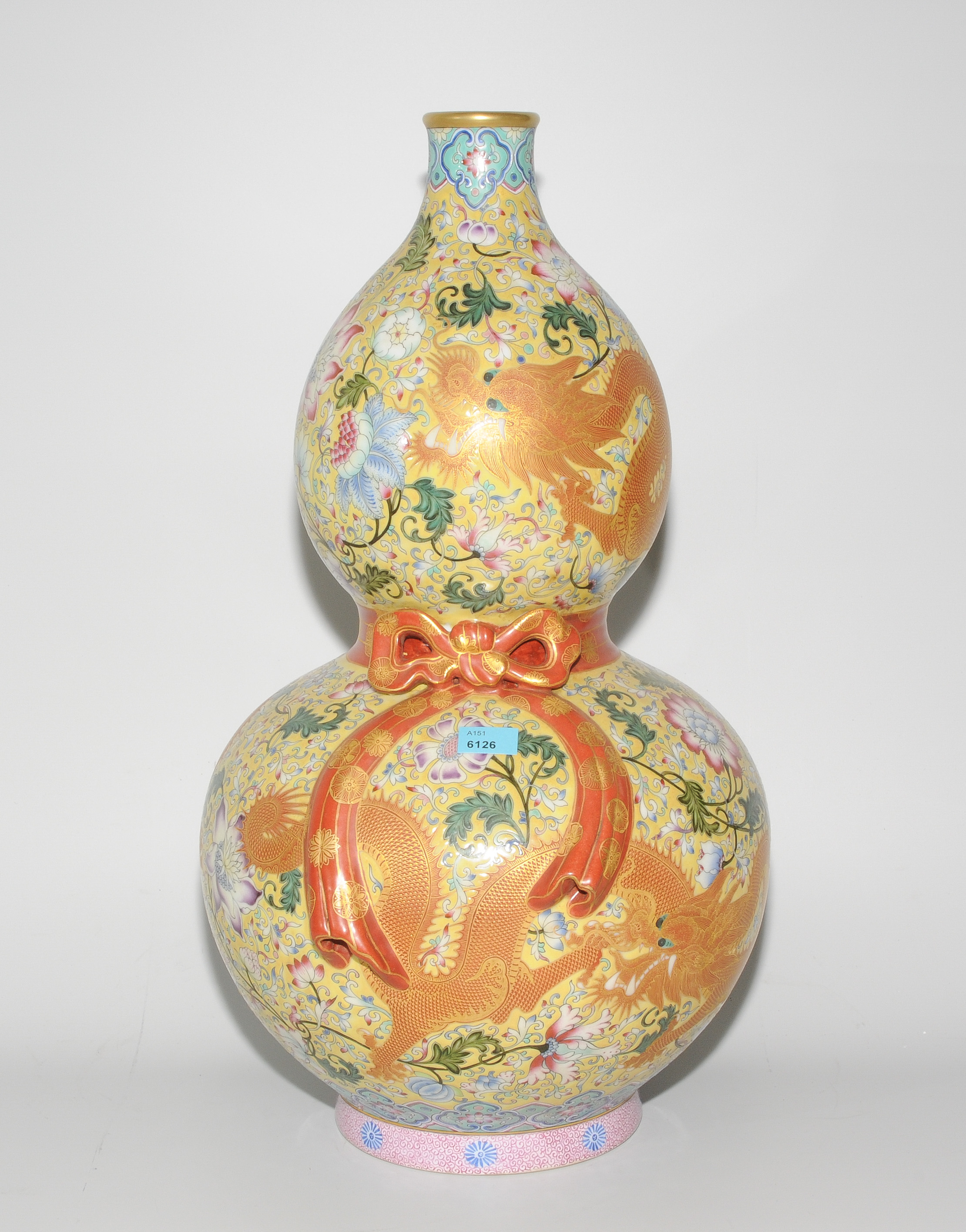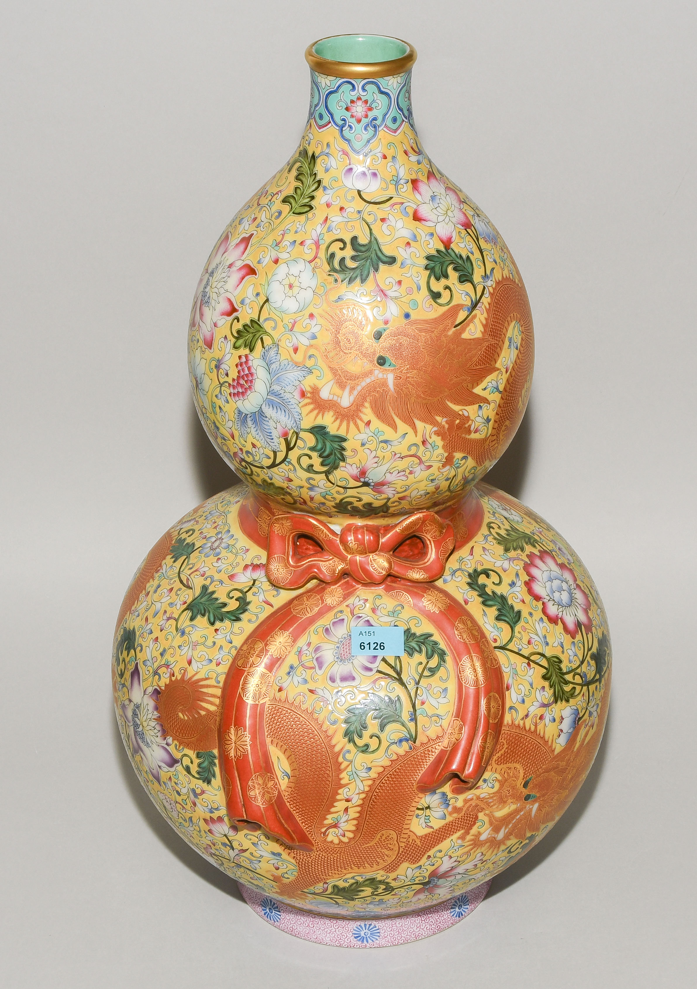 China, 2.Hälfte 20.Jh. Porzellan. Äusserst dekorative Vase in Kalebassenform mit eisenrotem Drachen sowie Blumendekor in Famille Rose auf gelbem Fond. H 47 cm