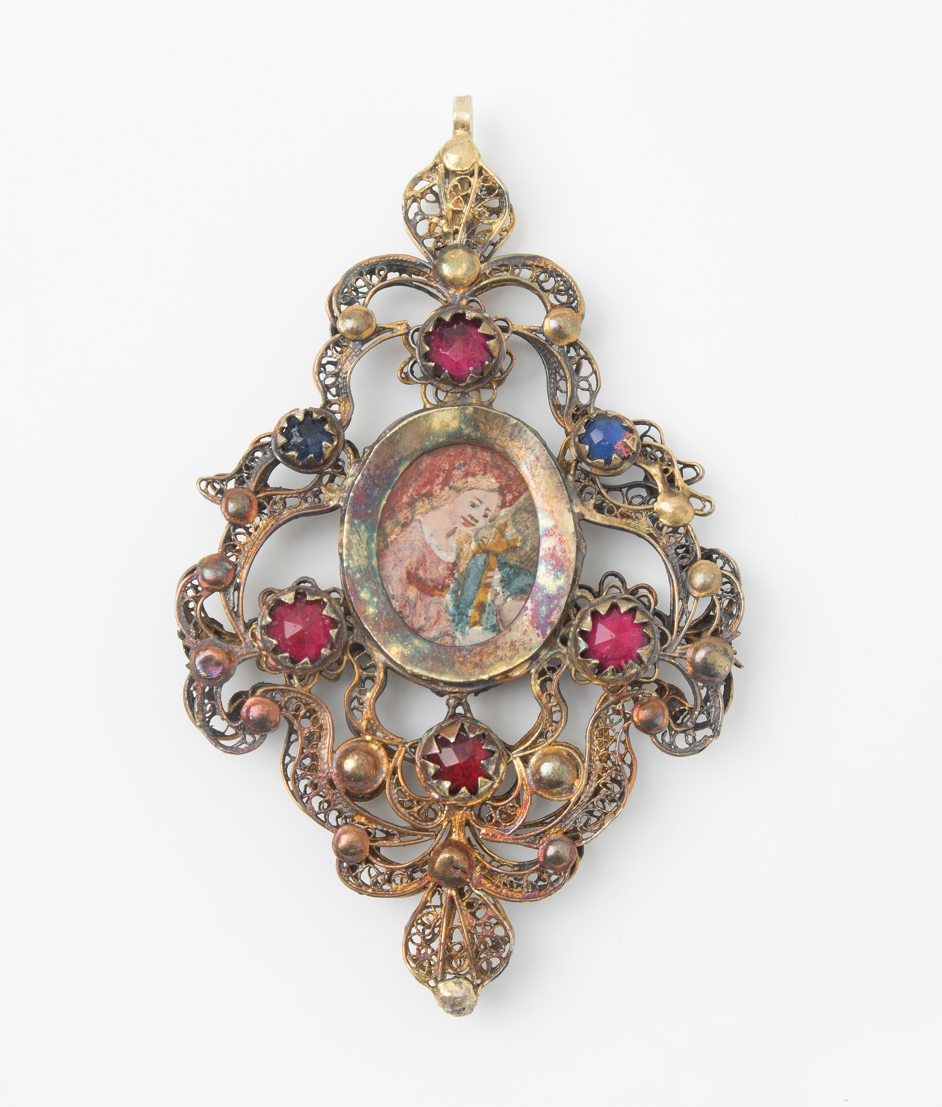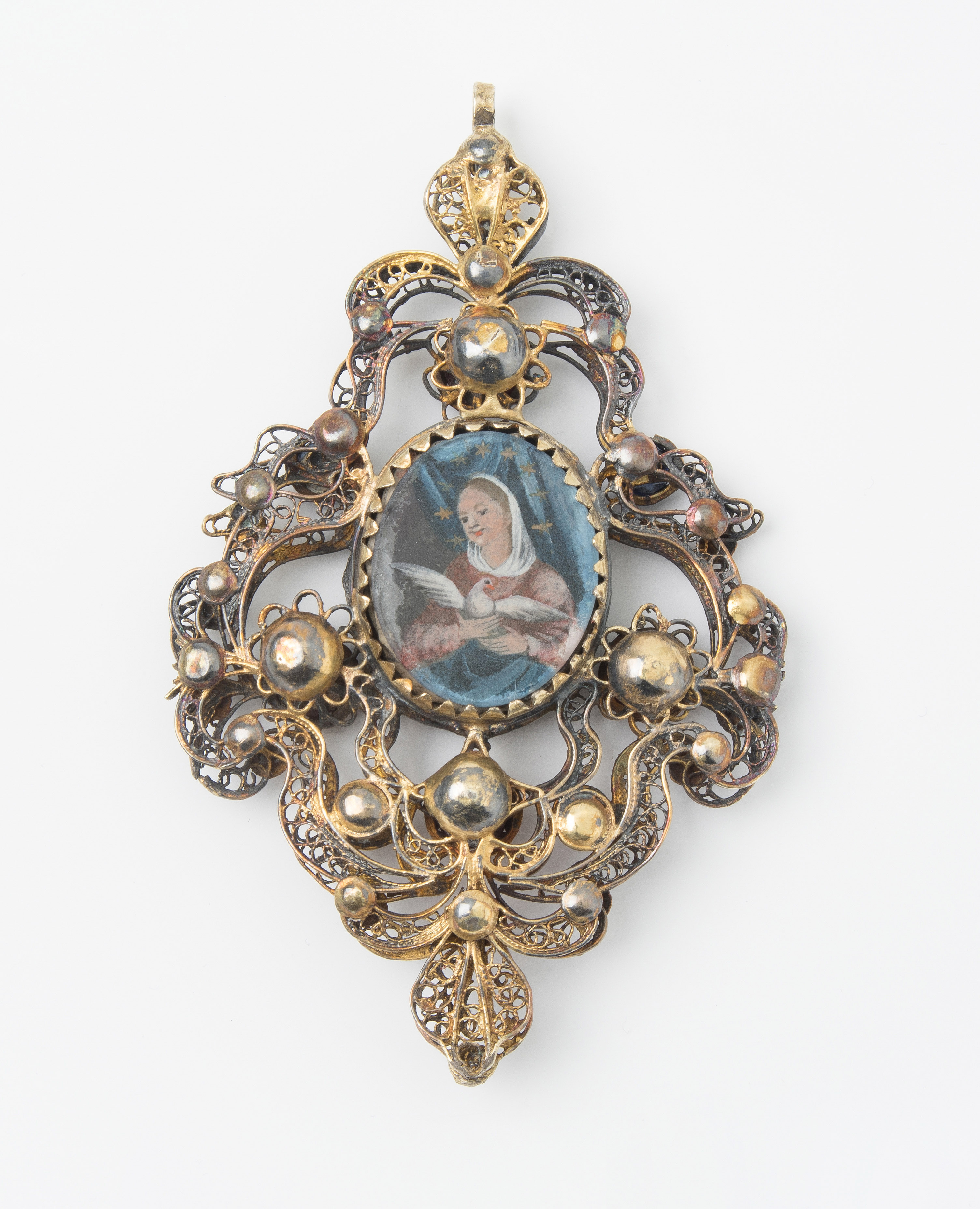 Luzern, um 1800. Silberfiligran, vergoldet. Schauseite mit farbigen Glassteinen geschmückt. Im Zentrum ovale Fassung mit zwei Einlagen. Maria mit Taube (Hinterglas) bzw. Heilige mit Taube (koloriertes Druckbildchen). L 10 cm.