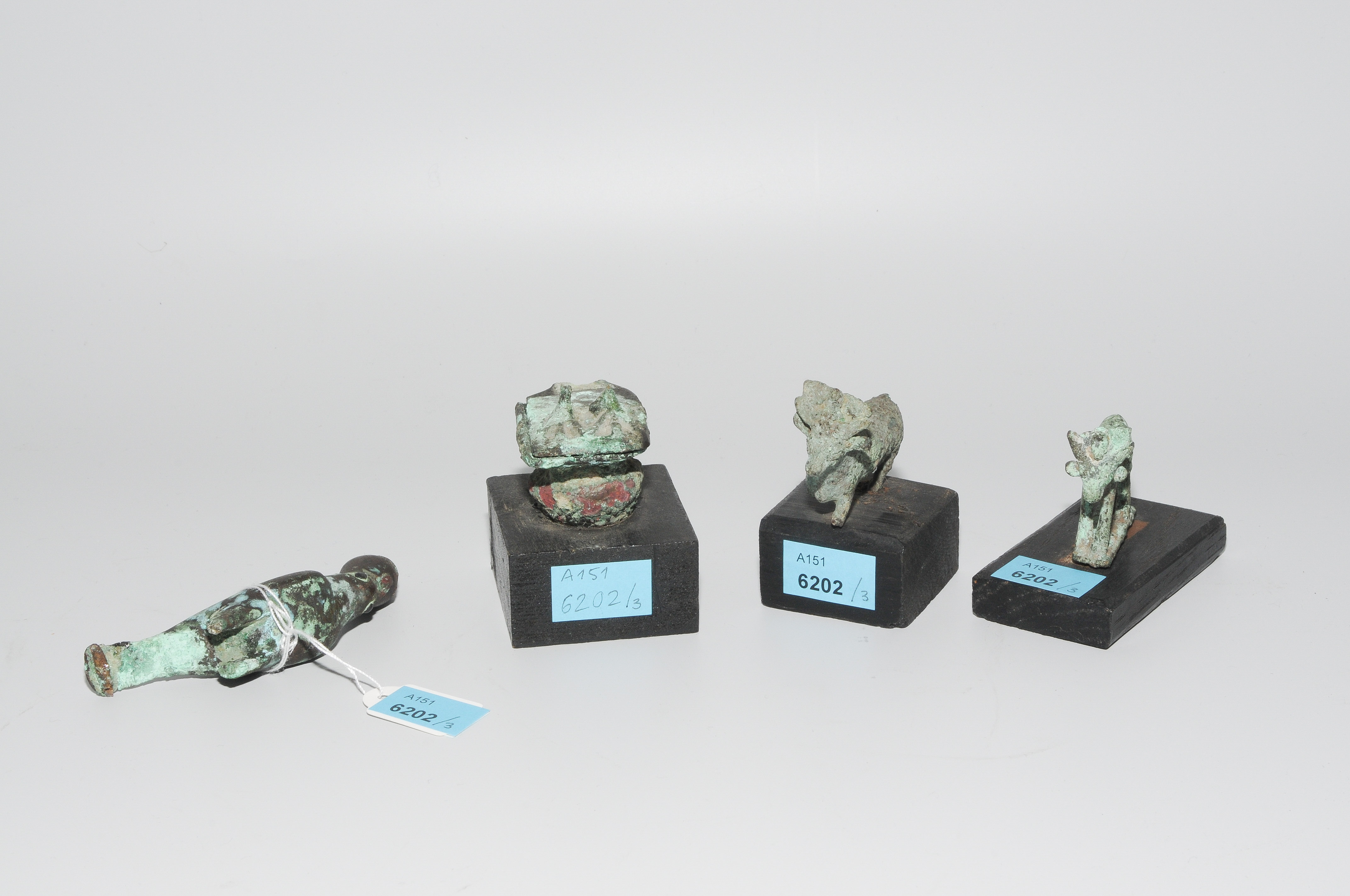 Aegypten, Spätzeit, 664–332 v.C. Bronze. Zwei Apissstiere. L 4,5 und 6. - Schadstellen. Horus mit der Krone Ober- und Unterägyptens. 11,5 cm. - Beine gebrochen, Fehlstellen.