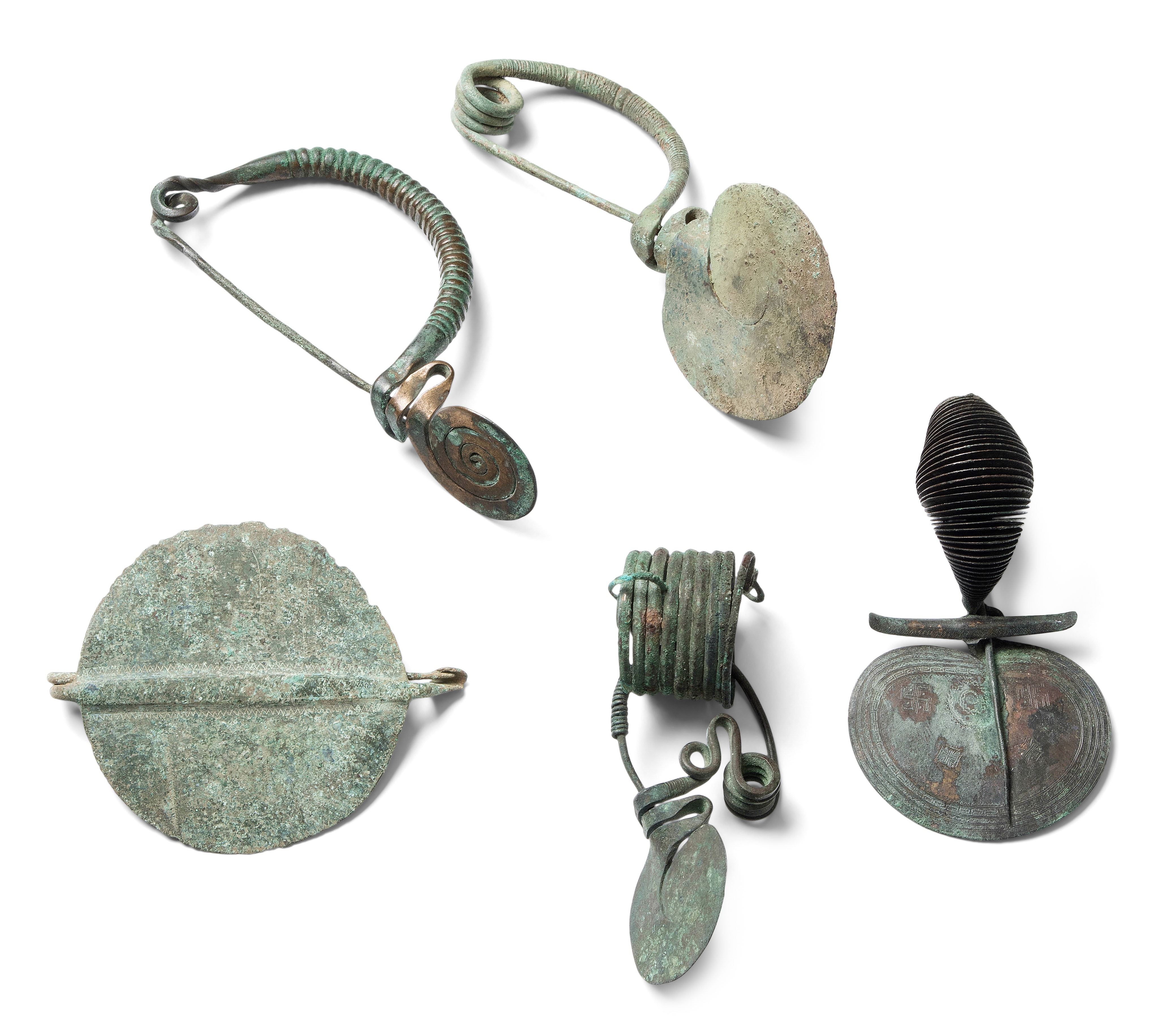Etruskisch, 9.–8.Jh. v.C. Bronze. Eine Bogenfibel mit Bügel in Form eines Sanguisuga-Bügels, aber bestehend aus vielen Bronzeplättchen, welche auf den Bügel aufgeschoben wurden. Der Diskusfuss ist graviert mit mehreren Bändern mit Mäander-, Zickzack- und Wellendekor am Rand und Innen mit Swastiken, Kreuzen und Spirale. L 12. / Zwei Bogenfibeln mit Fussdiskus mit dicht gerilltem Bogen. L 14,5. / Eine kleine Bogenfibel mit Fussdiskus mit Spiralring als Anhänger. L 9,5. / Scheibenfibel mit graviertem Zickzack-Muster. L 11 cm.
