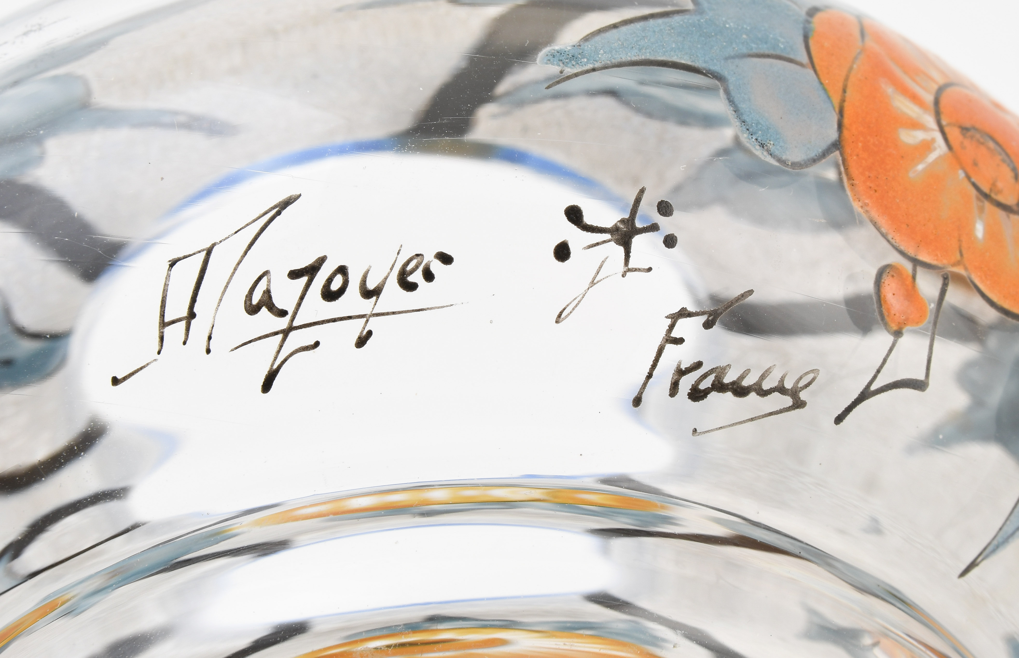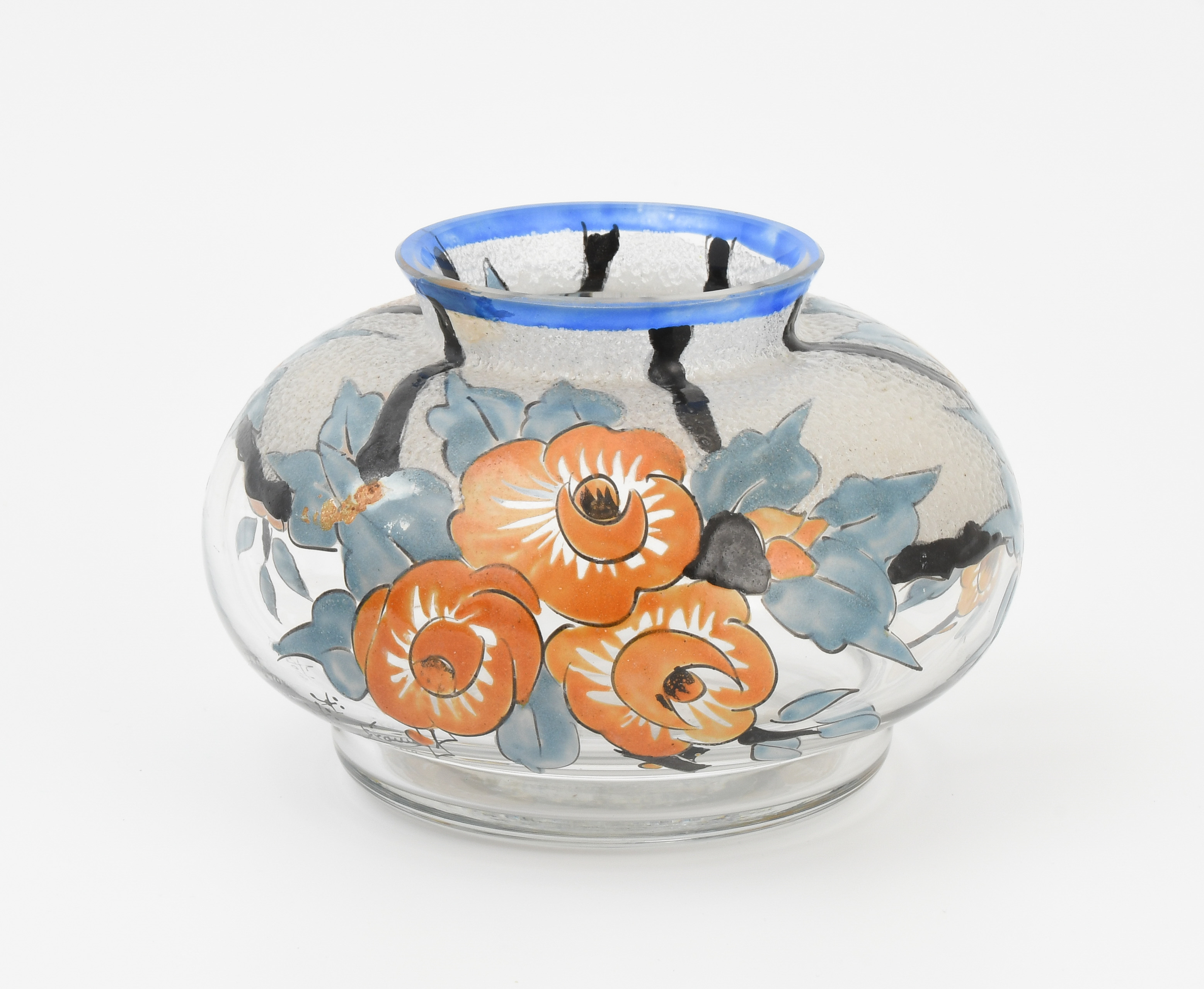 Moulins, um 1925. Vase. Farbloses Glas, partiell eisglasartig geätzt, stilisierter Blumendekor in opaker Emailmalerei. Bezeichnet: Mazoyer France, mit Mühle (gemalt). H 9,5 cm.