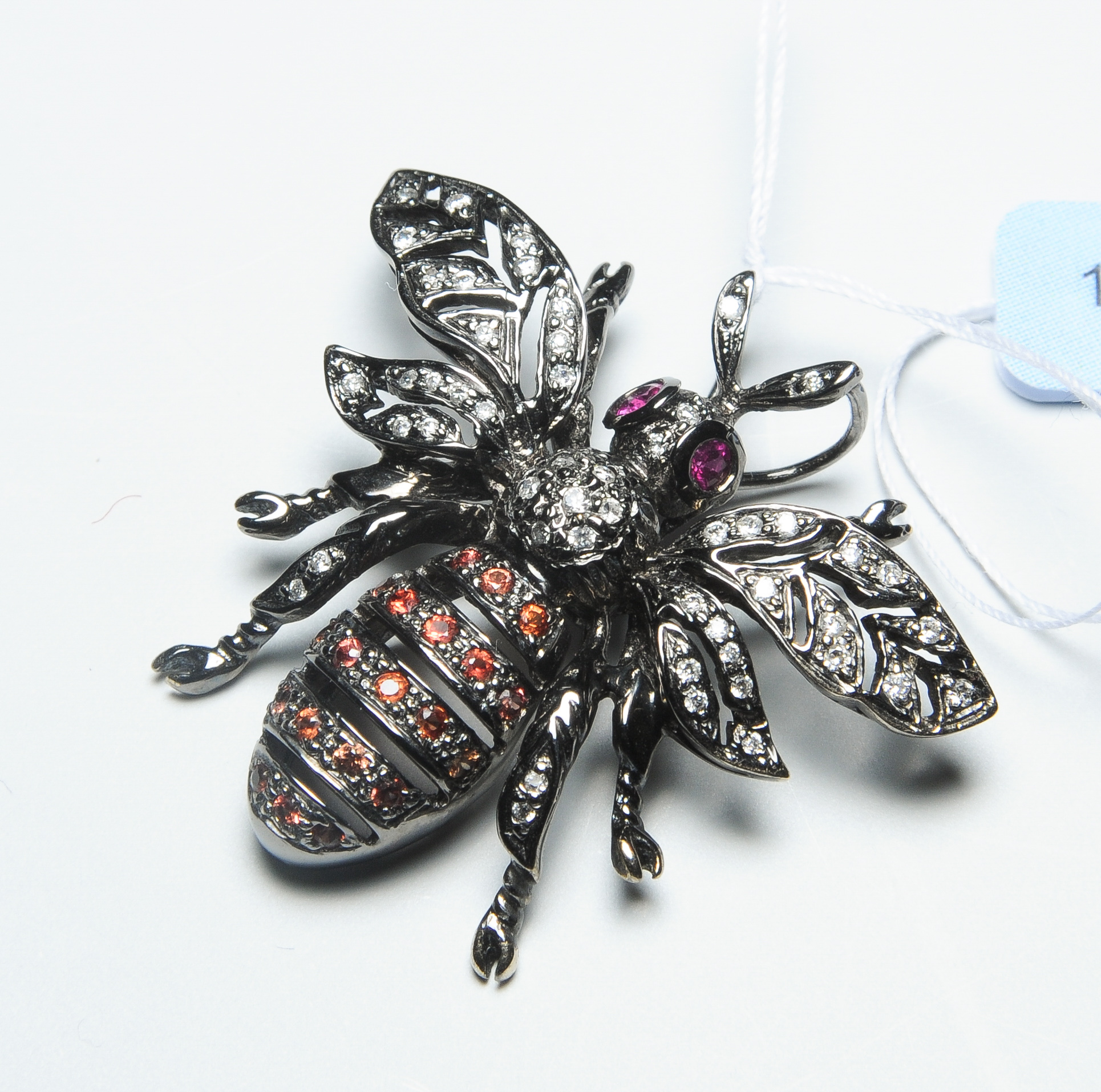 750 Weissgold schwarz rhodiniert. 51 Brillanten zus. ca. 0.20 ct und 20 Saphire zus. ca. 0.30 ct, 2 Rubin-Augen. 3,2x2,9 cm, 6,5 g.